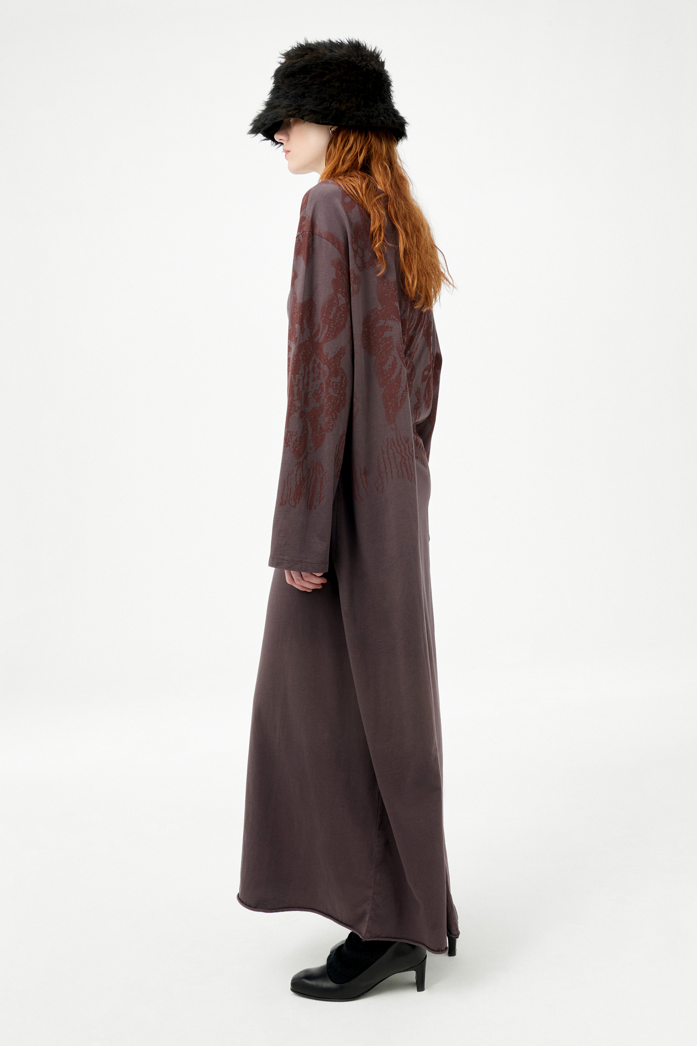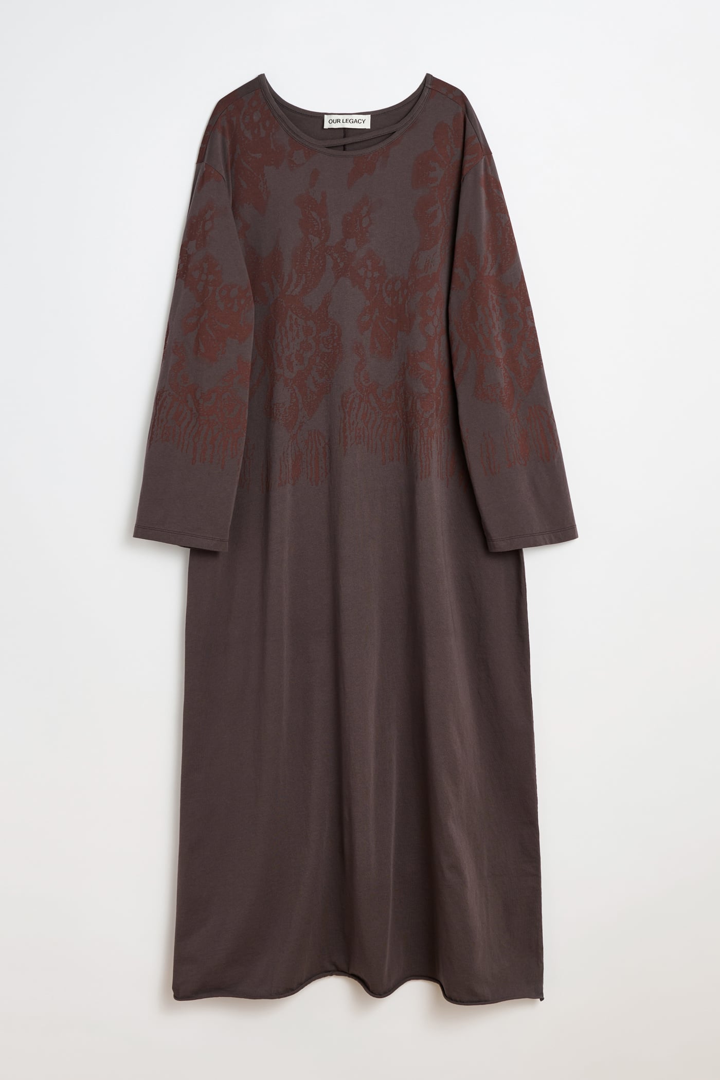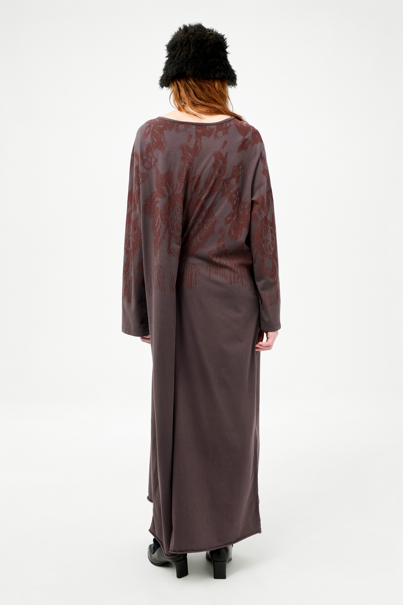 Our Covert Dress in Tasty Raisin Lace Stencil. Produced in Portuguese cotton jersey, the women's Covert Dress has an oversized, long T-shirt silhouette with a sculptural twist. The dress features two internal ties at the front and back that can be tied around the waist to pull the fabric in one direction, creating an asymmetric, cinched effect when used on one side. The design includes a raw edge hem and a thin ribbed double binding neckline with a front split.