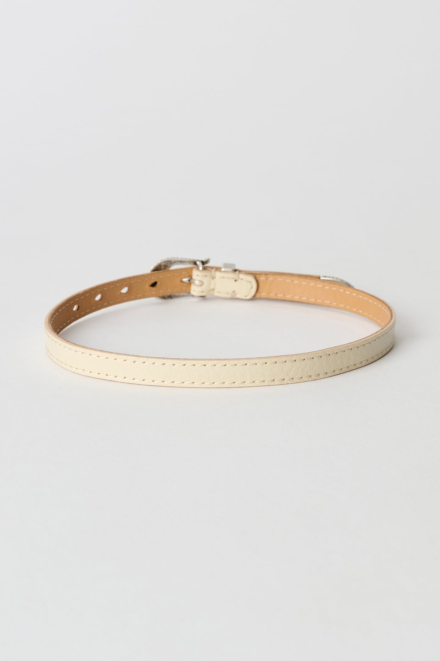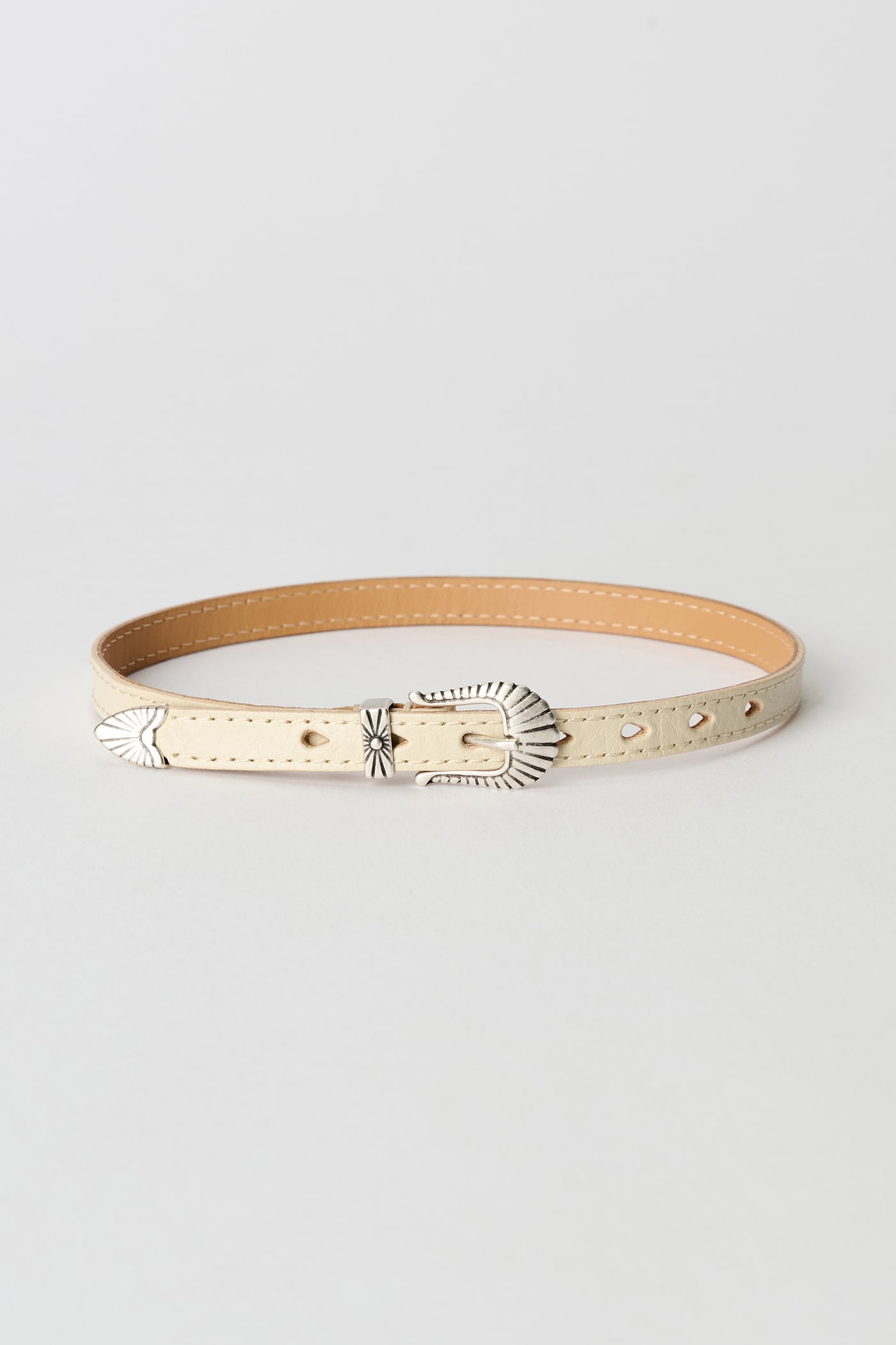Our Cowboy Wrap Around in Deep Ecru Leather. Produced in Italian cow leather that has been vegetable-tanned with a full grain finish, this slim 10 mm wrap-around belt features an engraved metal pin buckle, an engraved metal tip and a single keeper, and is delivered with a dust bag.