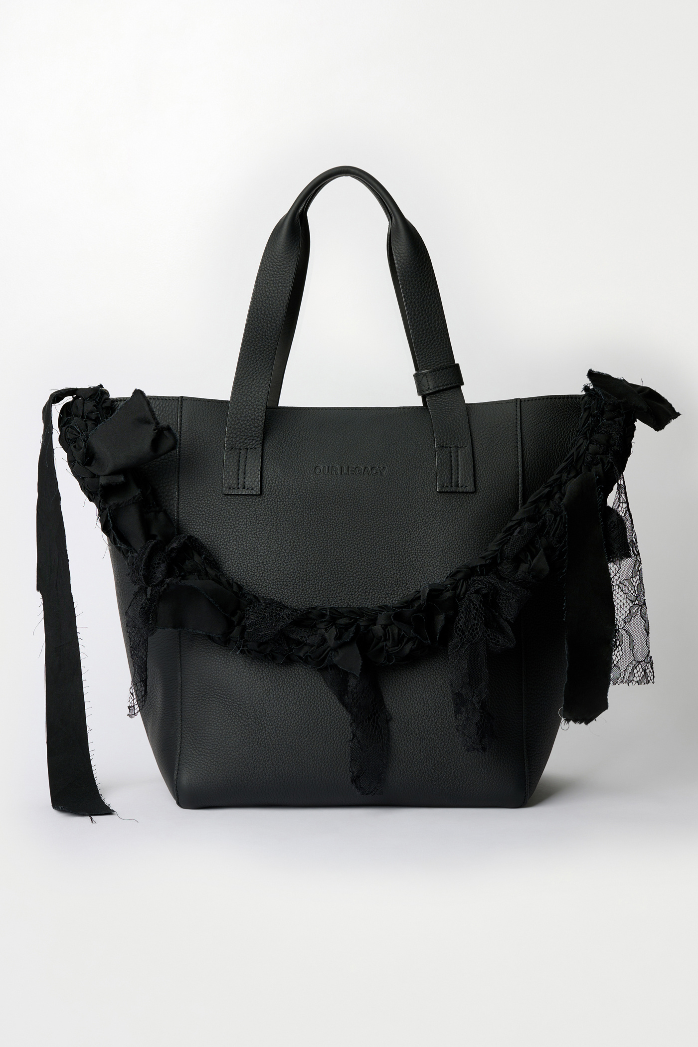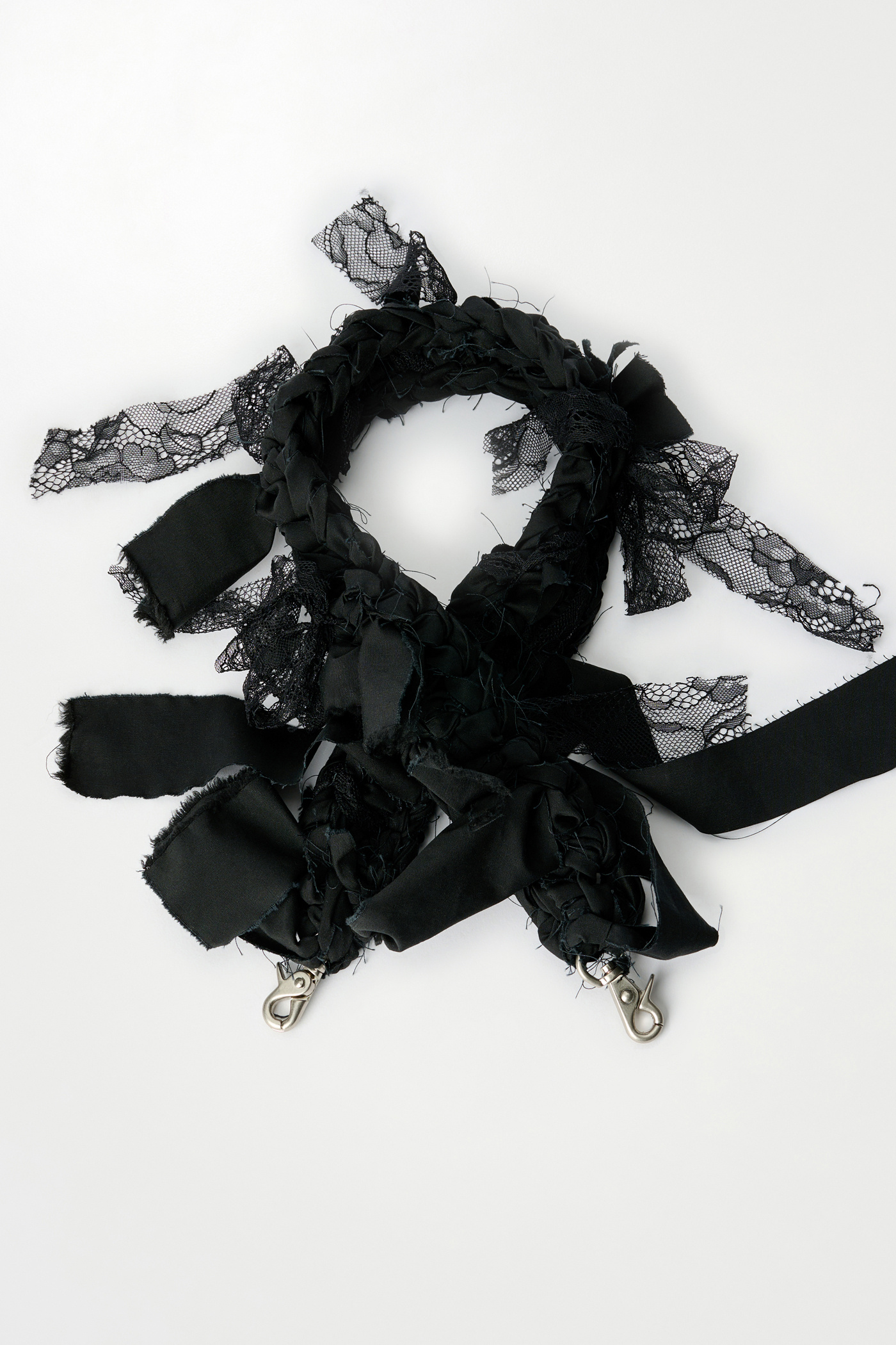 Our Crochet Strap in Deep Black Lace. Hand crocheted in Stockholm by artisan Sarah Murkes, all straps are made from collection leftovers such as Our Legacy shirting, jersey, denim, nylon and silk making every piece unique. The fabrics are torn apart to create the ”fabric-strips” which are then used to assemble the straps.