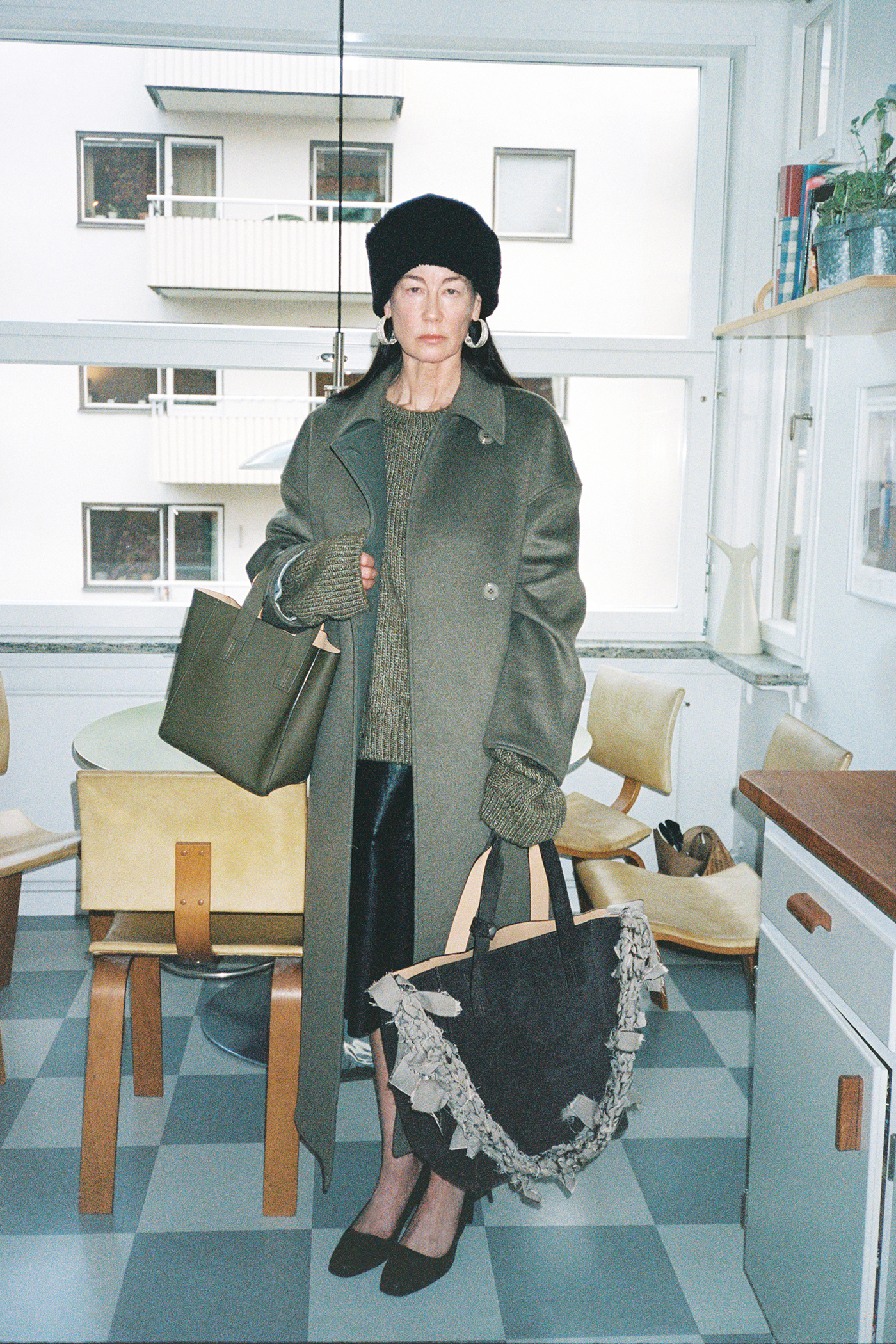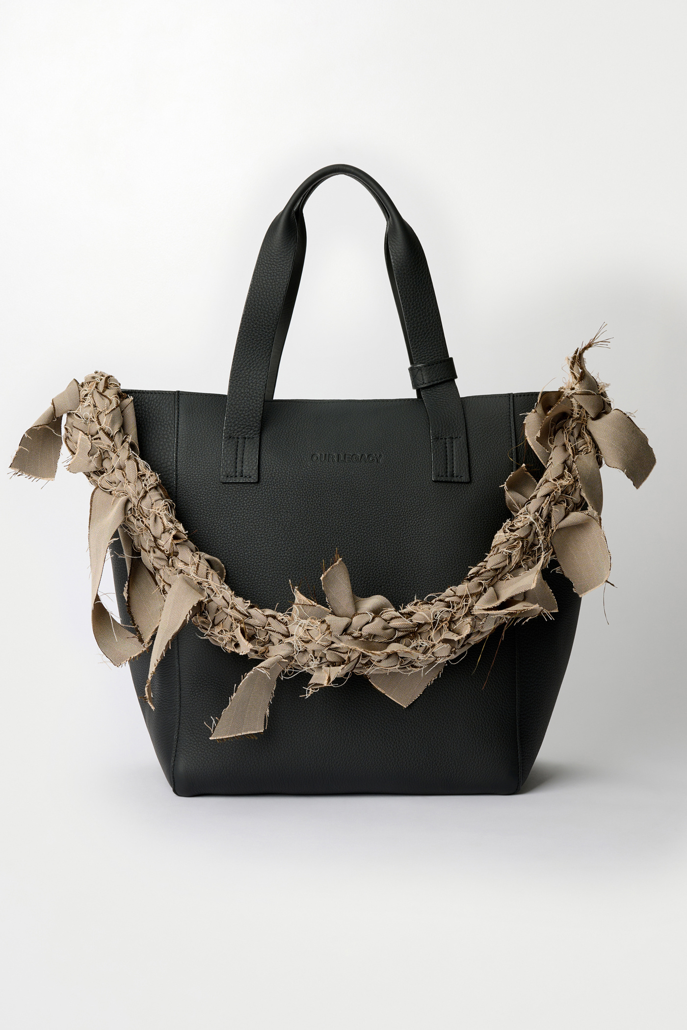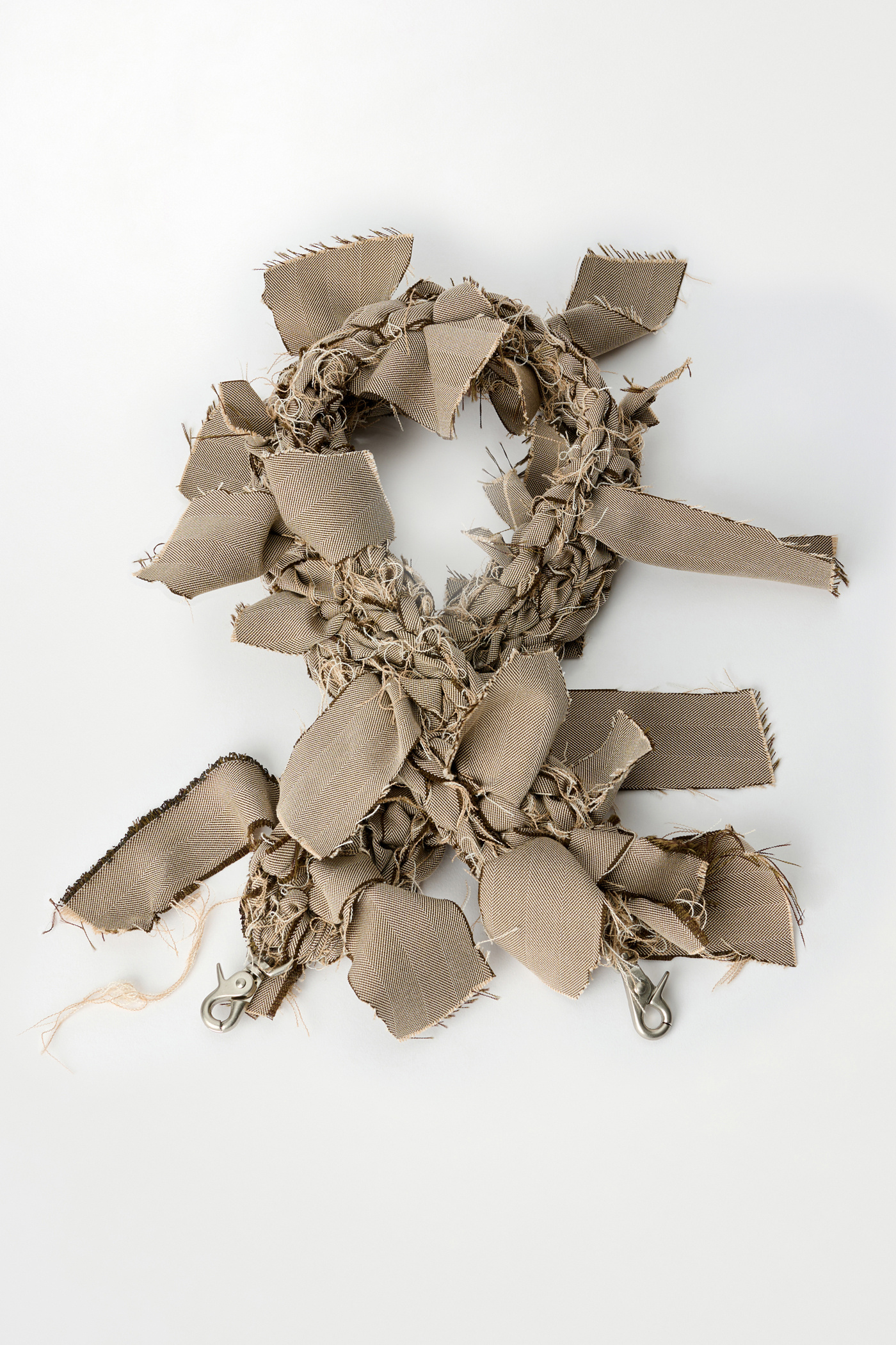 Our Crochet Strap in Khaki Herringbone. Hand crocheted in Stockholm by artisan Sarah Murkes, all straps are made from collection leftovers such as Our Legacy shirting, jersey, denim, nylon and silk making every piece unique. The fabrics are torn apart to create the ”fabric-strips” which are then used to assemble the straps.