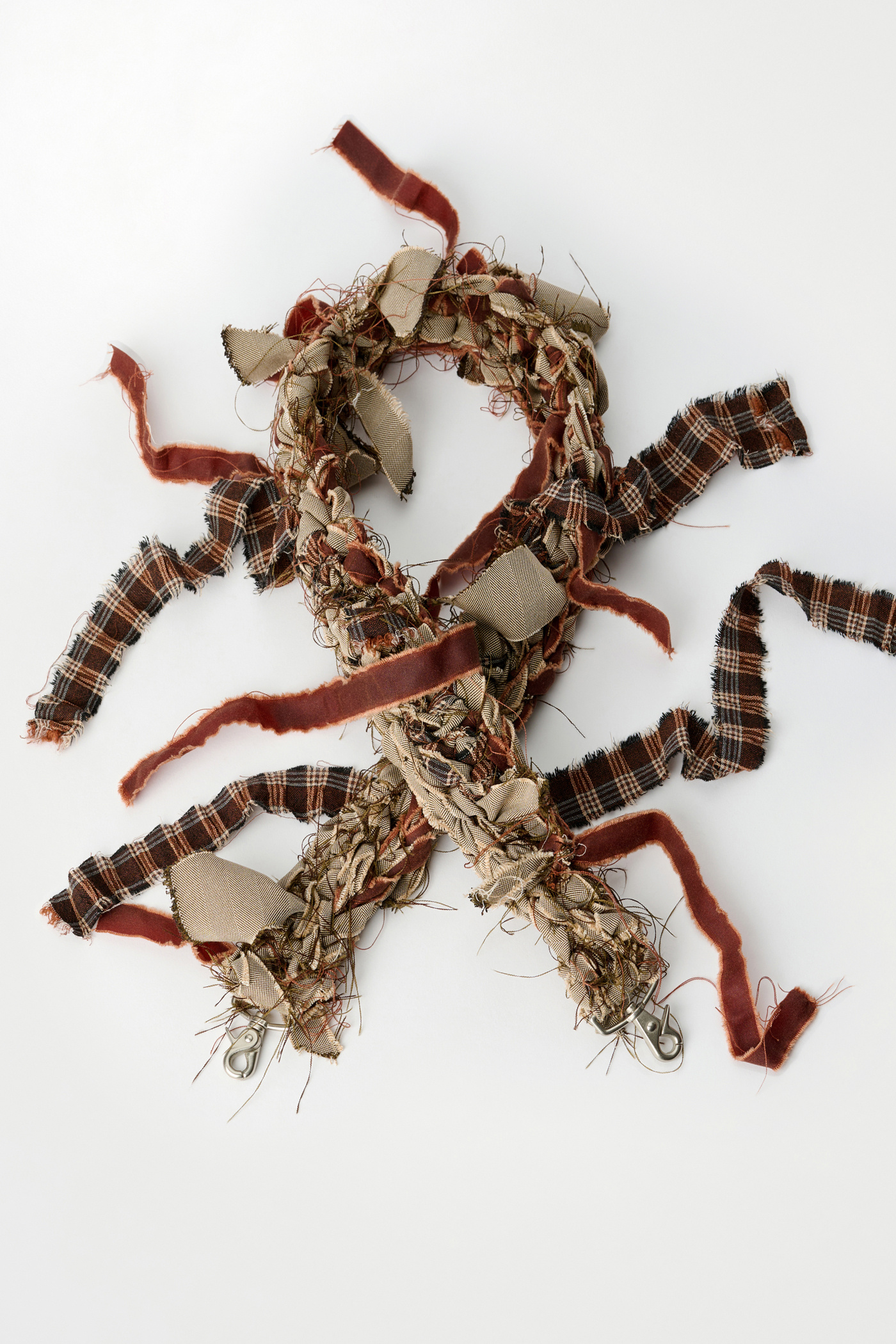 Our Crochet Strap in Khaki Oxblood Herringbone. Hand crocheted in Stockholm by artisan Sarah Murkes, all straps are made from collection leftovers such as Our Legacy shirting, jersey, denim, nylon and silk making every piece unique. The fabrics are torn apart to create the ”fabric-strips” which are then used to assemble the straps.