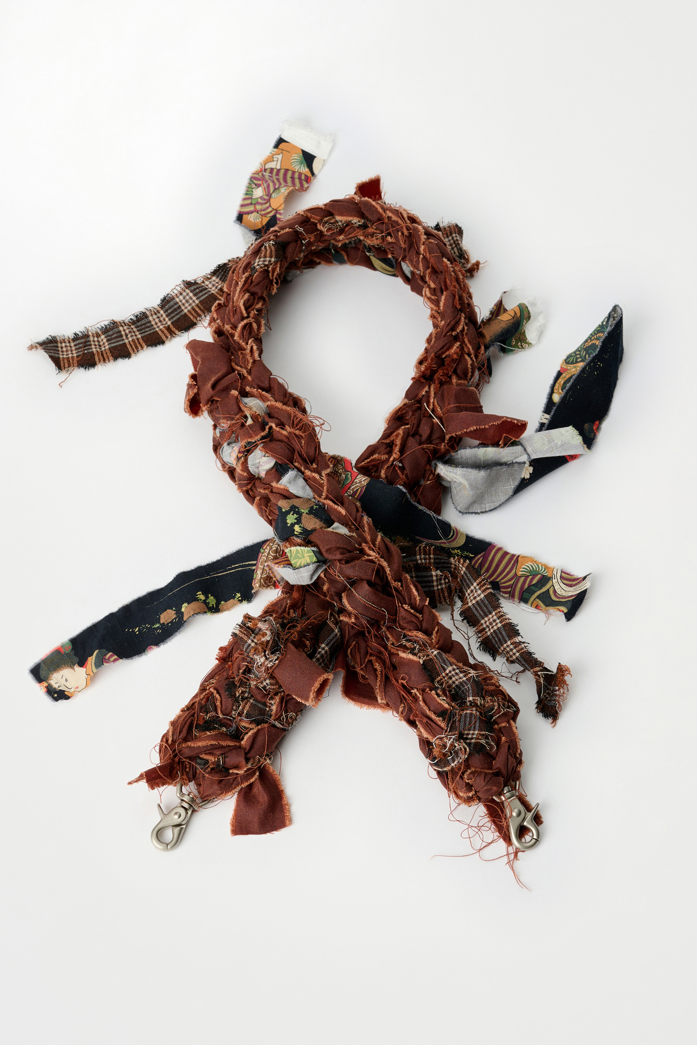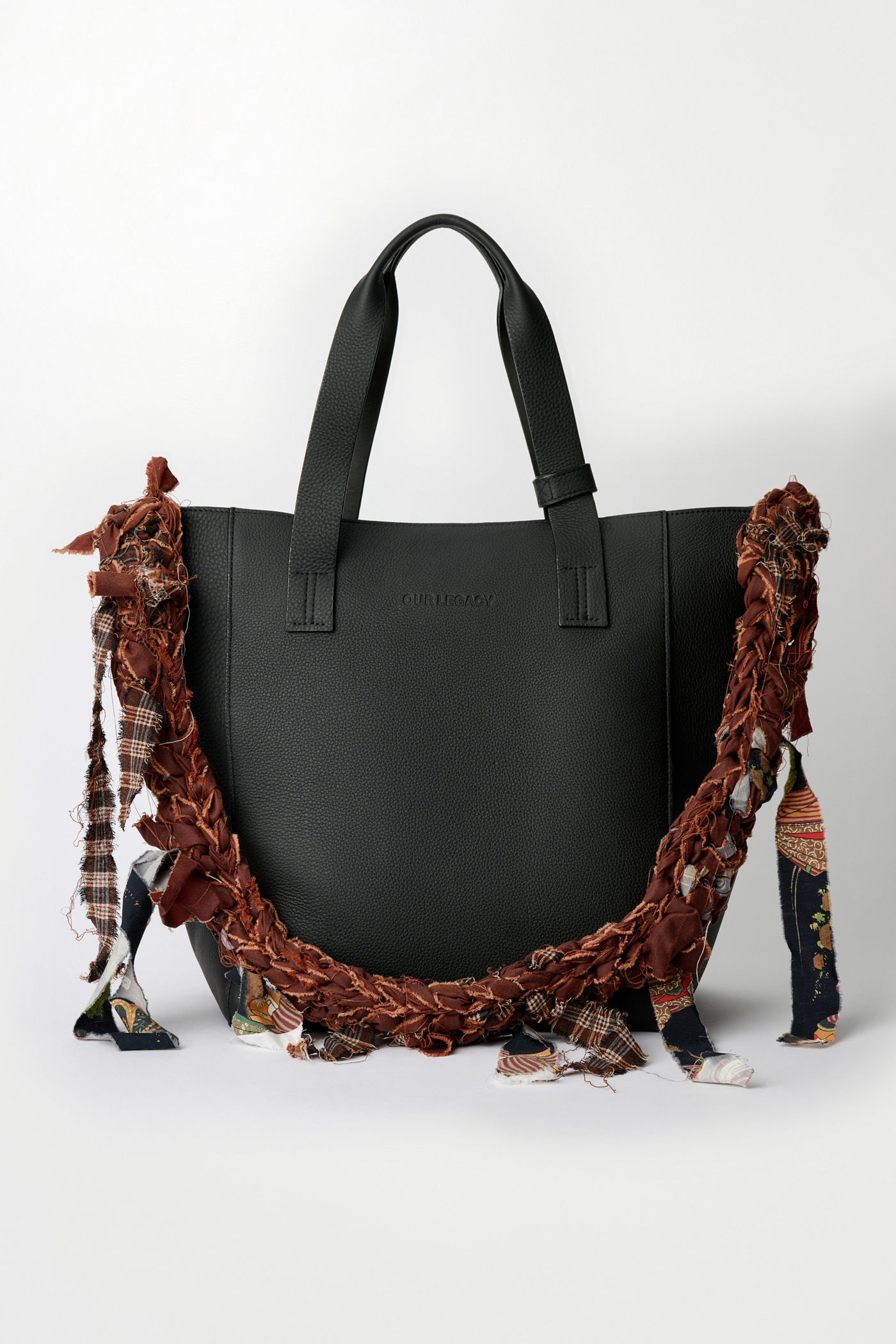 Our Crochet Strap in Oxblood Everwax. Hand crocheted in Stockholm by artisan Sarah Murkes, all straps are made from collection leftovers such as Our Legacy shirting, jersey, denim, nylon and silk making every piece unique. The fabrics are torn apart to create the ”fabric-strips” which are then used to assemble the straps.