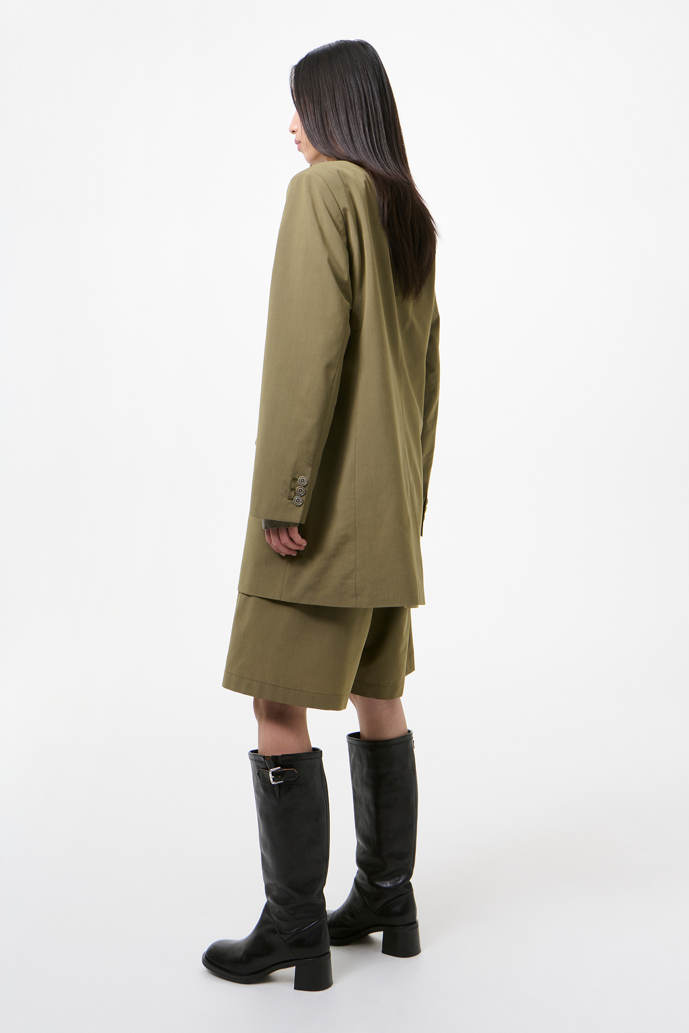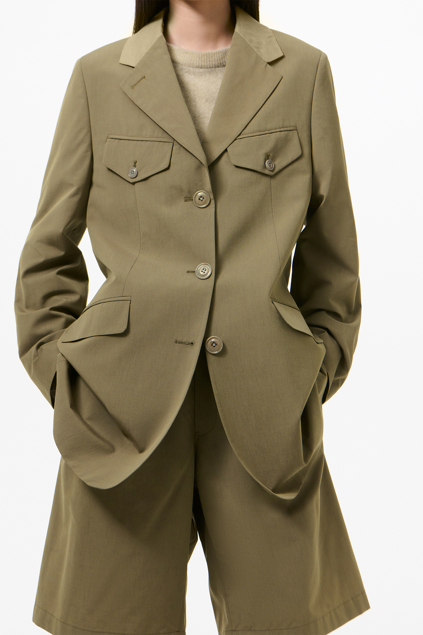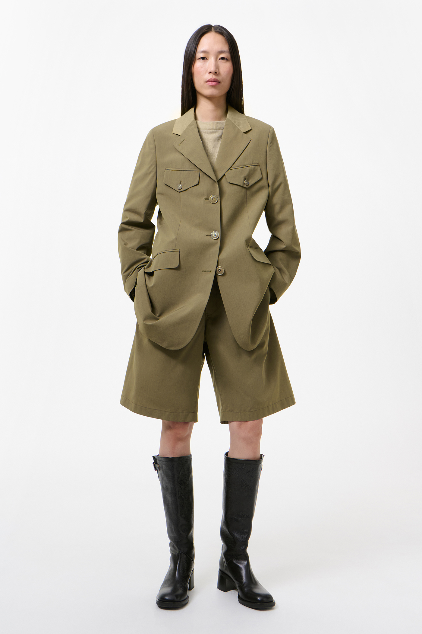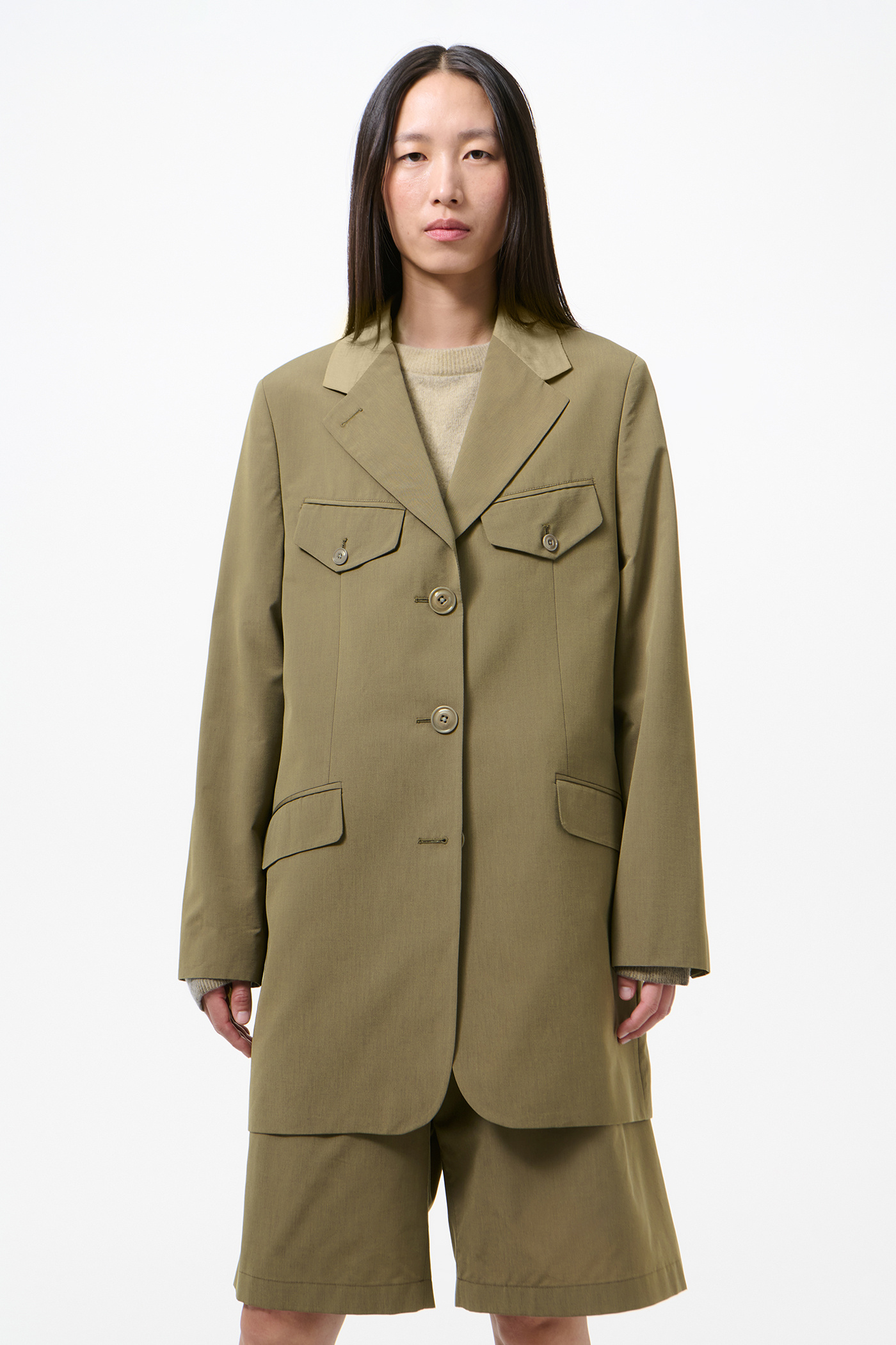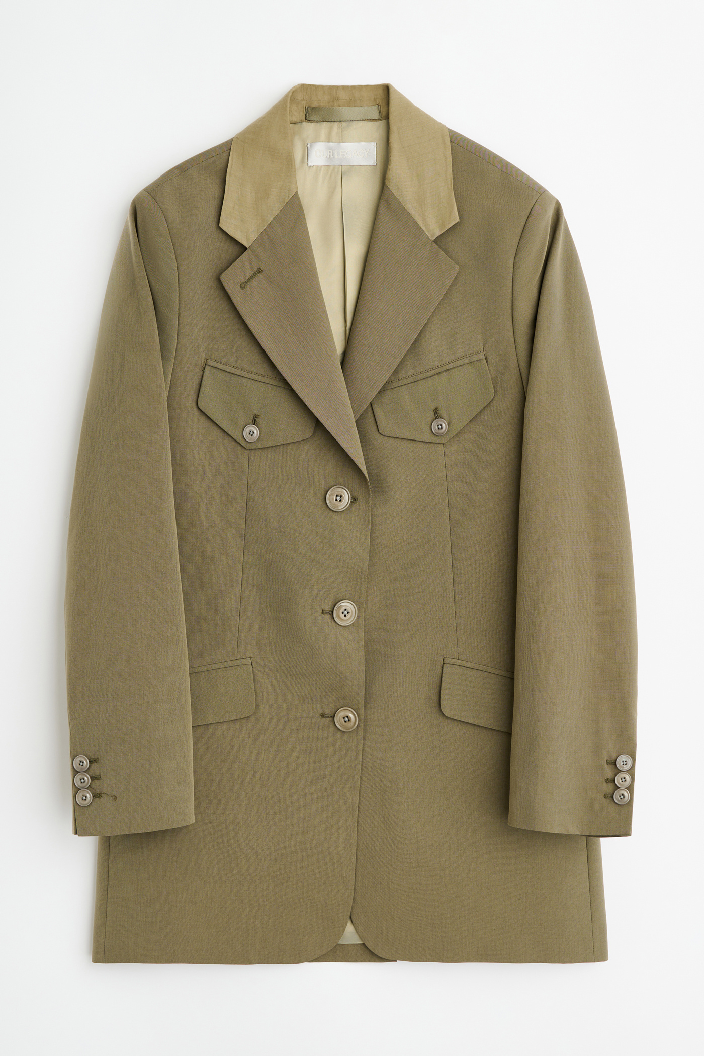 Our Cruise Blazer in Dry Leaf Balance Woolcot. Produced in an Italian virgin wool and cotton blend fabric, the Cruise Blazer has an elongated, boxy fit with a constructed shoulder and shoulder pad for a strict, sharp look. It features angled front pockets with top flaps inspired by military blazers, a doubled top collar in contrast semi-sheer cotton, and darts for shape. Fully lined and finished with corozo buttons, the blazer includes two internal jet pockets.