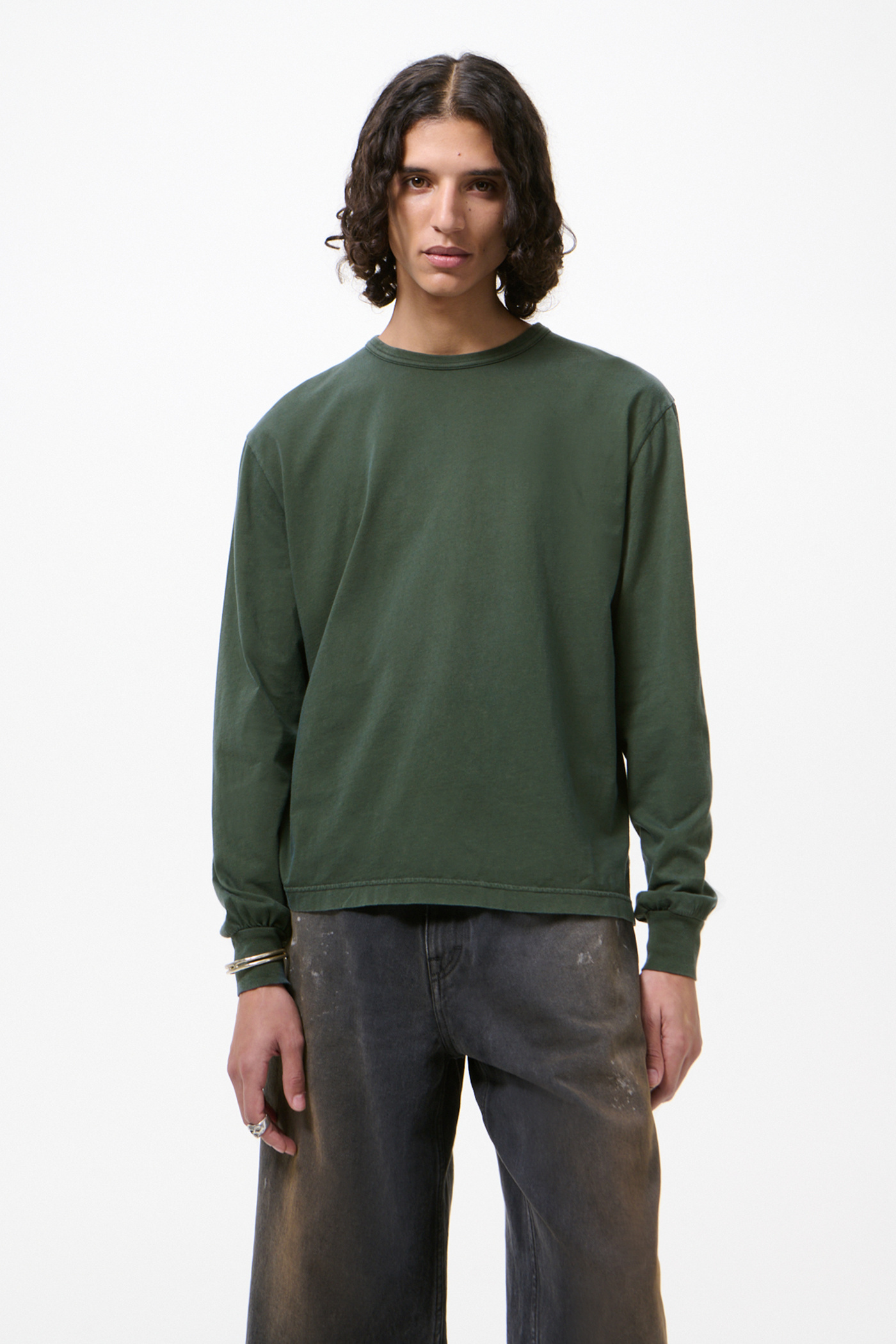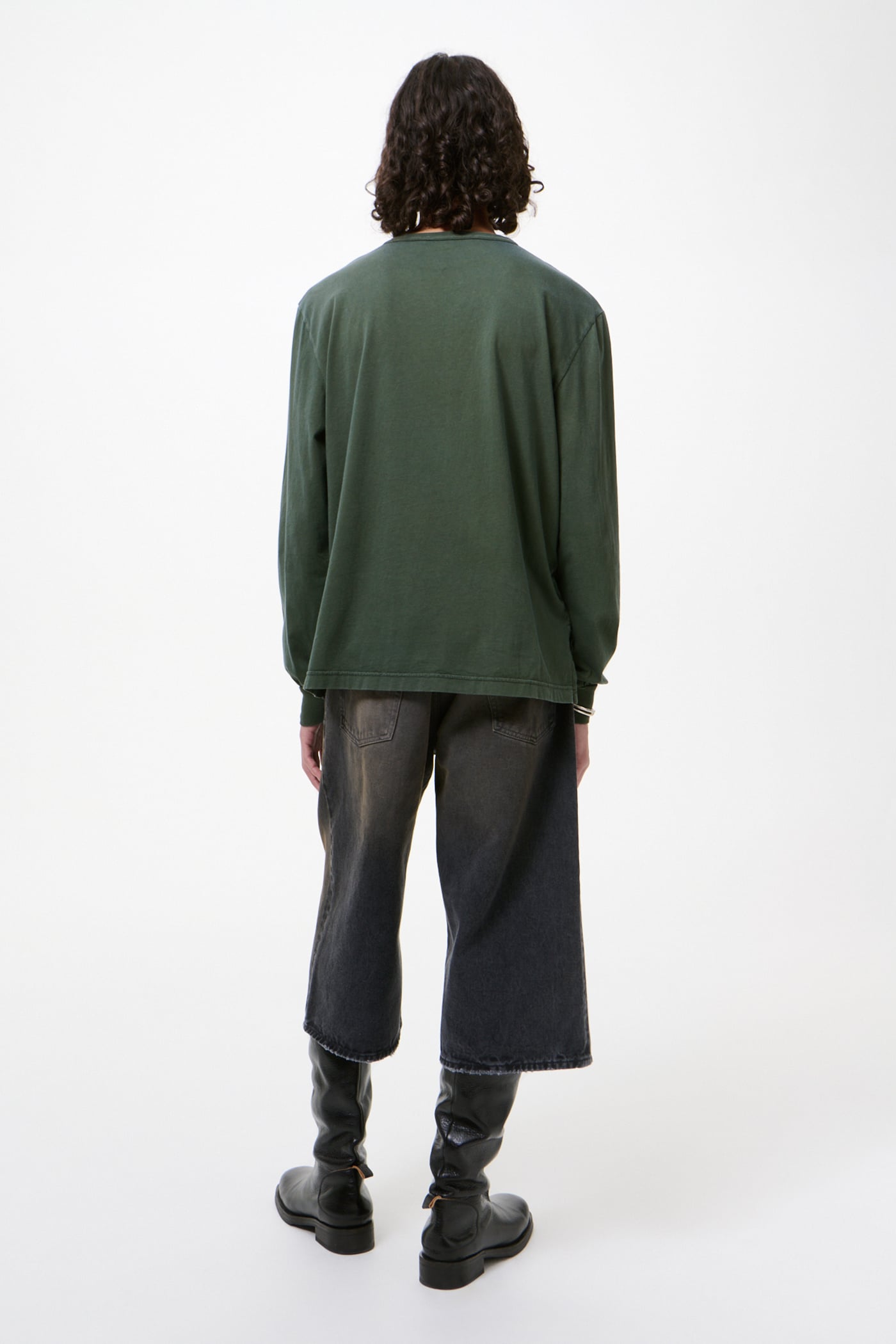Our Cruise Longsleeve in Antique Phantom Legacy Jersey. Produced in a Portuguese cotton jersey fabric with a special dye and antique fading that creates a deep petrol green tone, the Cruise Longsleeve has a regular fit and features a colaretto bound wide rib neck, side slits with a slightly longer back hem, and sleeve cuffs with distinct gathering.