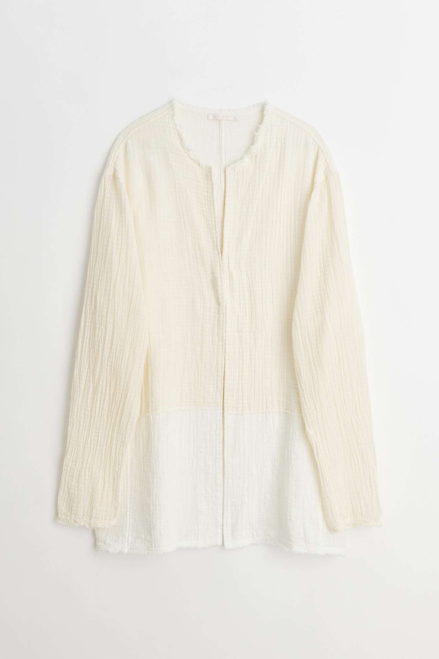 Our Cut Welding Liner in Off White Air Cotton. Produced in two Italian light weight cotton fabrics, a plain sparsely woven fabric and a delicate ripstop toplayer, the mens Cut Welding Liner has a straight elongated body and features a patch work of fabrics, an open front, a slit at back, raw edges and a straight bottom hem.