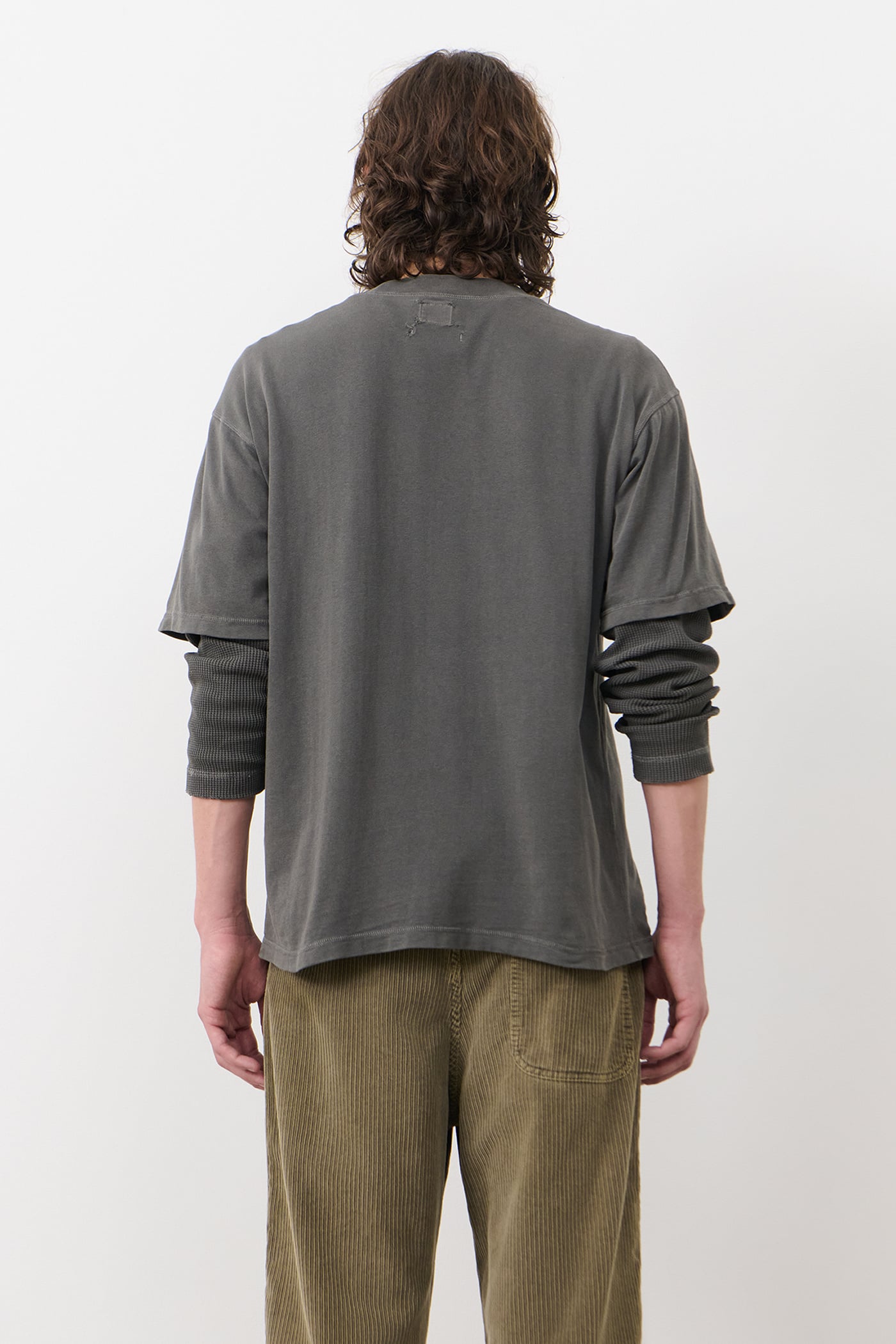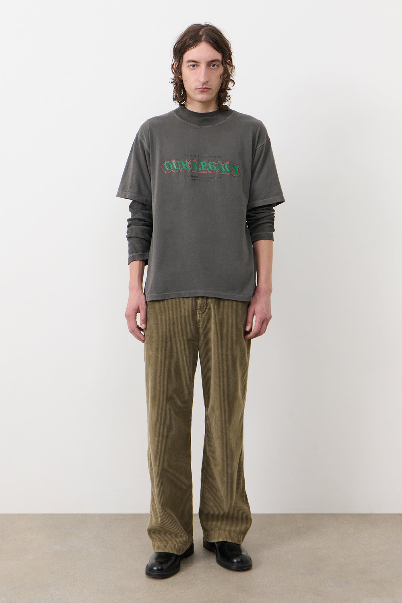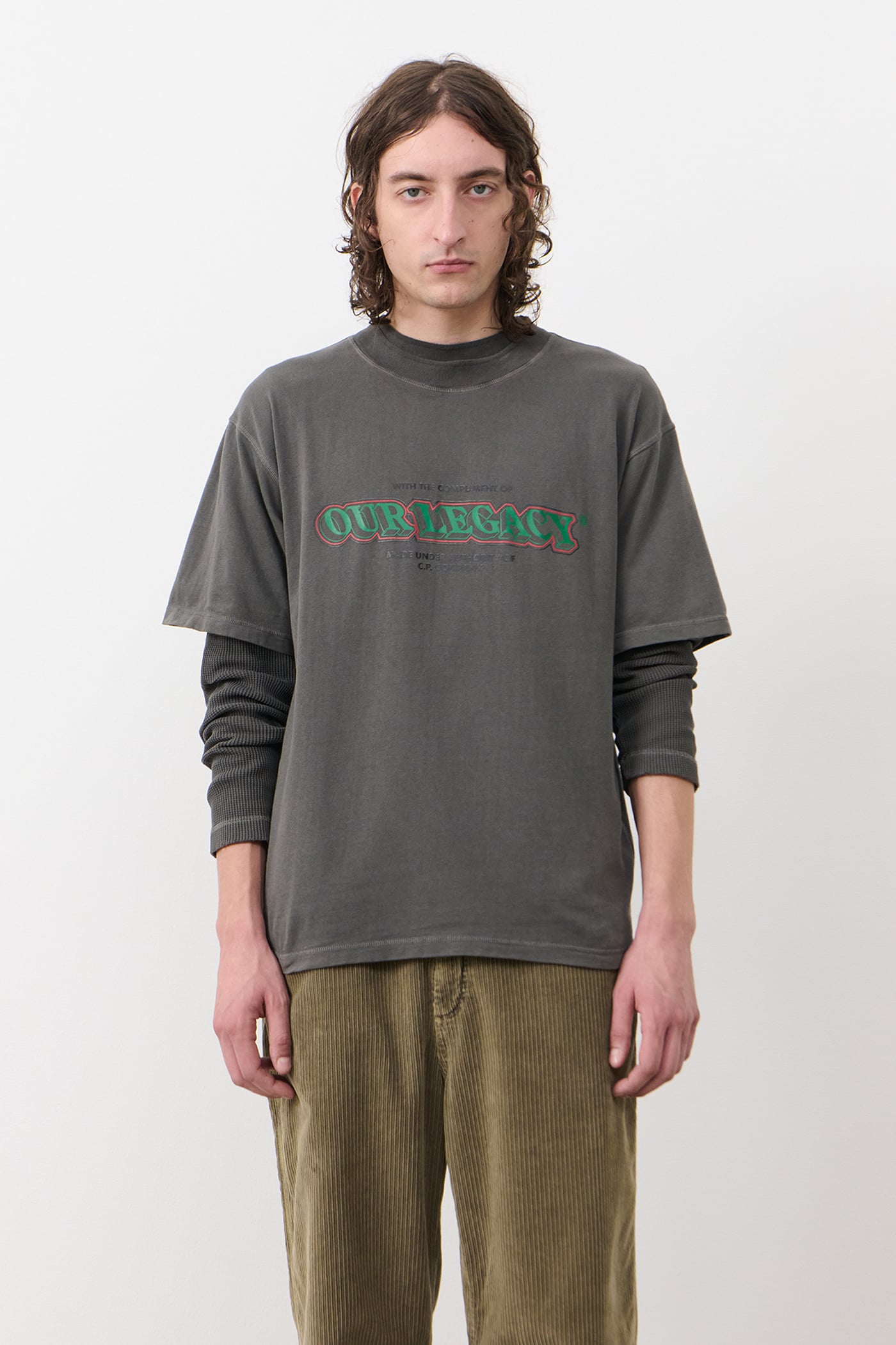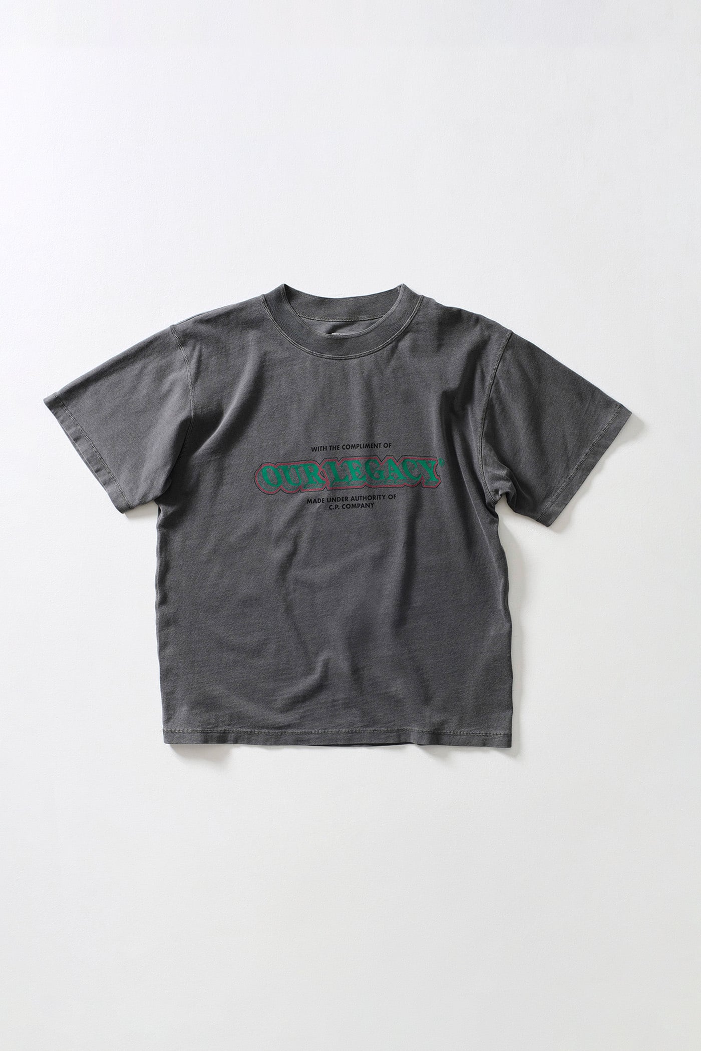 Deck T-Shirt in After Dark. Deck T-shirt is made in Italy and crafted from Portuguese cotton jersey for the collaboration between Our Legacy WORK SHOP and C.P. Company. Designed through research in the C.P. Company archive a collaborative artwork has been developed referencing vintage C.P. Company prints. The fabric has been pigment dyed for a naturally lived-in appearance. Featuring collaborative chest print and a oversized fit.