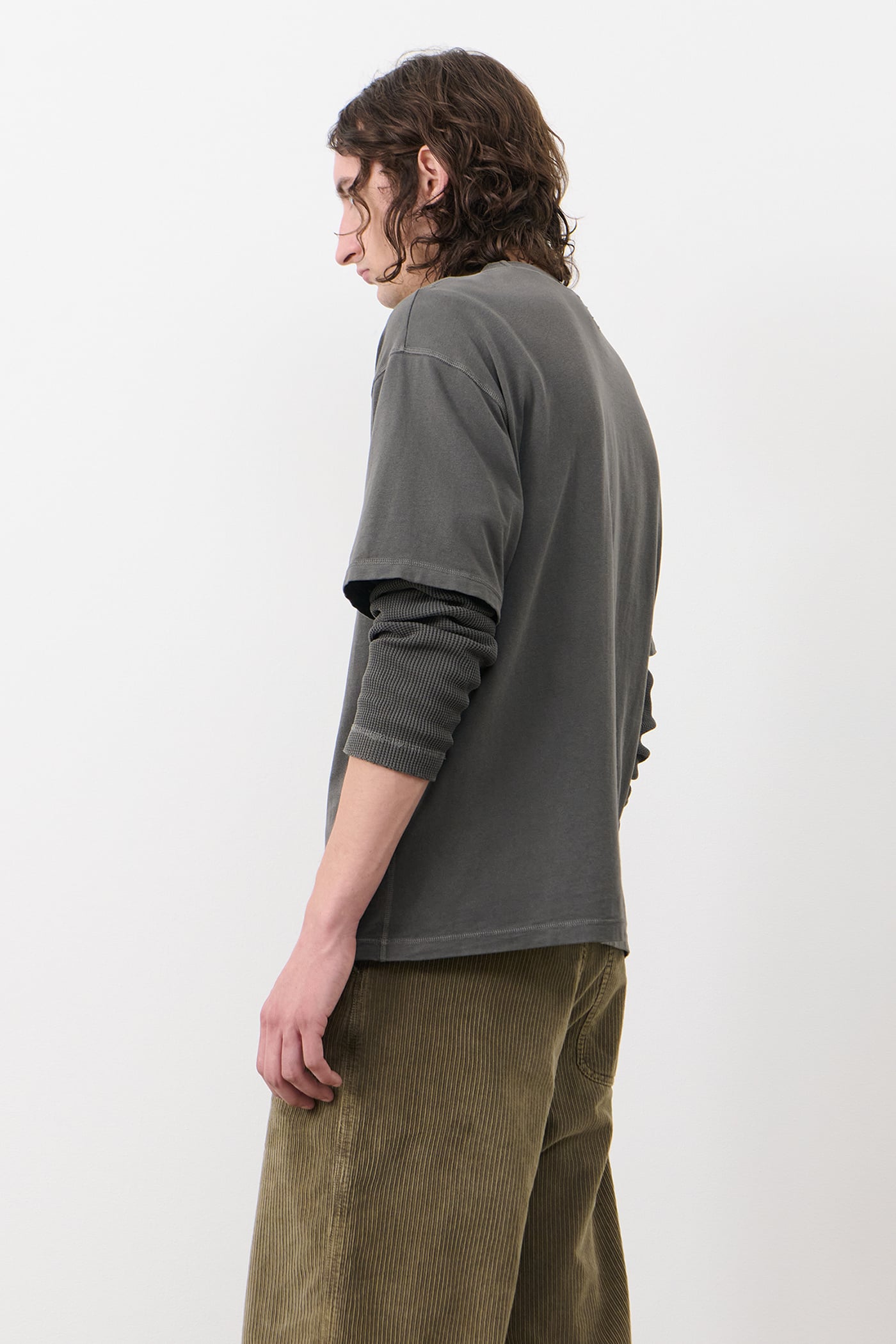 This garment is manufactured using carefully sourced material with a unique pigment treatment process that will give each garment an individual shade and appearance. This technique could result in some color bleed onto lighter garments or surfaces. The garment shall be shaped by its wearer and naturally distress over time to finish the design process.