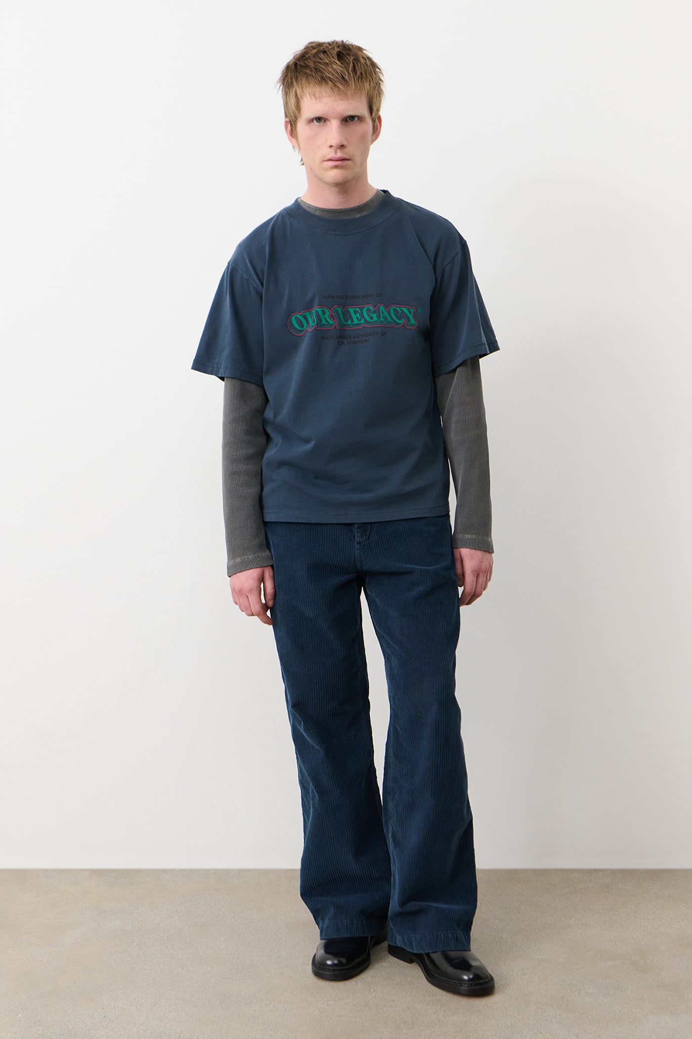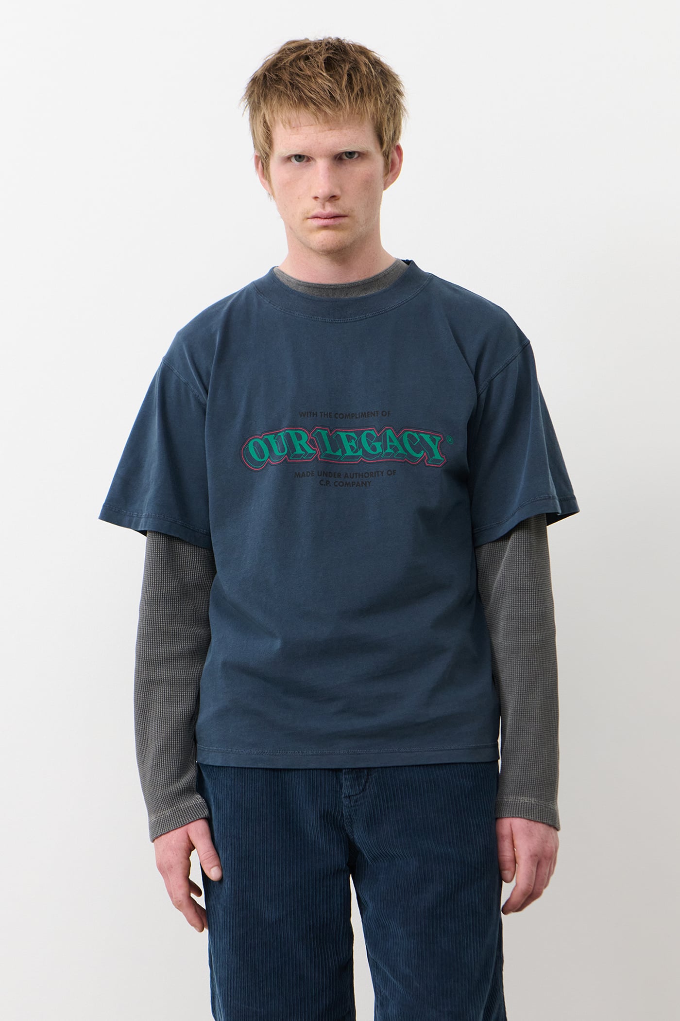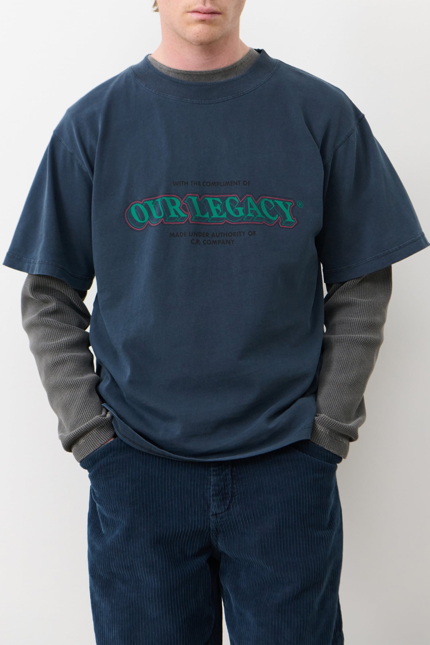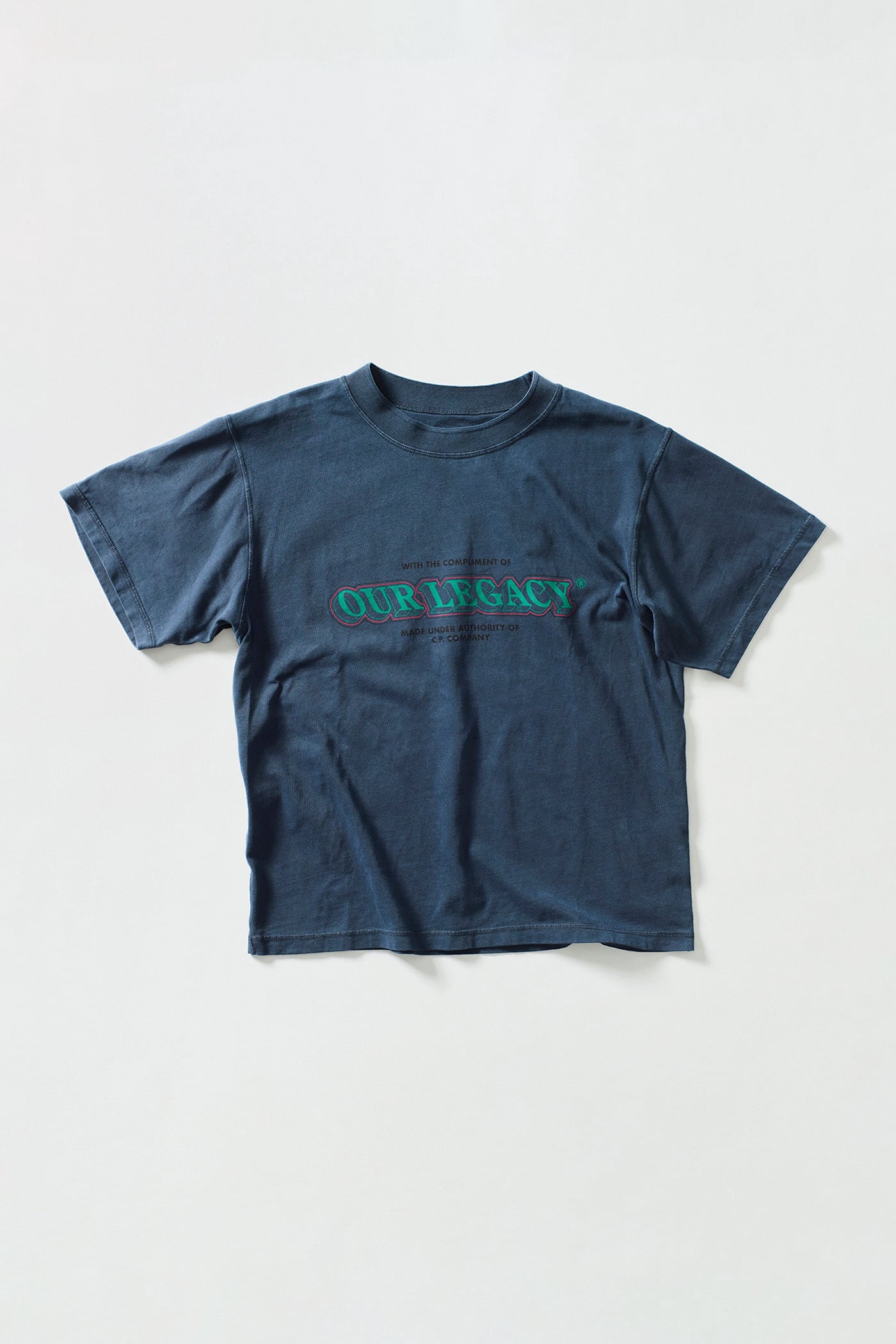 Deck T-Shirt in Total Eclipse. Deck T-shirt is made in Italy and crafted from Portuguese cotton jersey for the collaboration between Our Legacy WORK SHOP and C.P. Company. Designed through research in the C.P. Company archive a collaborative artwork has been developed referencing vintage C.P. Company prints. The fabric has been pigment dyed for a naturally lived-in appearance. Featuring collaborative chest print and a oversized fit.