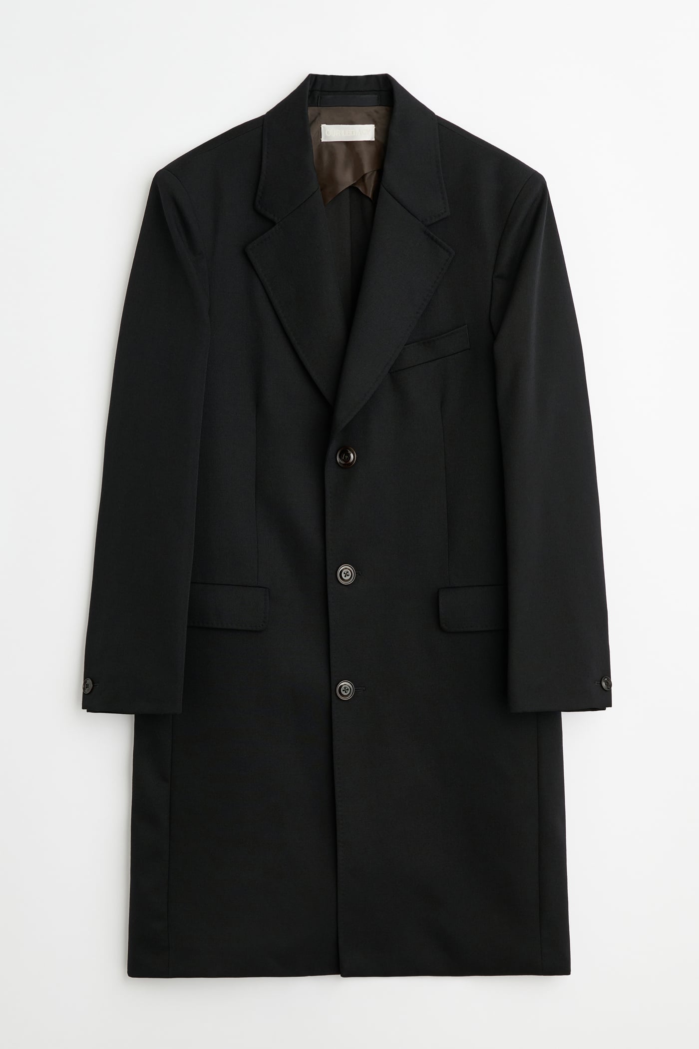 Our Dolphin Coat in Coarse Black Gabardine. Produced in an Italian virgin wool gabardine twill fabric. Gabardine’s tightly woven twill construction delivers durability, wind resistance and a smooth, firm hand. Its diagonal weave lends a sturdy yet refined appearance, balancing structure with drape. The Dolphin Coat has a generous fit and features a notched lapel, single-breasted front with corozo buttons, single-button cuffs, flapped jet pockets, a welt chest pocket and a full lining.