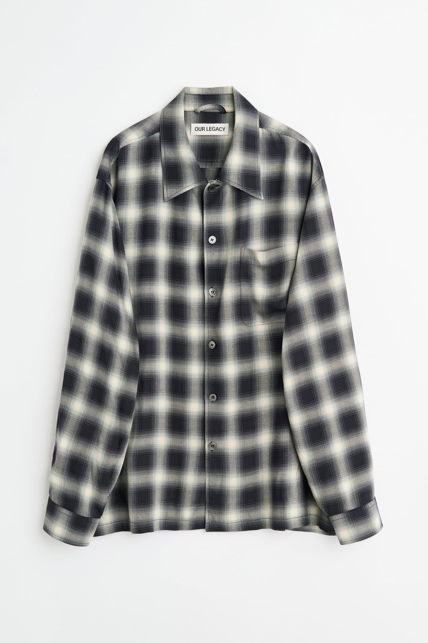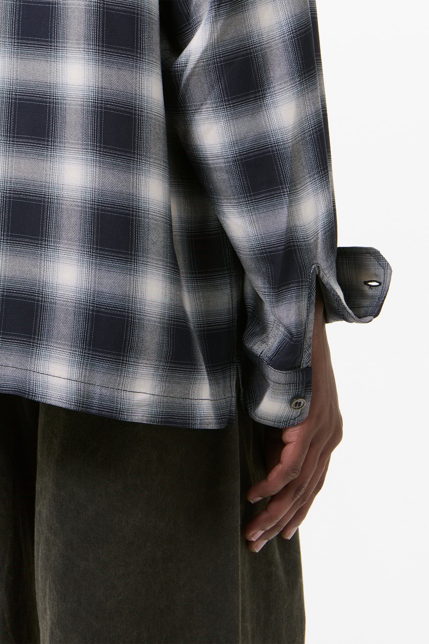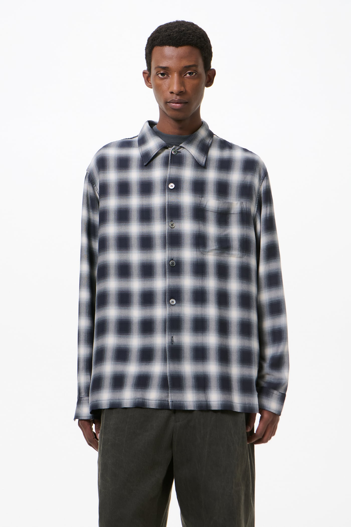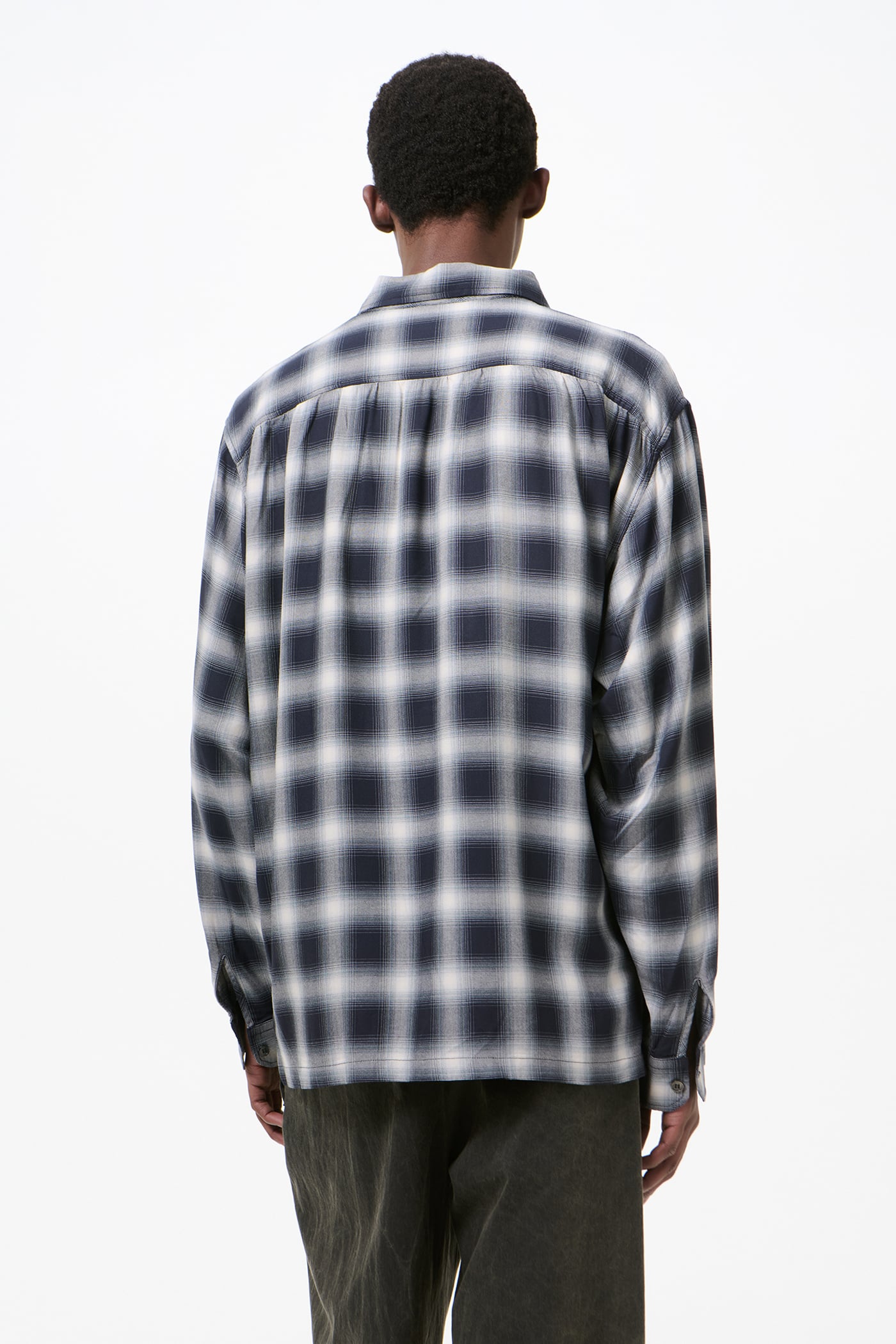Our Every Shirt in Reno Cowboy Viscose. Produced in a Japanese viscose fabric with a check pattern, the Every Shirt has a relaxed fit and features a straight hem, a clean placket with wide facing, mother of pearl buttons, and a back yoke with subtle ruching.