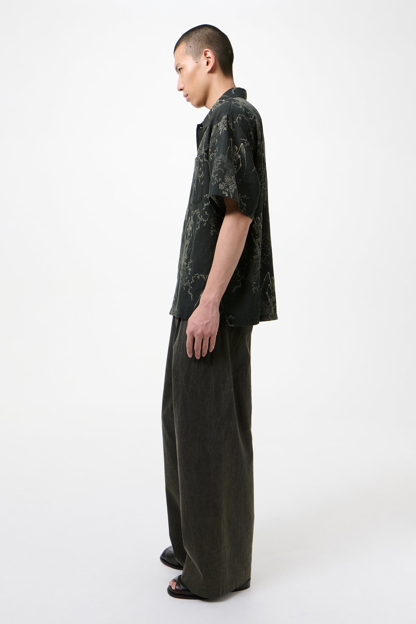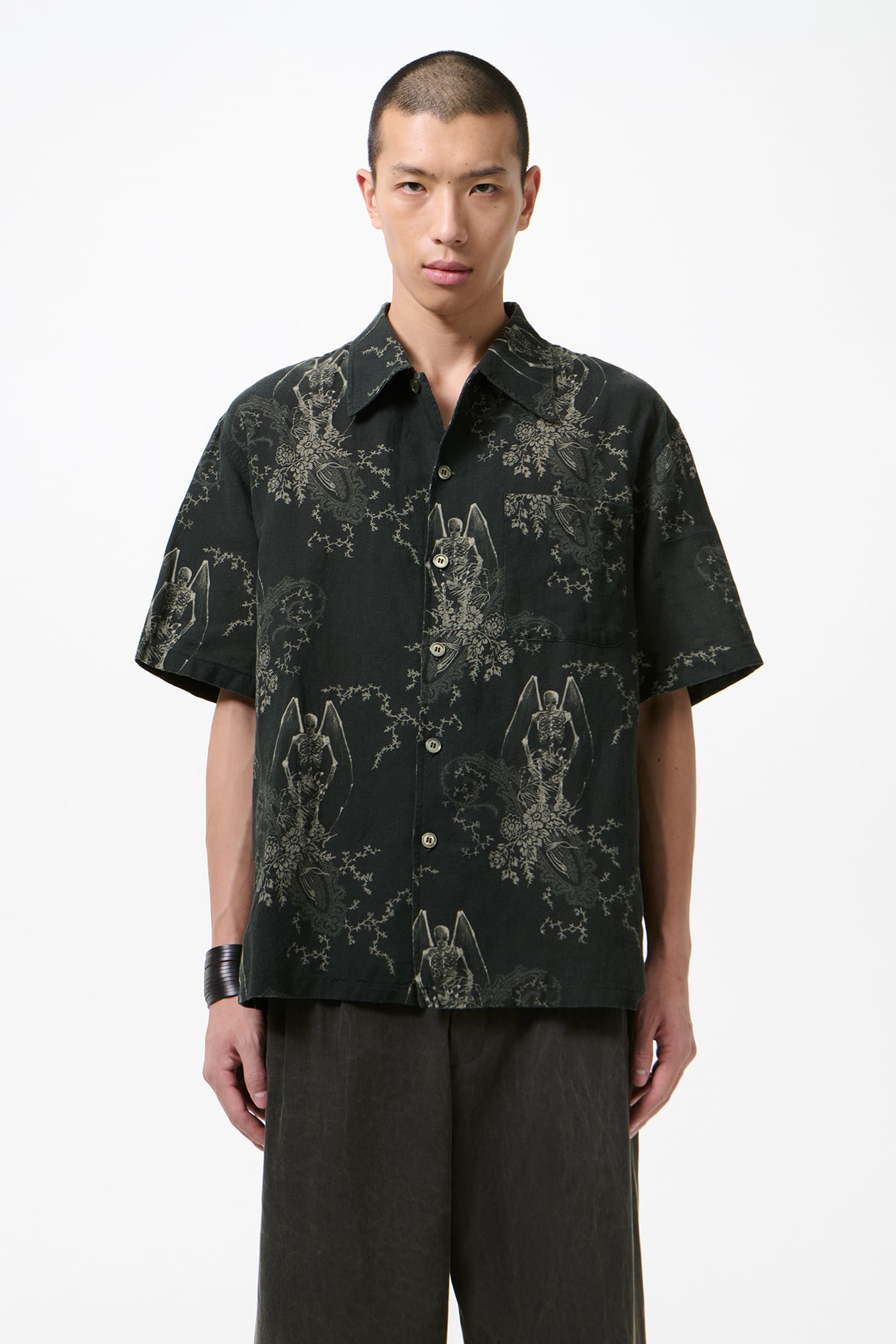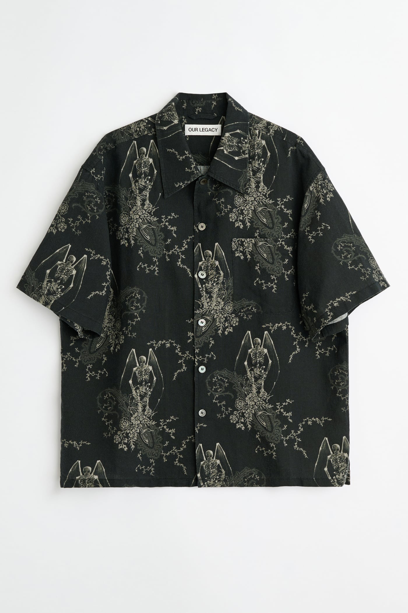 Our Every Shirt Shortsleeve in Death Paisley Print. Produced in a Portuguese cotton and linen fabric featuring our Death Paisley print, the men's Every Shirt Shortsleeve has a regular, straight fit with a relaxed, boxy silhouette and features a plain collar, mother of pearl buttons, a clean placket with wide internal facing, and a straight hem. A refined back yoke with subtle ruching adds volume without pleats, while elbow-length sleeves have a shallow opening.