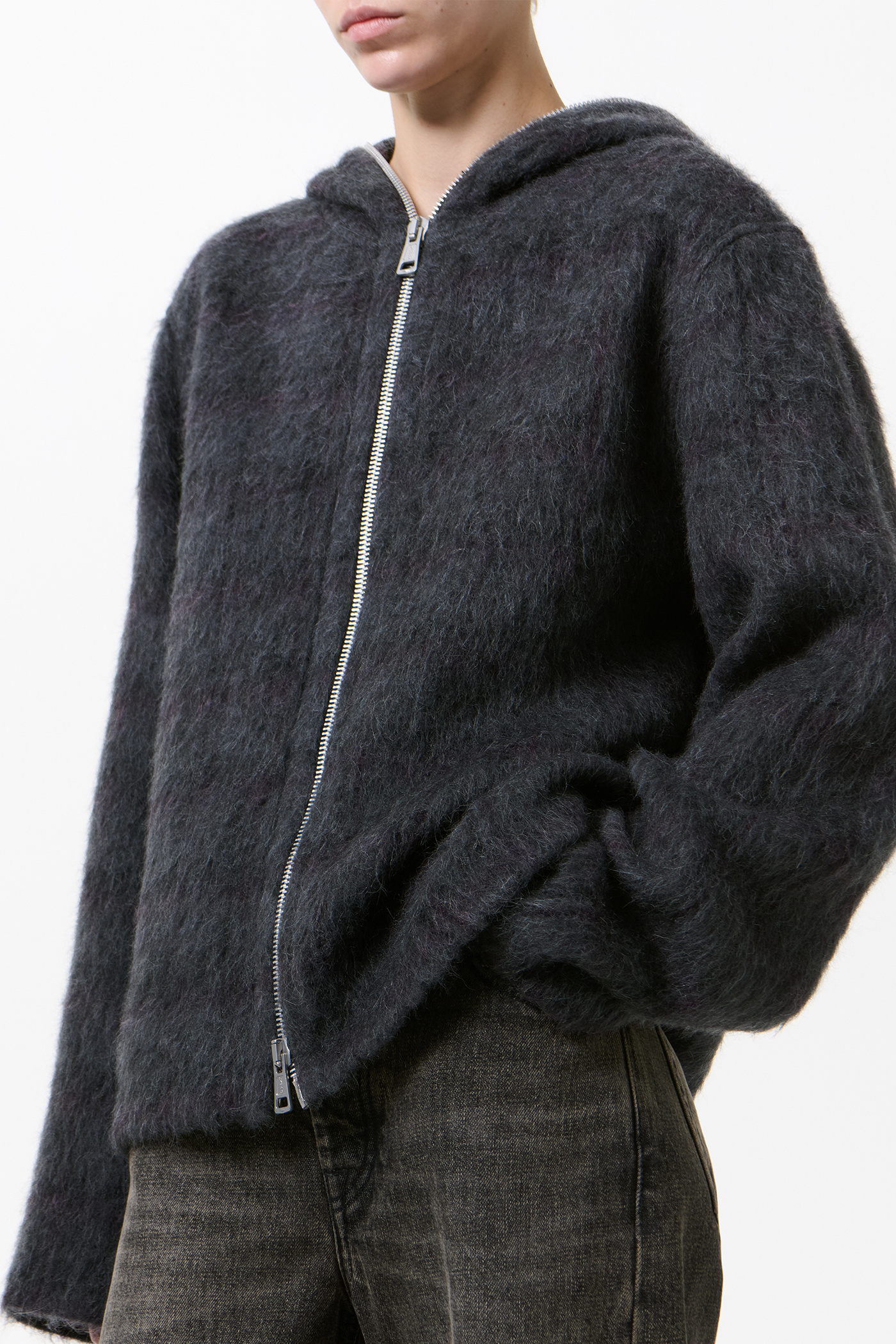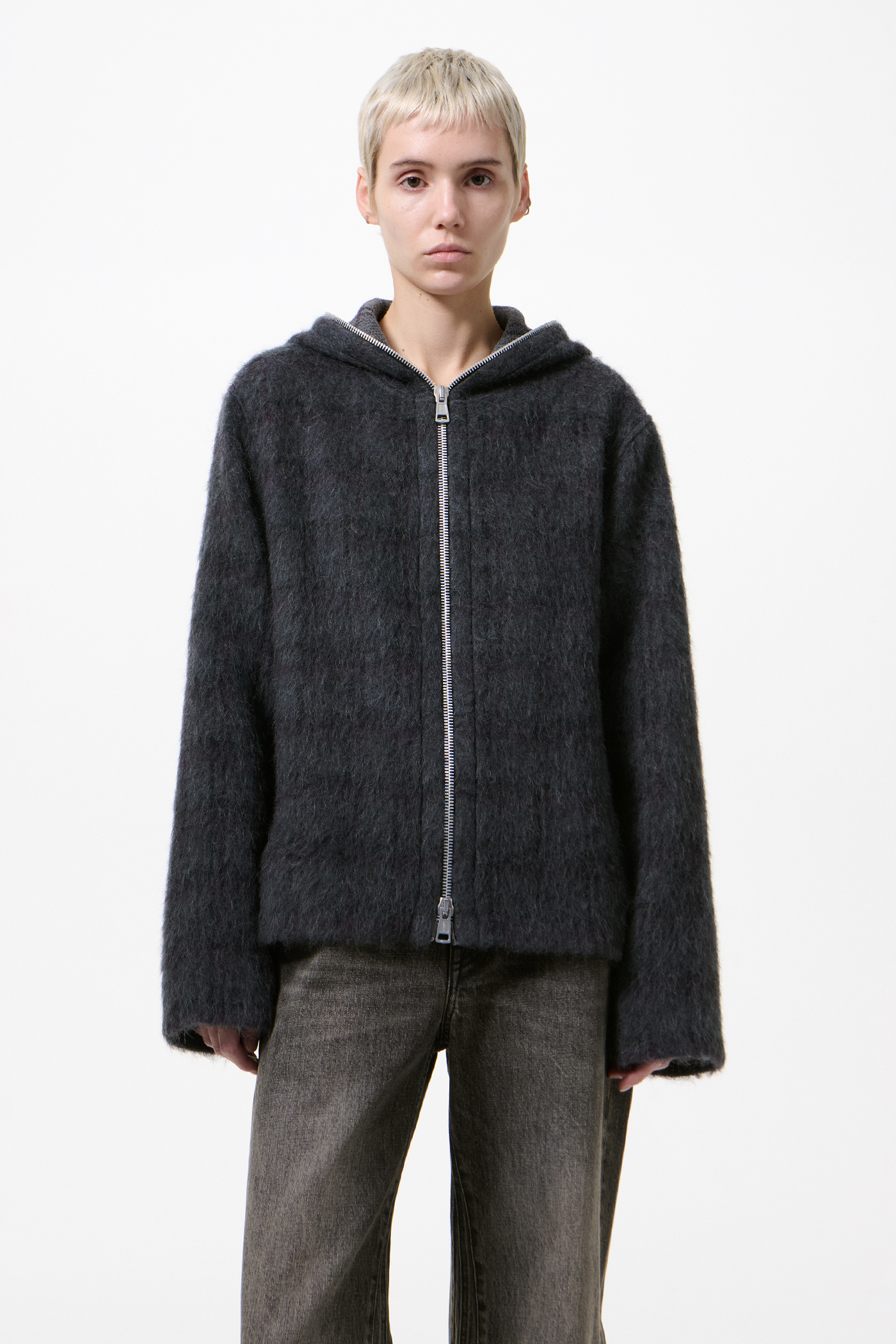 Our Full Zip Hood in Fuzzed Plum Check Hairy Wool. Produced in an Italian checked wool and alpaca blend fabric with a soft, hairy texture, the Full Zip Hood has a relaxed, boxy fit and features a Lampo two-way zip and straight hem.