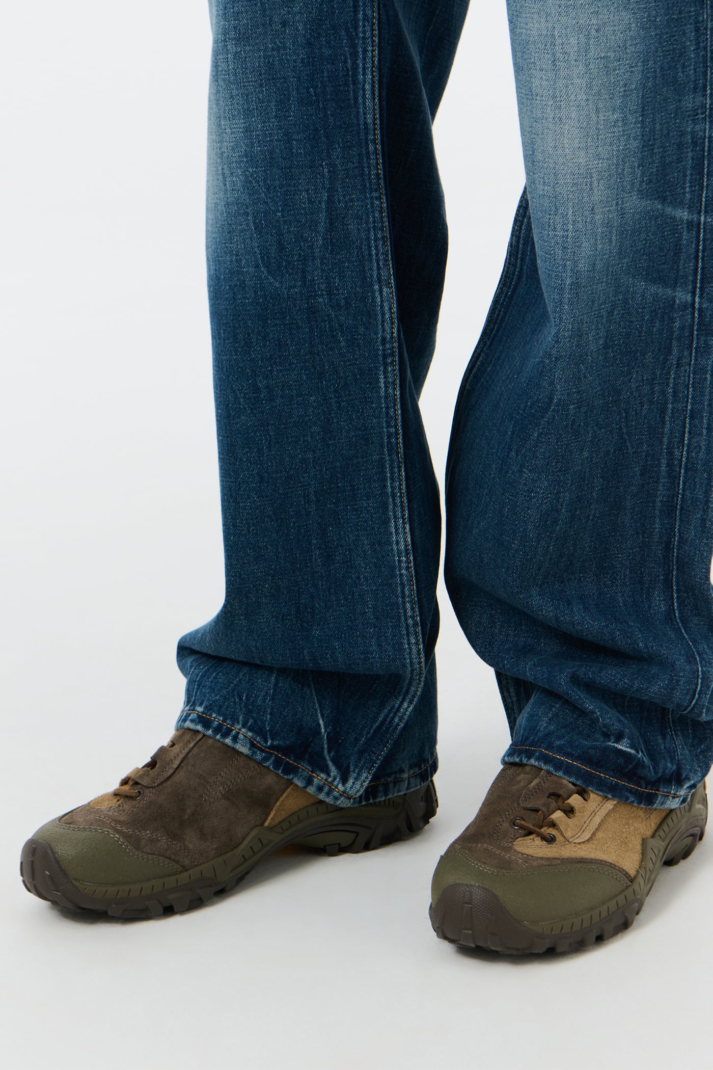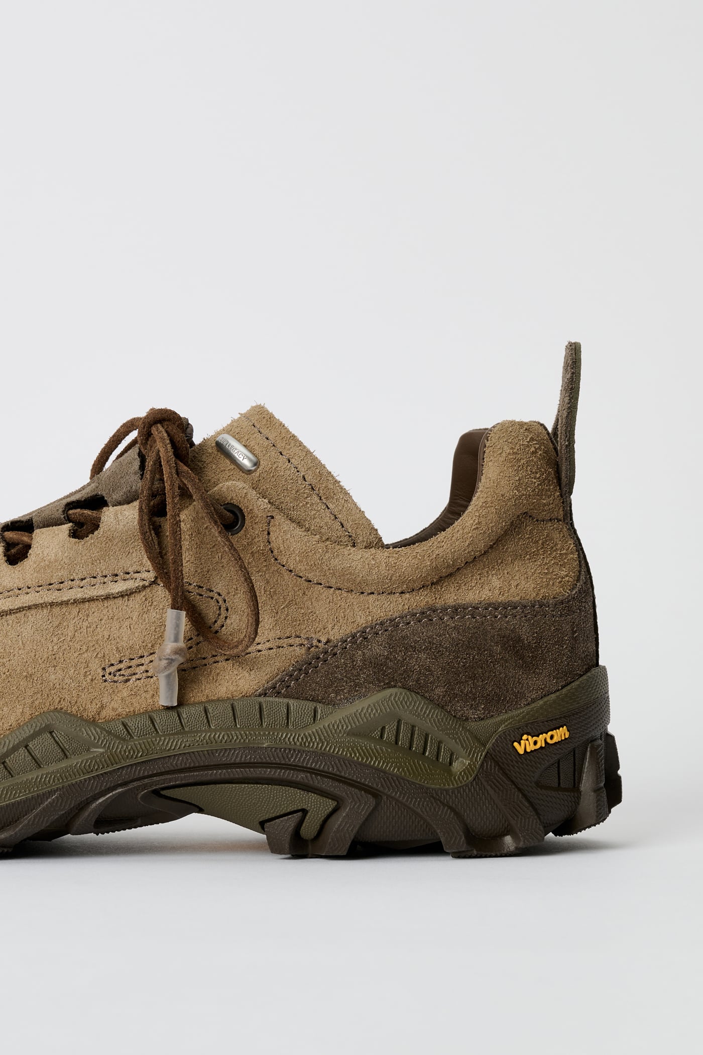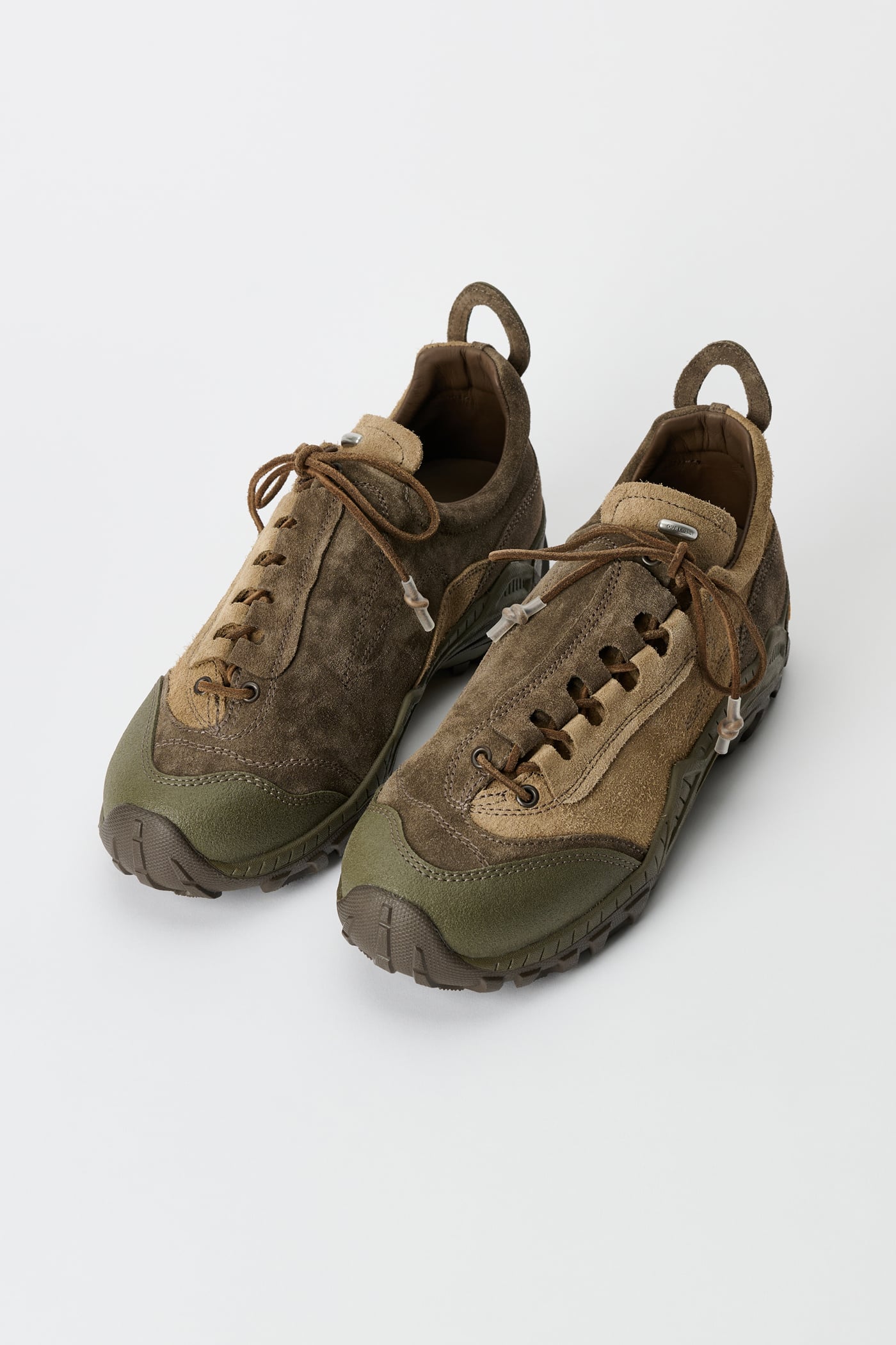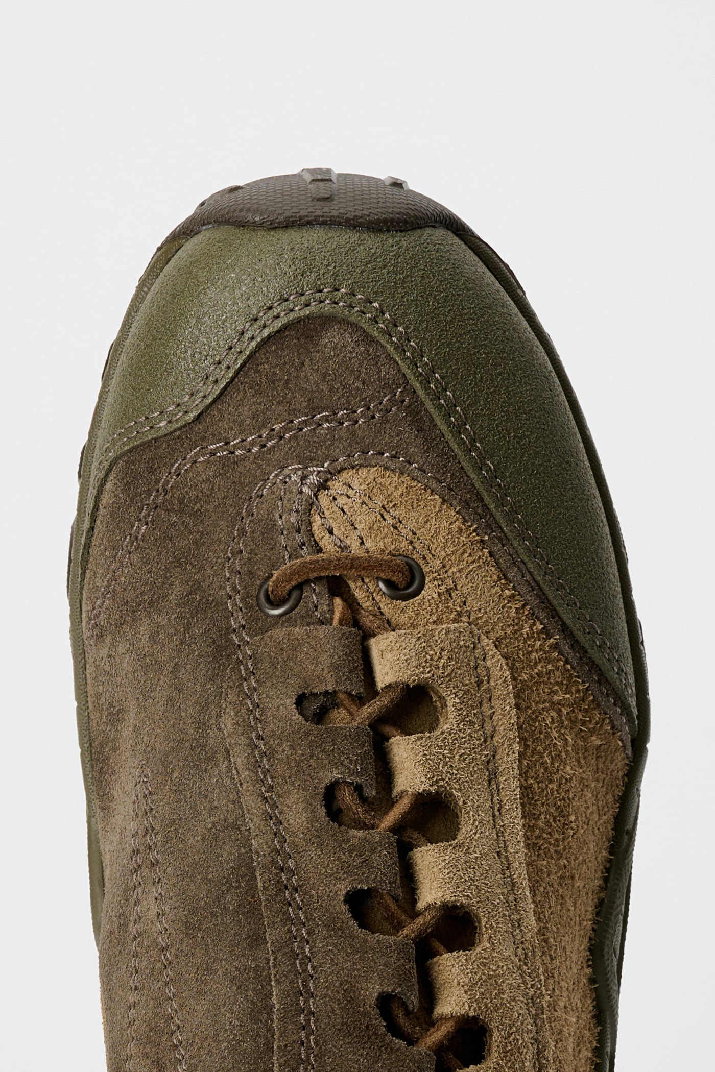 Our Gabe in Woodland Suede. Produced with an Italian suede upper and contrast panel construction, the Gabe features a polyurethane toe cap, Vibram sole, asymmetrical lacing with rounded leather laces and rubber coated tips, a metal OUR LEGACY rivet on the tongue and an oval heel pull.
