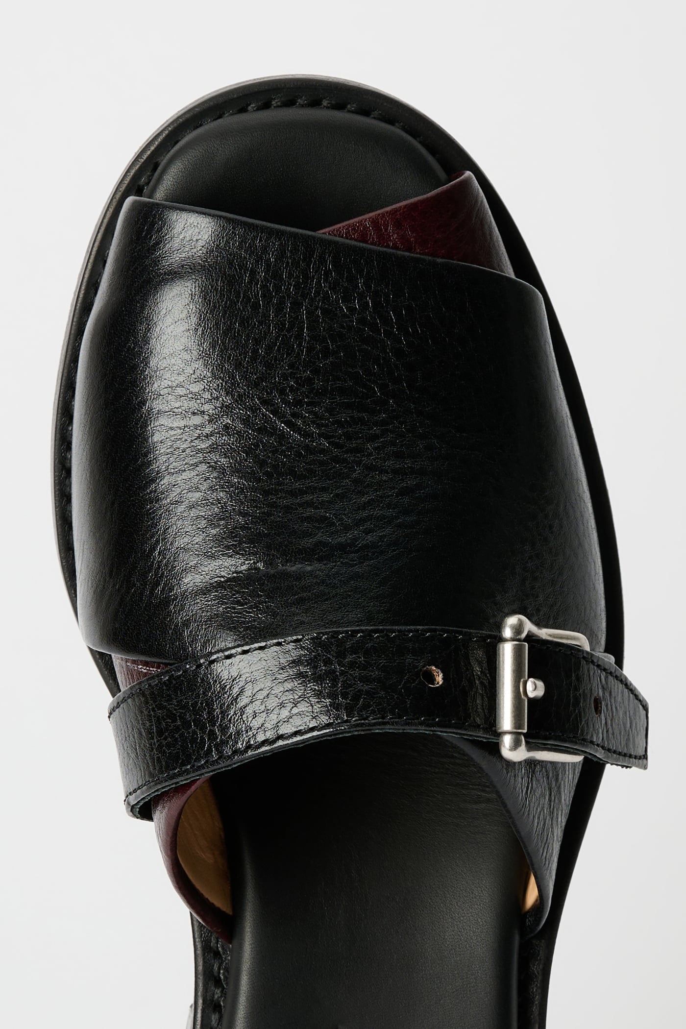 Our Ginza Sandal in Deep Black Leather. Produced in Italian vegetable-tanned full grain cow leather, the Ginza Sandal features an open toe silhouette with two wide contrast leather bands and a decorative buckle strap, set on a leather sole with a slight heel inclination and finished with a Goodyear welted sole construction.
