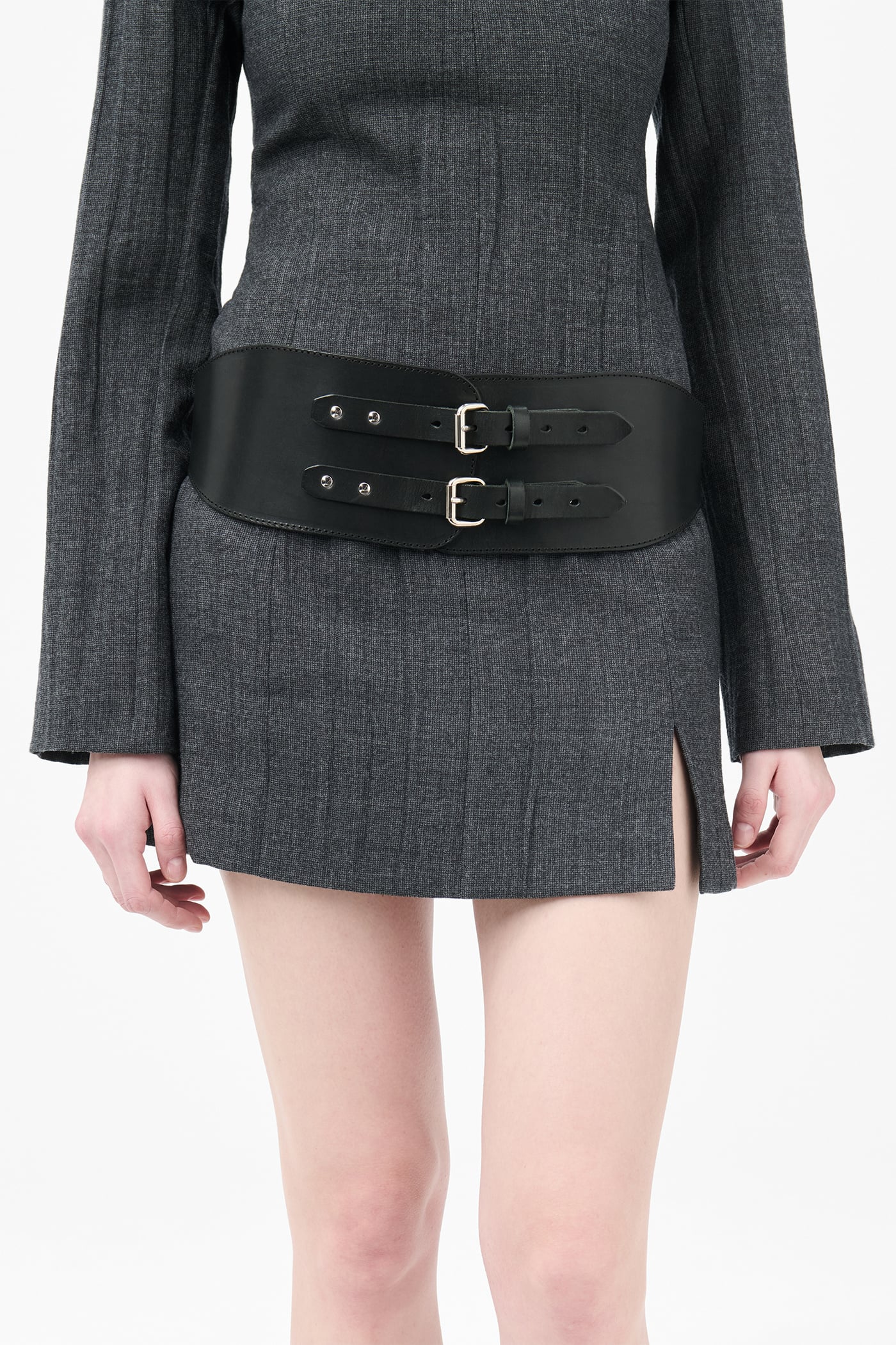 Our Girdle Belt in Slow Black Arid Bull Hide. Produced in Italian vegetable-tanned cow leather with a smooth surface and soft shiny finish, the Girdle Belt features a shaped design with stitched edges, double strap closure with metal buckles, and a studded cut-out design at center back. Based on a genuine girdle belt, it has a two-buckle fastening at center front and can be worn either at waist or hip with only the upper buckle attached, creating an angled silhouette at the center front.