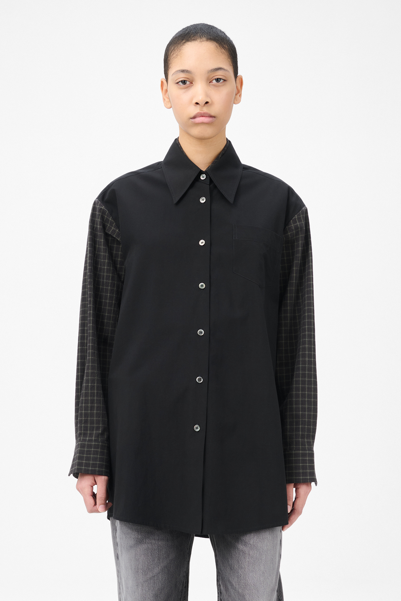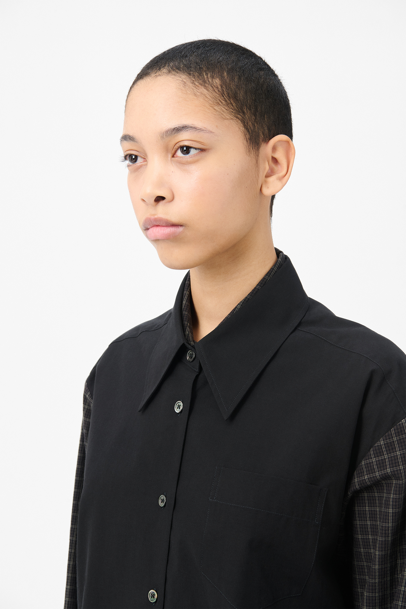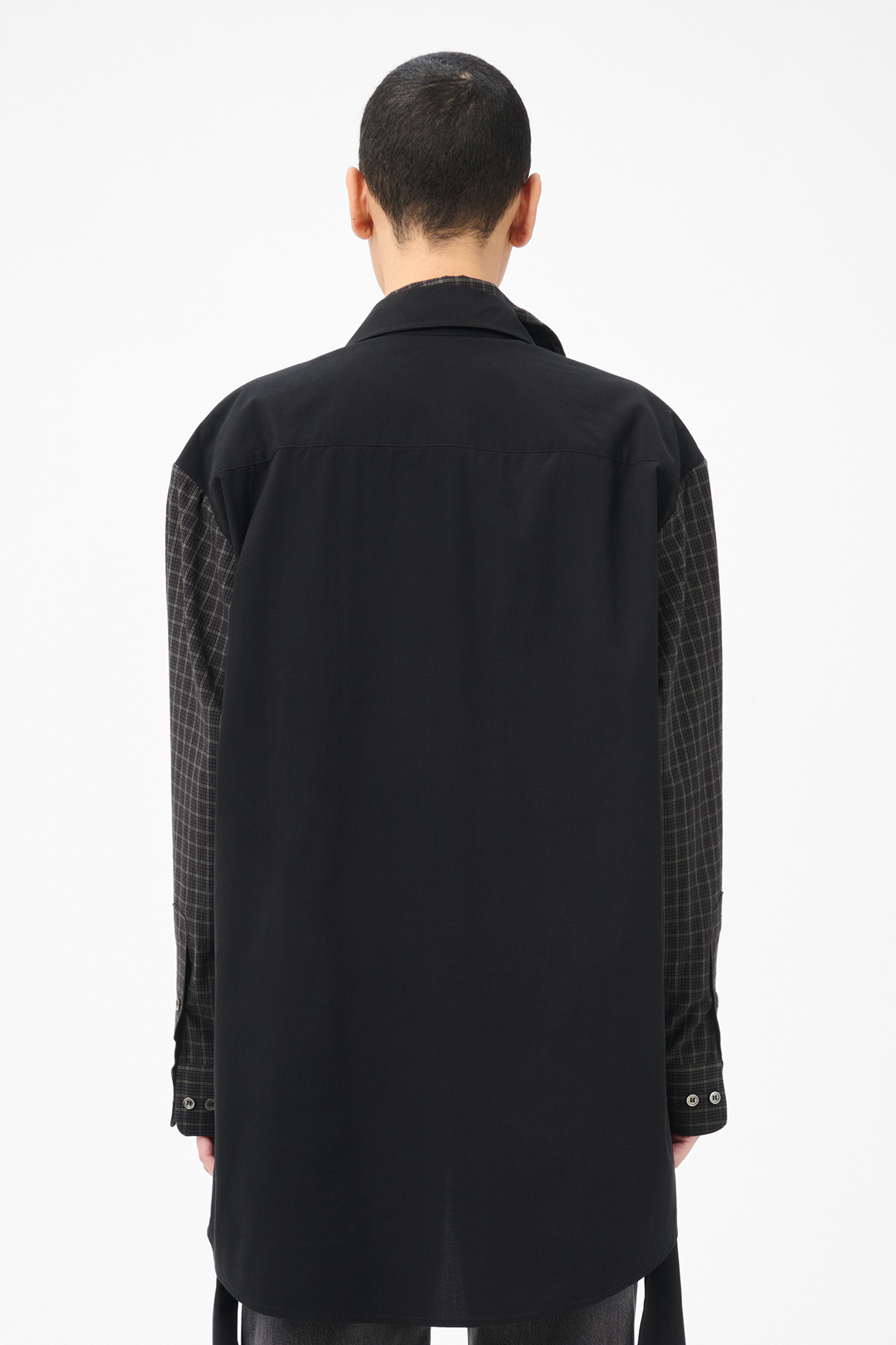Our Girdle Shirt in Black Liquid Poplin. Produced in Chinese fabric crafted from lyocell and cotton, the women's Girdle Shirt features a distinctive double layered construction creating a trompe l'oeil double shirt effect. The design includes a fitted inner piece with girdle belt that can be tied around the waist, paired with an oversized outer shirt vest. Details include a chest pocket, pleated shoulder construction, layered back yoke, mother of pearl buttons and mitered cuffs.