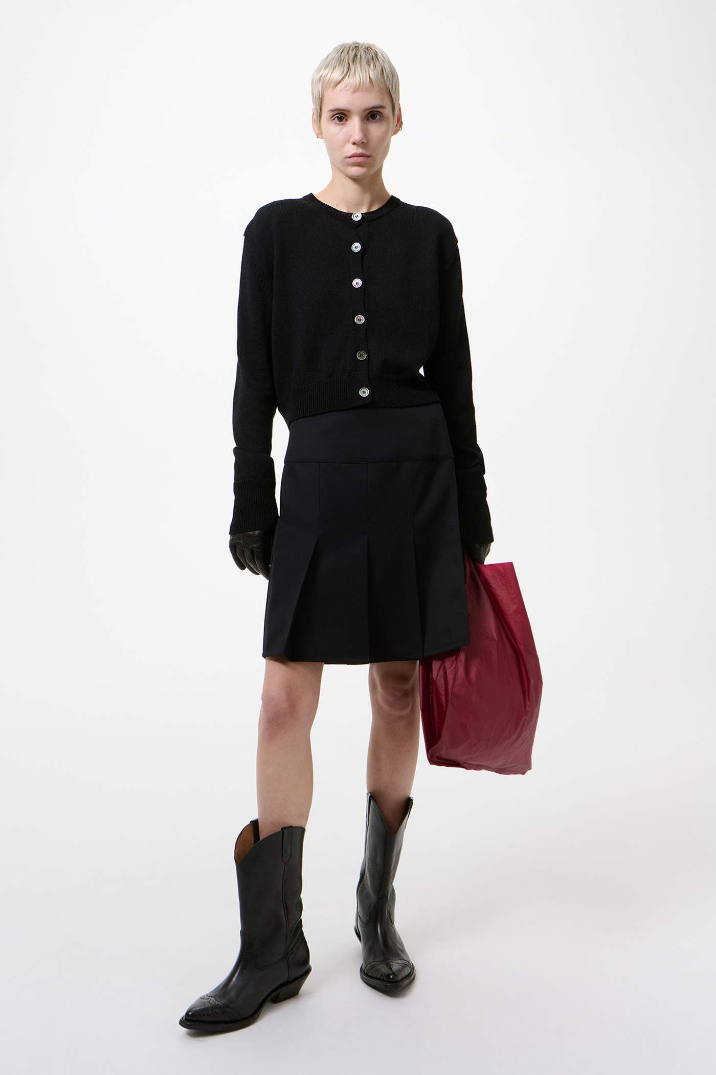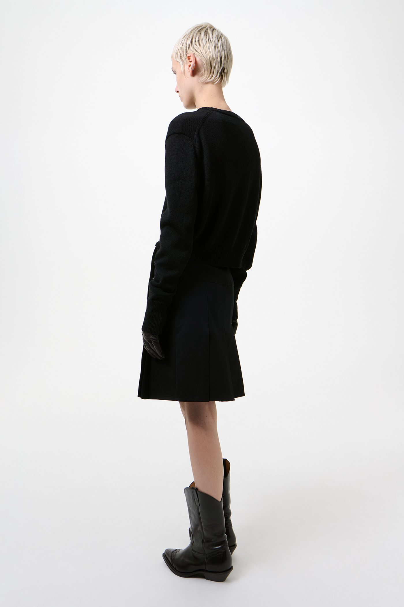 Our Girdle Skirt in Coarse Black Gabardine. Produced in an Italian Virgin Wool fabric. The women's Girdle Skirt features a wide girdle belt waistband that fastens with sew-on snaps. The A-line silhouette showcases a wide pleat design and can open fully to function as a sarong, offering versatile styling options.