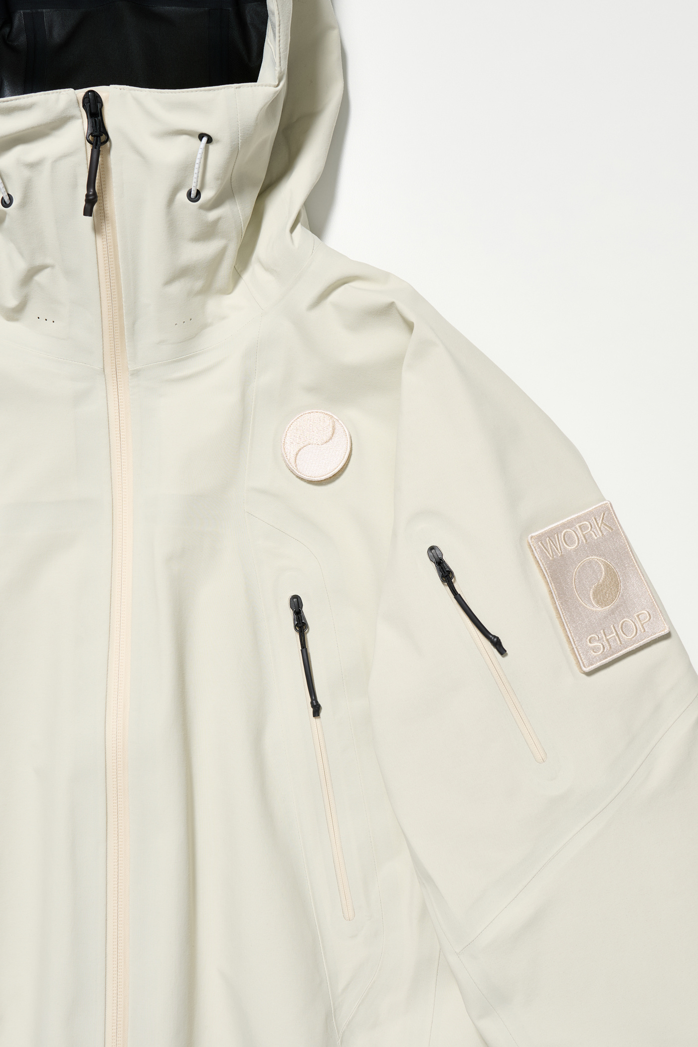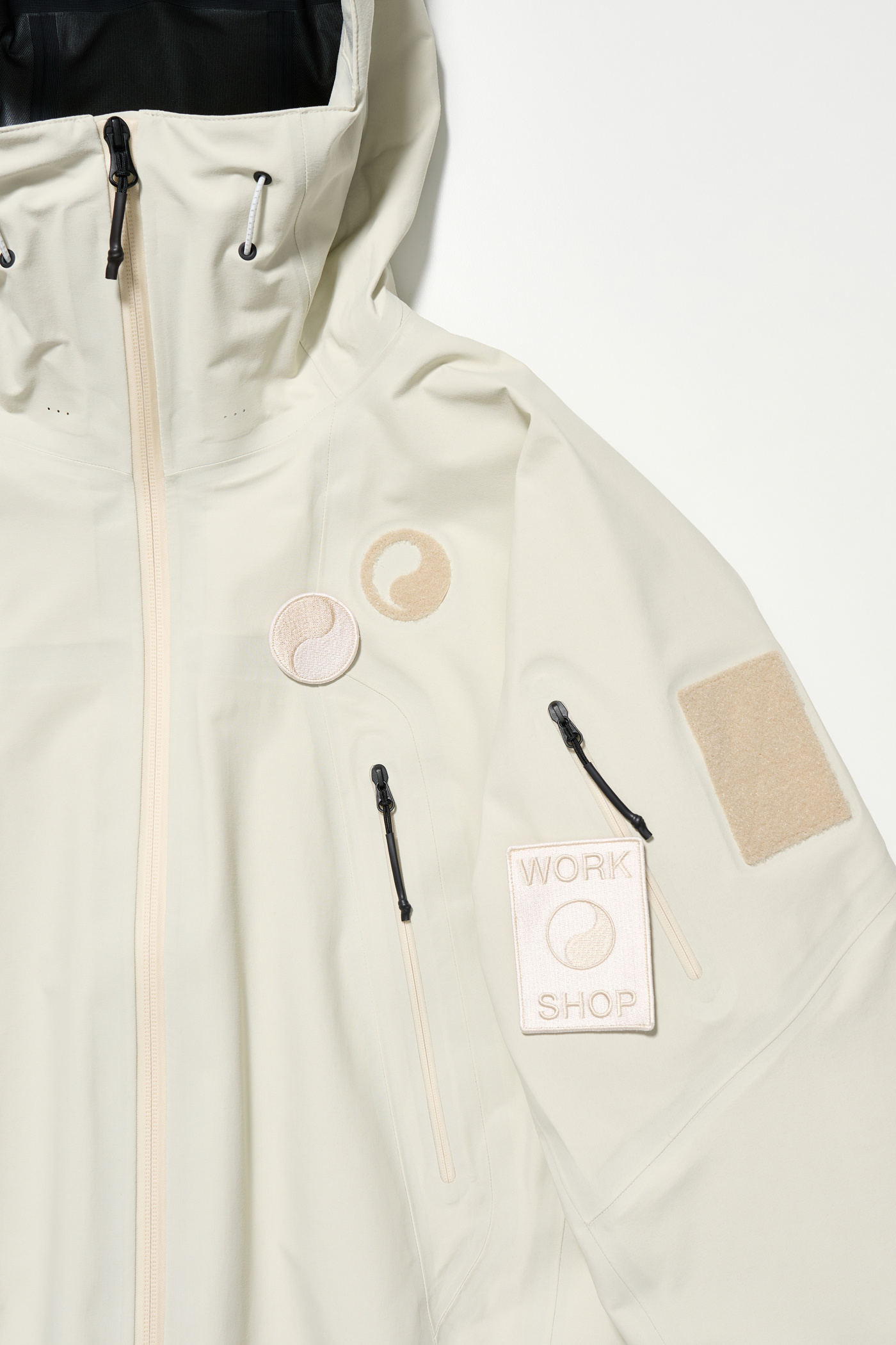 The drawcord at the hem allows silhouette adjustment. Velcro patches are placed on both sleeves and the left chest, and the jacket comes with embroidered patches created specifically for this collection. The patches are detachable and can be freely arranged for customization.