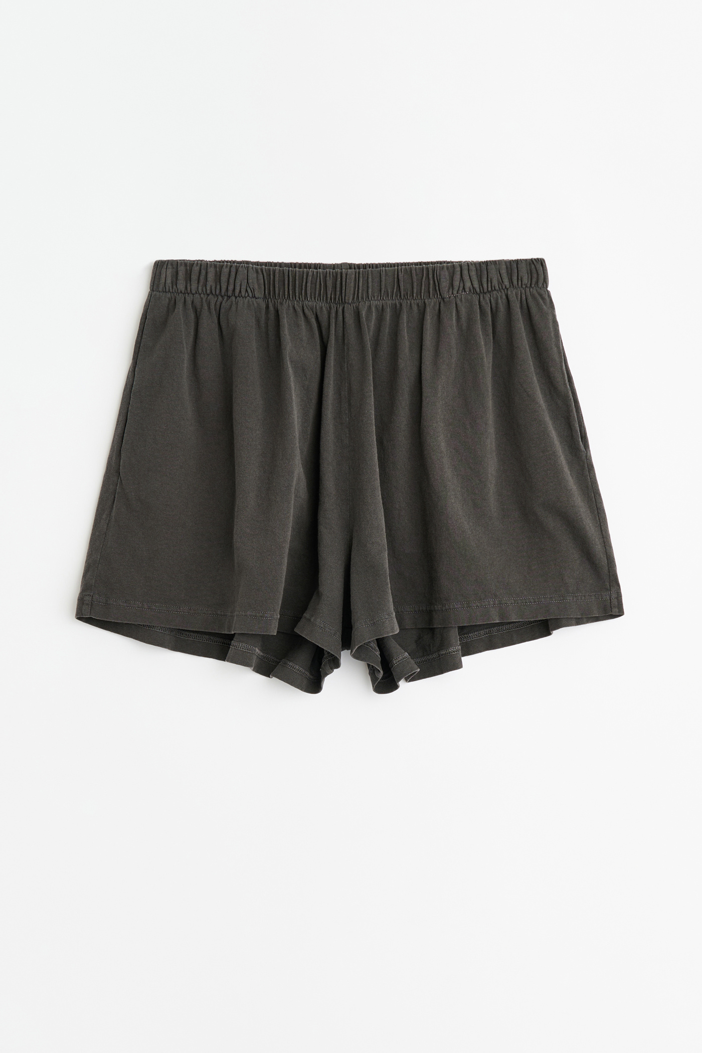 Our Gored Shorts in Worn Graphite Legacy Jersey. Produced in a Portuguese cotton jersey, these shorts are inspired by re‑making a T‑shirt into a pair of shorts and feature an exaggerated gathered construction for a draped silhouette with functional inseam pockets. Piece dyed with natural pigments and finished with a tint spray, they arrive with a softly worn, faded look that will continue to evolve with time.