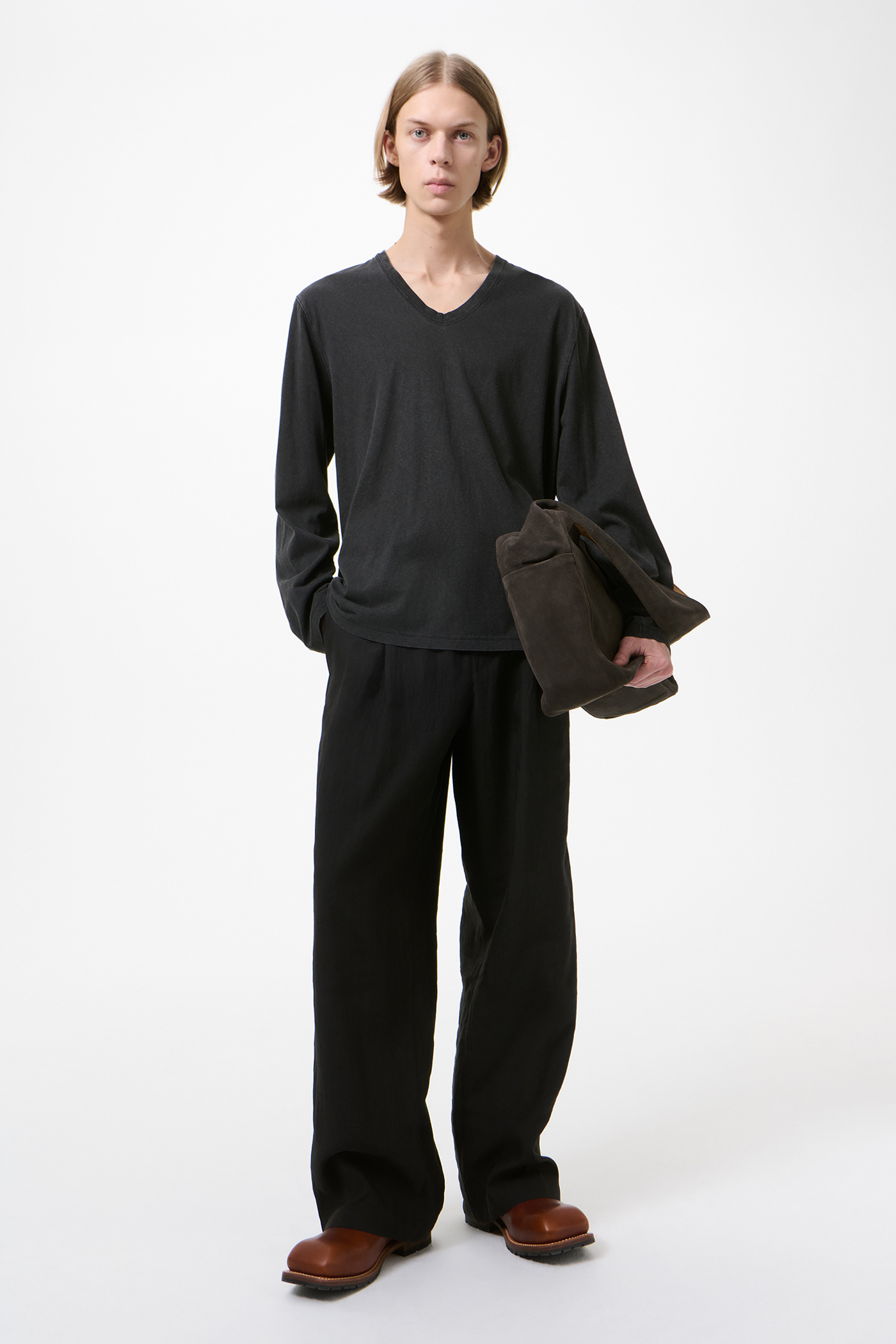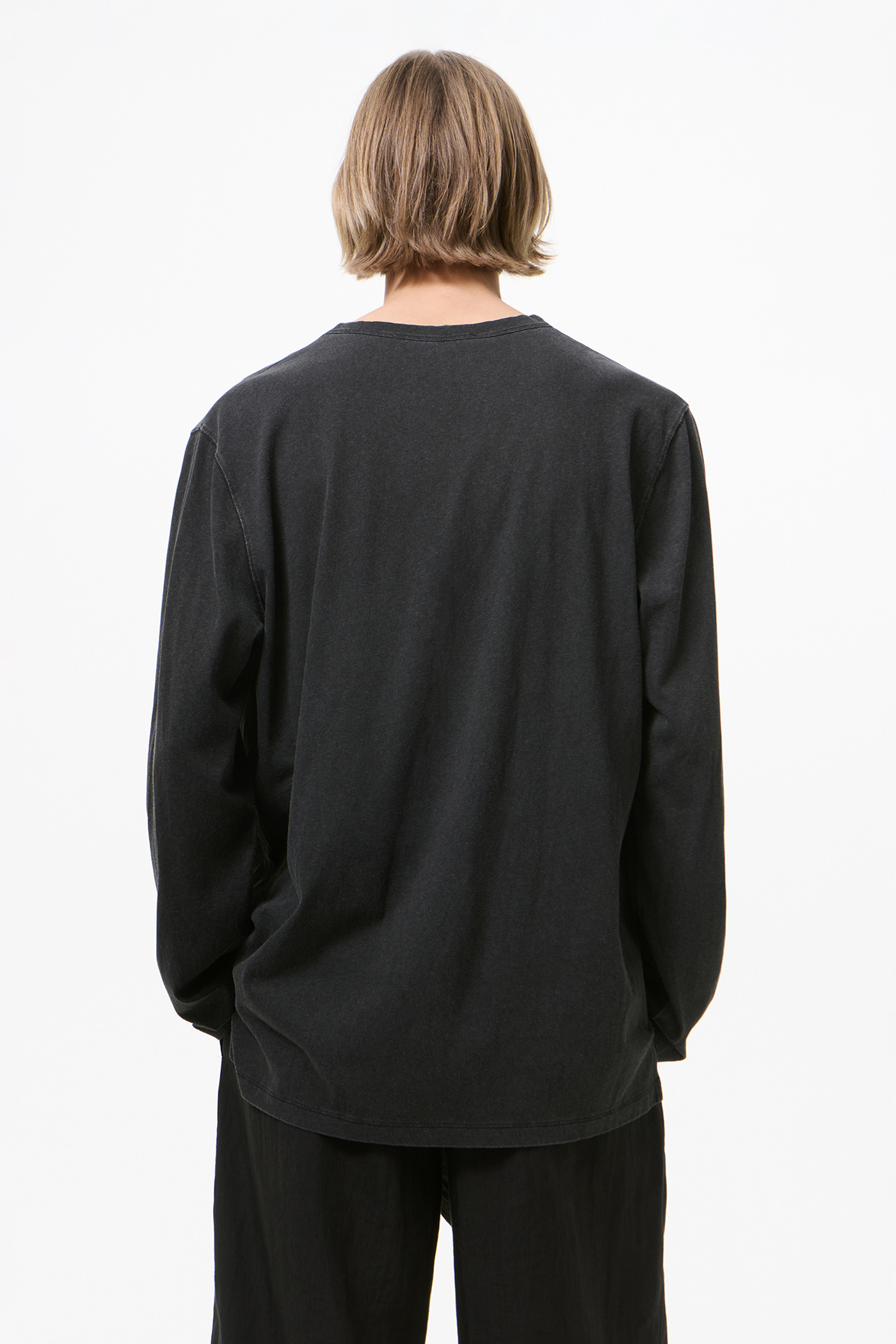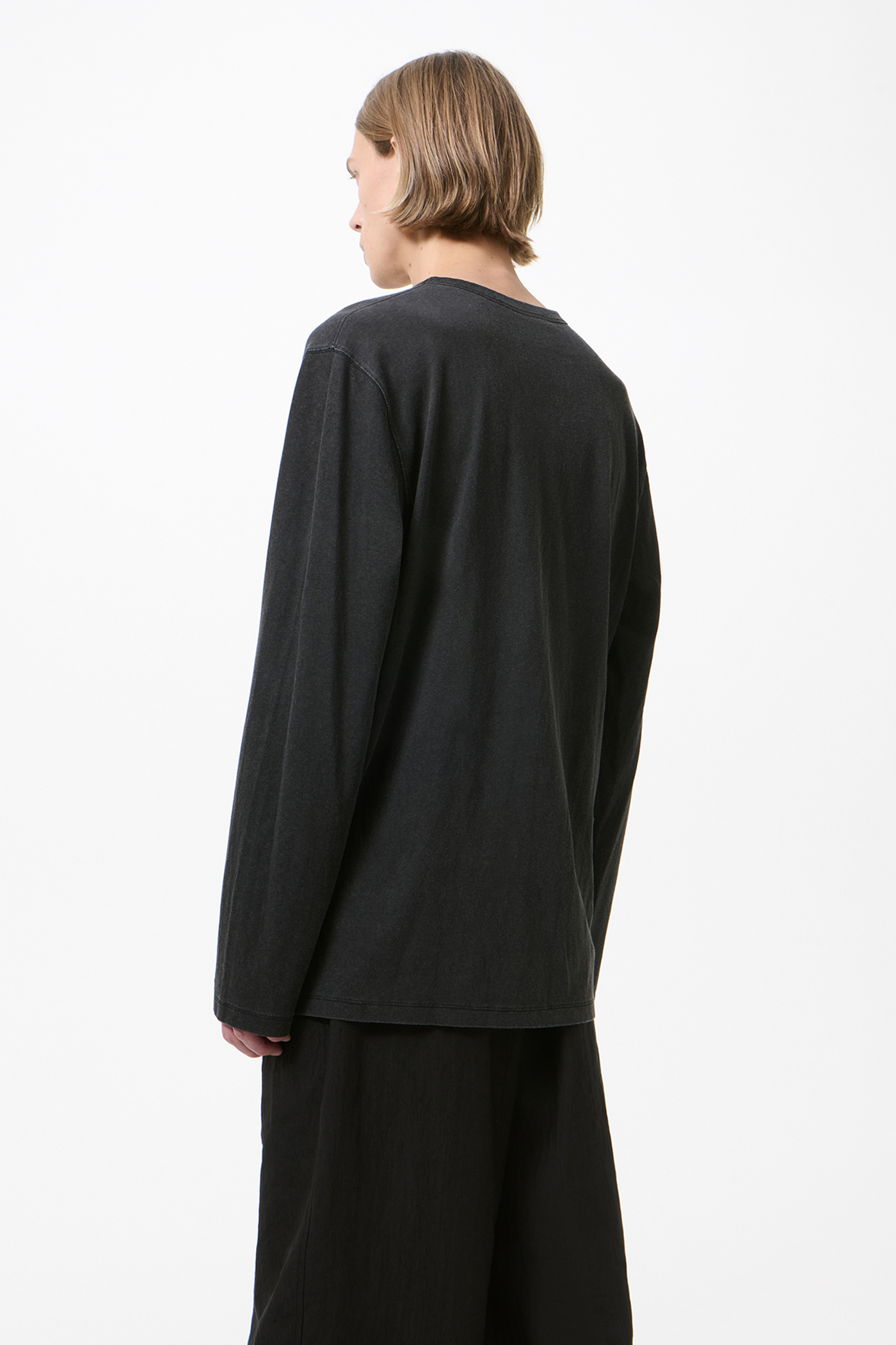 Our Gorge Longsleeve in Black 1000 Points Print. Produced in Portuguese cotton jersey with pigment printing, the men's Gorge Longsleeve has an oversized boxy fit and features a ribbed V-neck collar, vented side seams and a dropped tail with the back longer than the front.