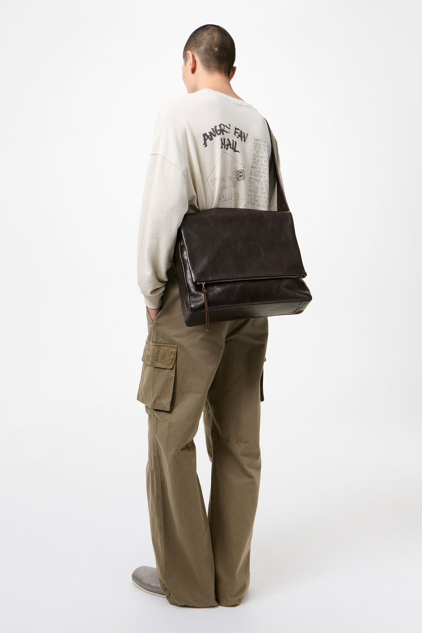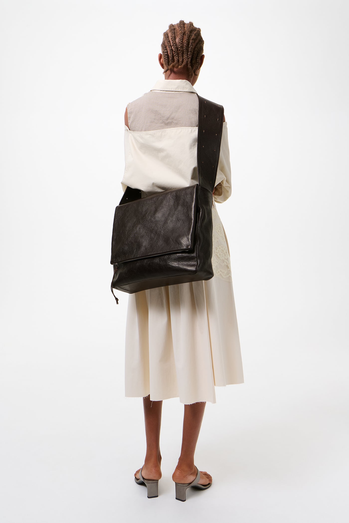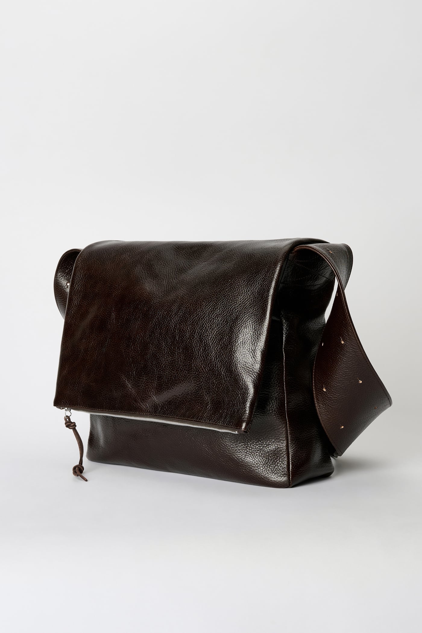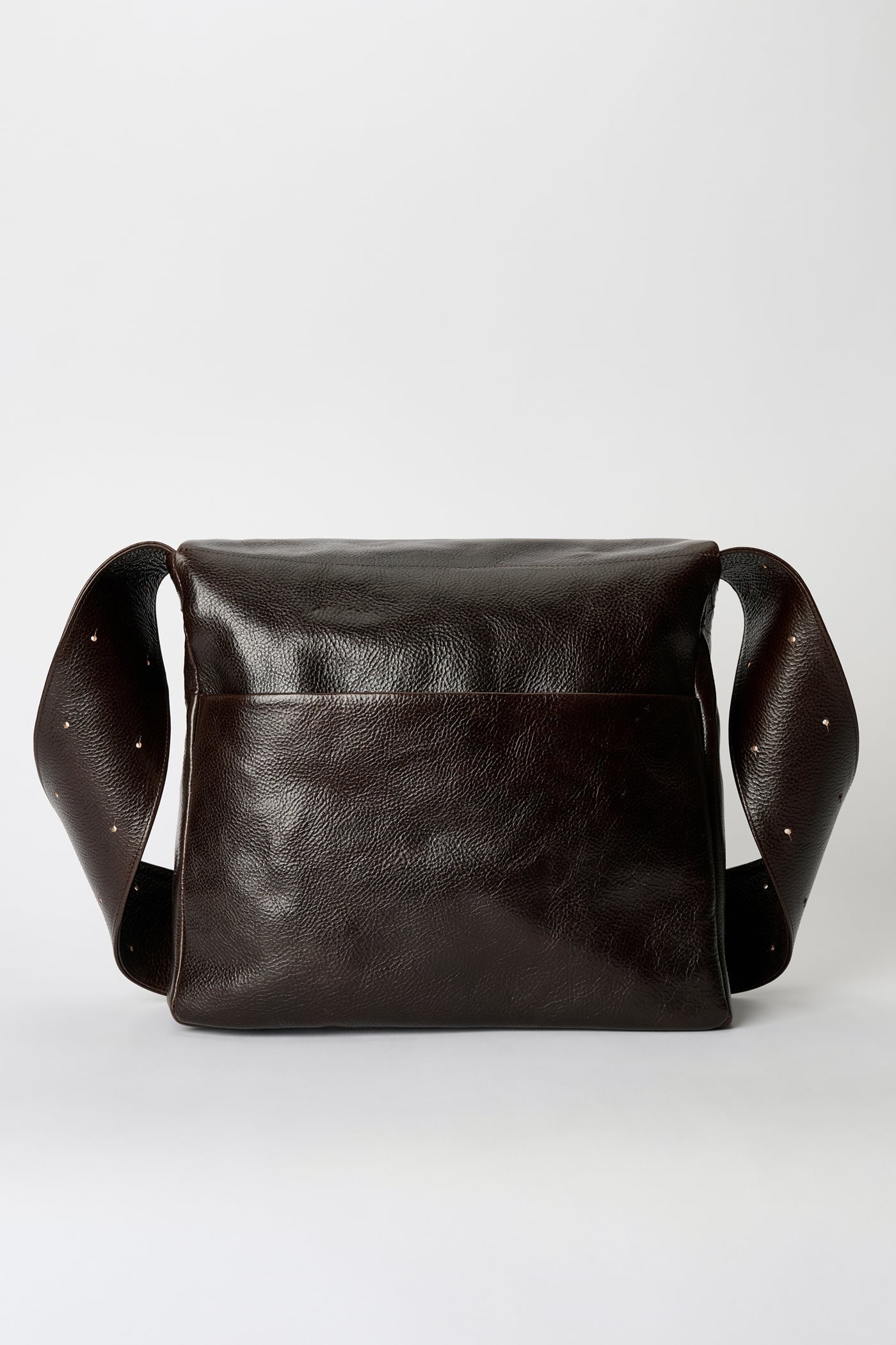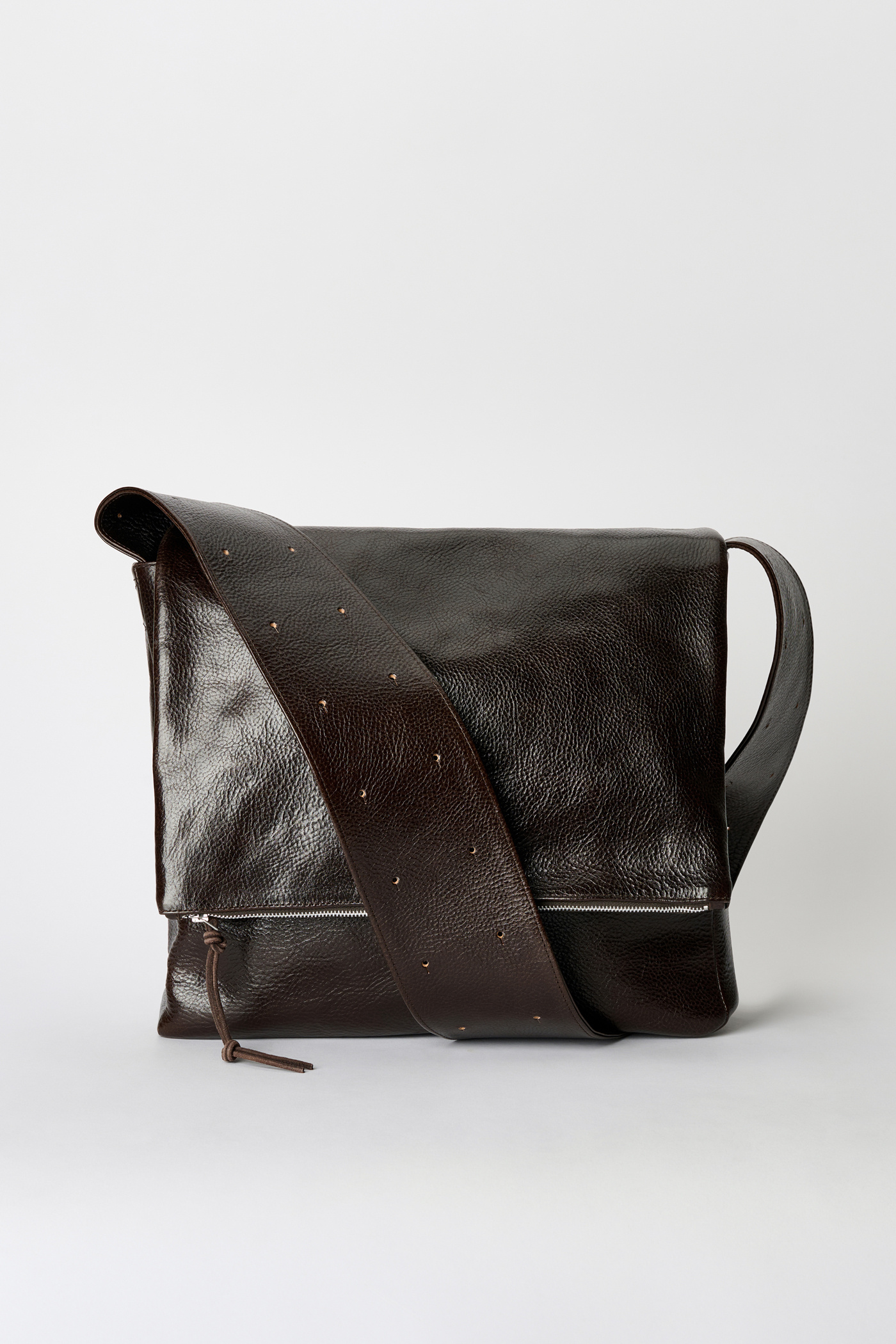 Our Grande Savant Bag in Deep Americano Leather. Produced in Italian vegetable-tanned full grain cow leather, the Grande Savant Bag features a tote-sized silhouette with a convertible strap designed with Chicago screws and adjustment holes for crossbody or handheld wear, a zip along the flap edge, and a front panel pocket that allows the flap to be neatly tucked away.