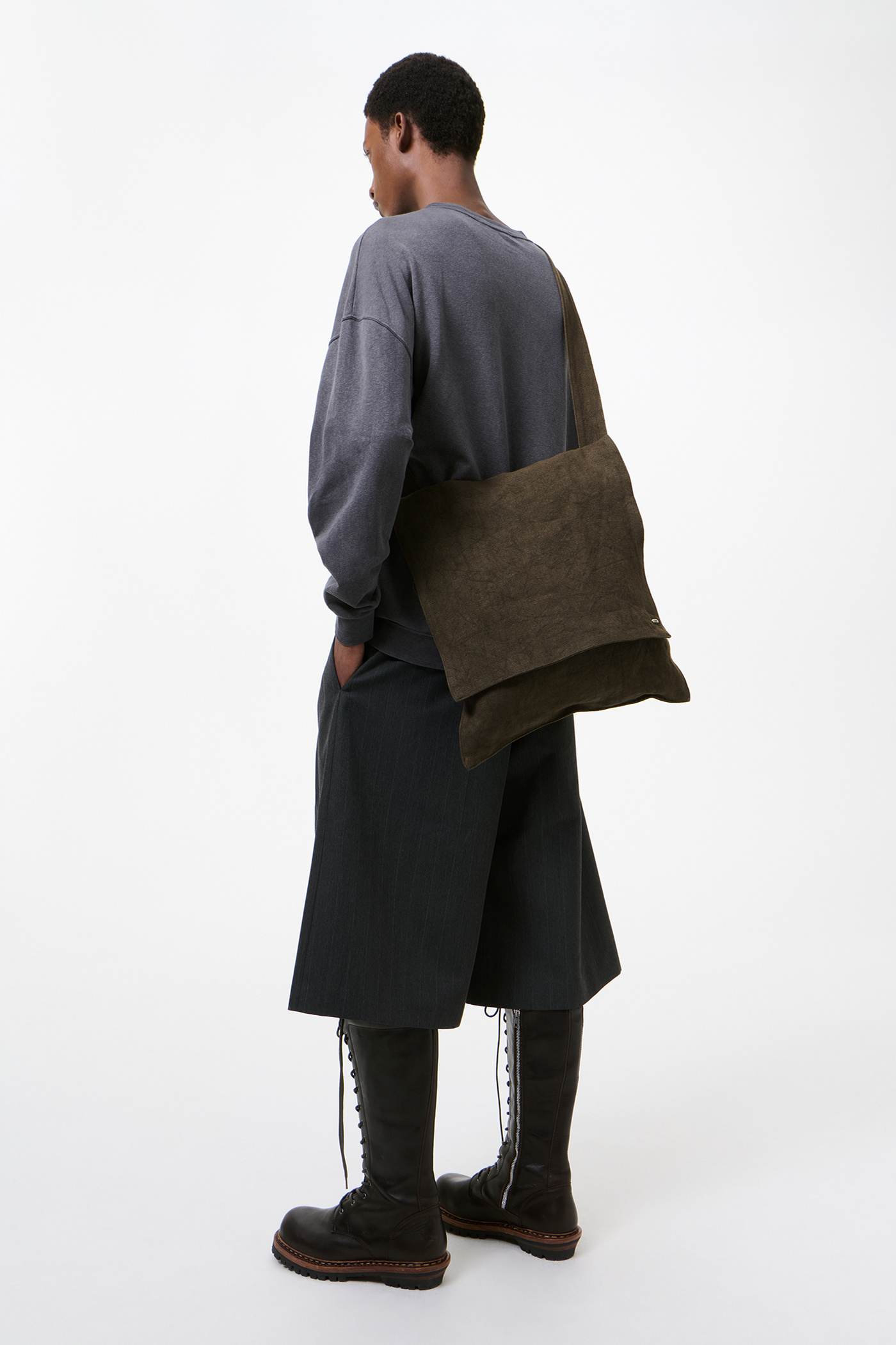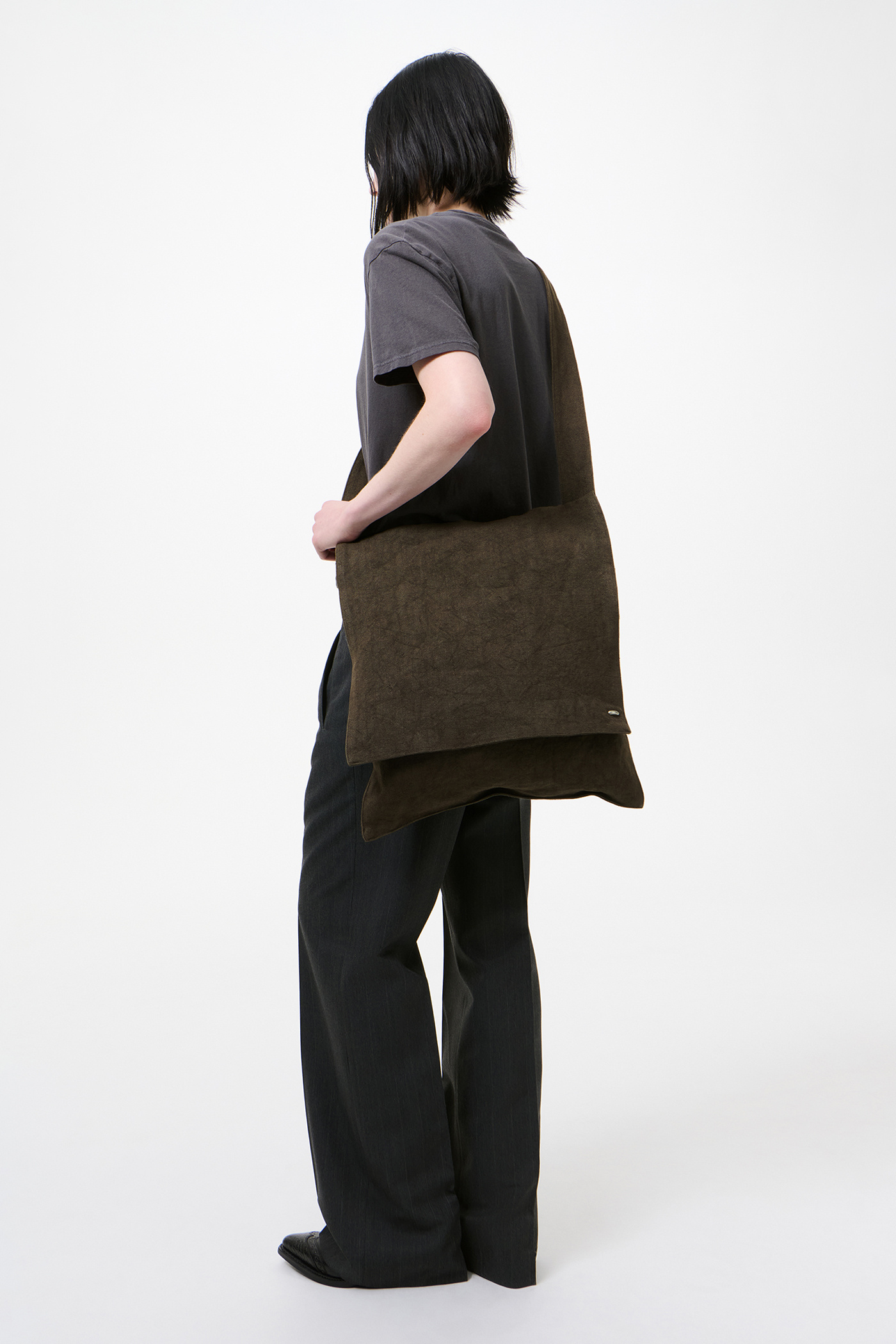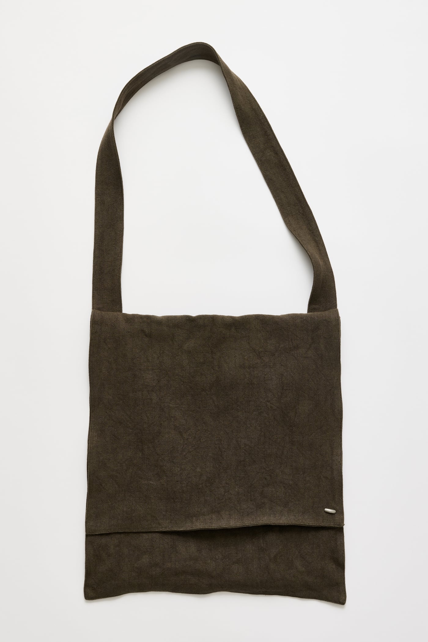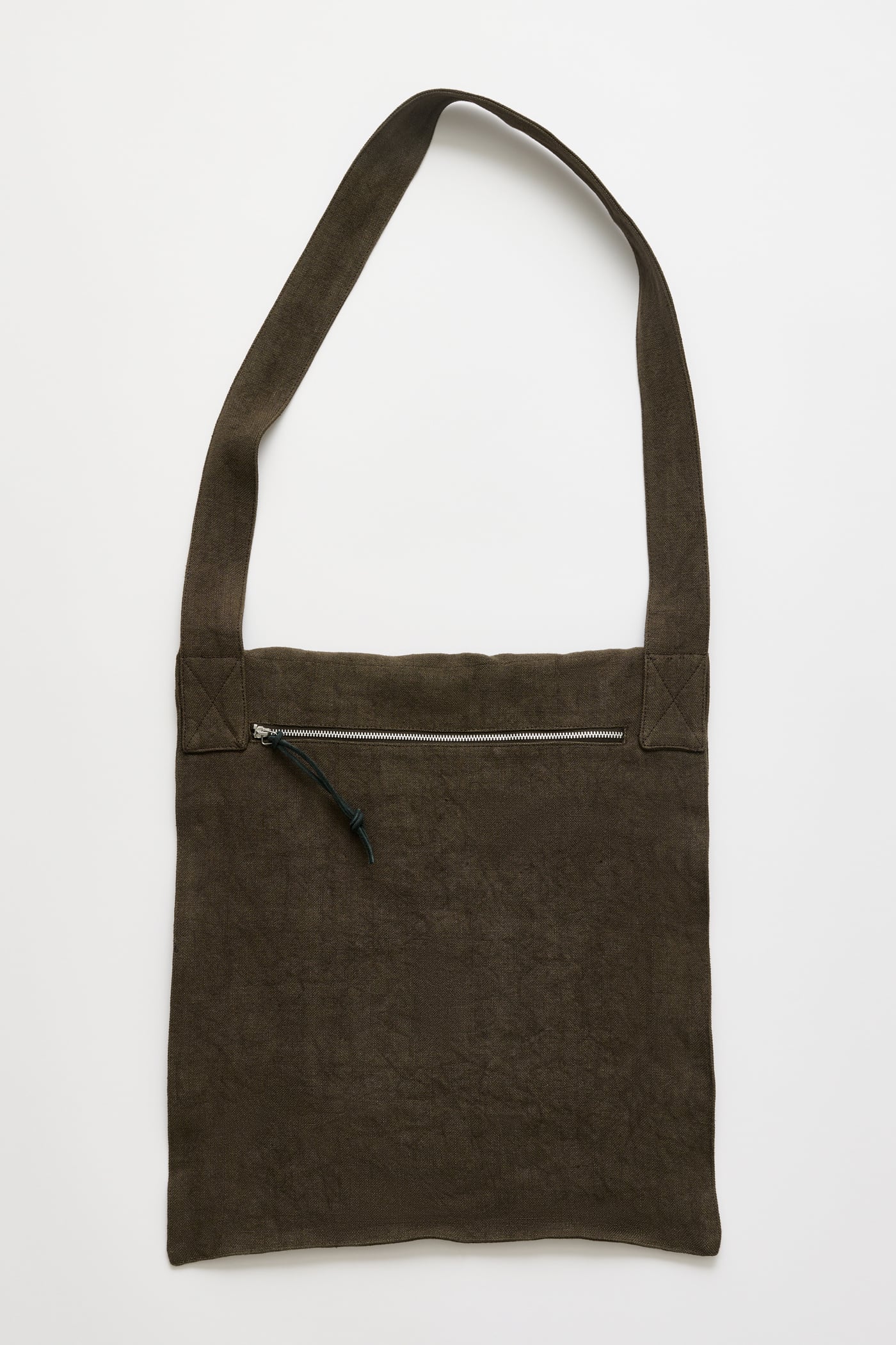 Our Grande Slack Bag in Dry Olive Airy Linen. Produced in a Japanese linen fabric, the oversized flat crossbody bag features a flap closure, a shoulder strap secured to the back panel with a zipped pocket, and an internal welt pocket.