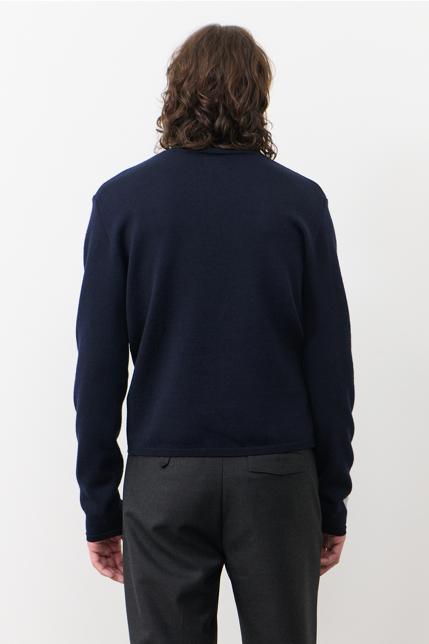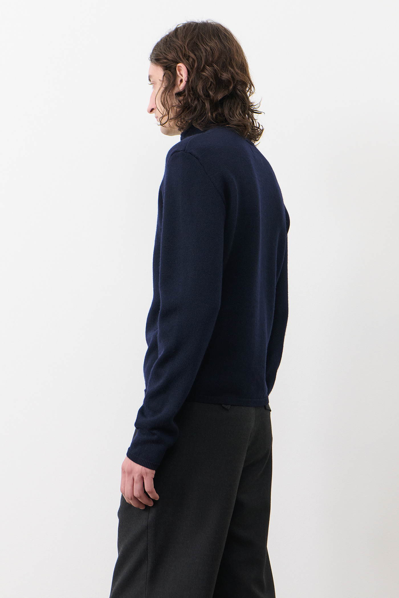 Guapa Knit in Total Eclipse. Guapa knit is crafted from Italian virgin wool for the collaboration between Our Legacy WORK SHOP and C.P. Company. Designed through research in the Massimo Osti archive, Guapa knit is referencing archival knitwear details translated to a classic Our Legacy fit. Featuring a funnel neck, hidden Lampo half zip opening and yarn dyed. Regular fit.