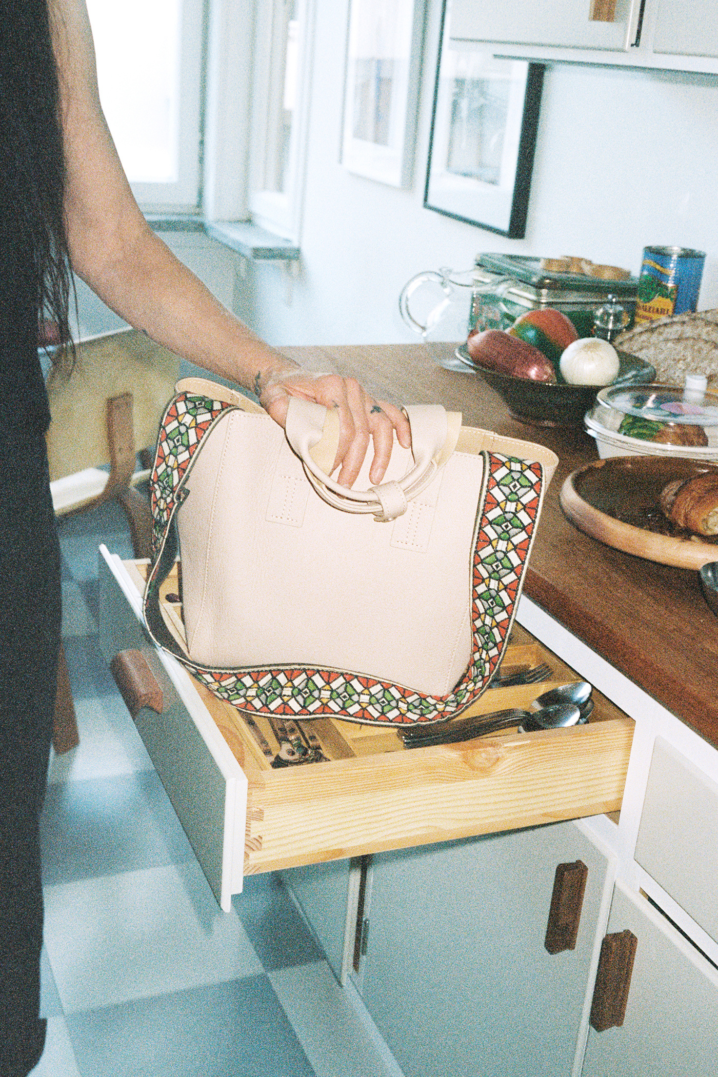 Our Guitar Strap in 70s Ornament Jacquard. Upcycled in Stockholm from a vintage guitar strap, this accessory showcases an ornamental jacquard pattern embroidery and is designed to fit the Work Shop bag range.