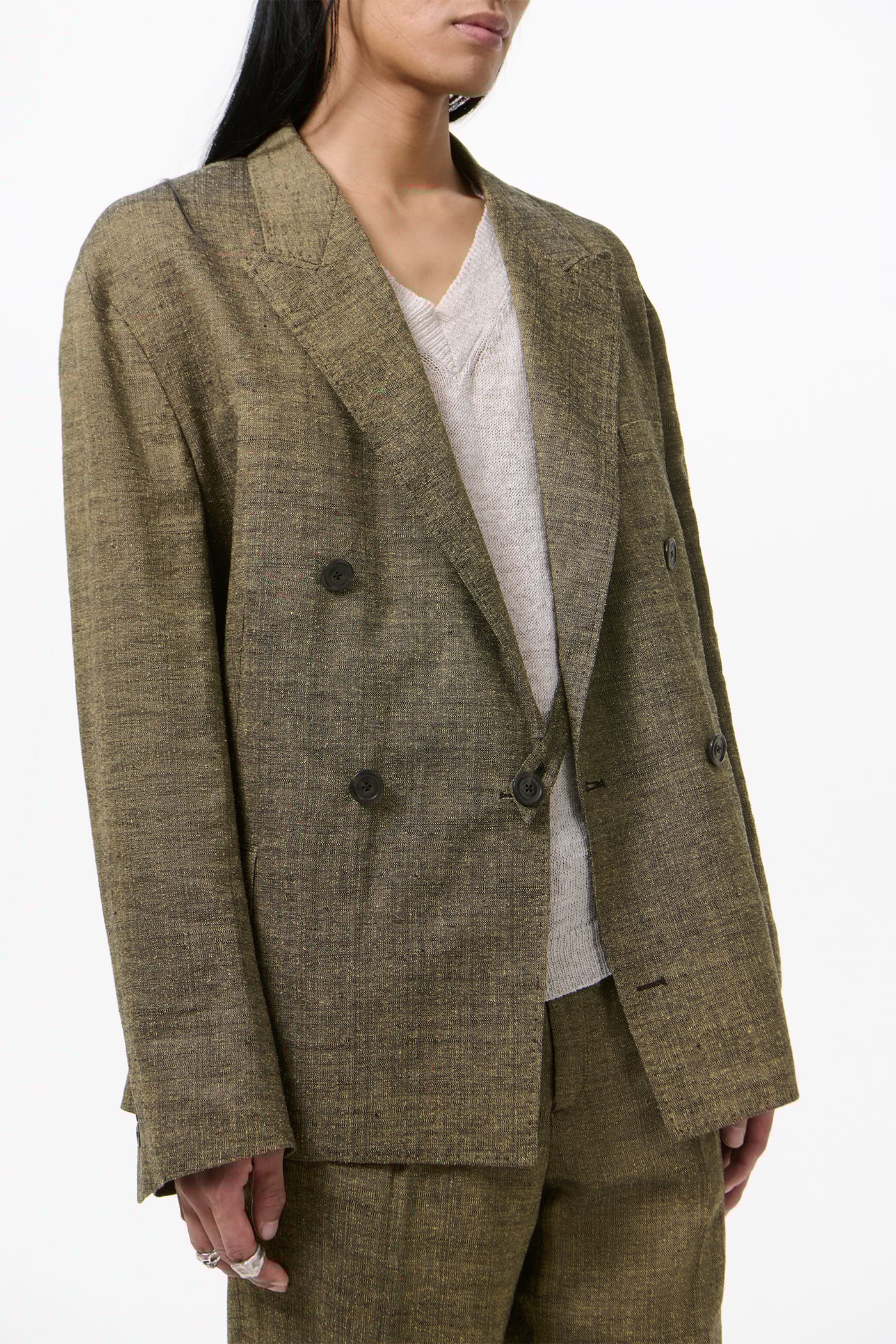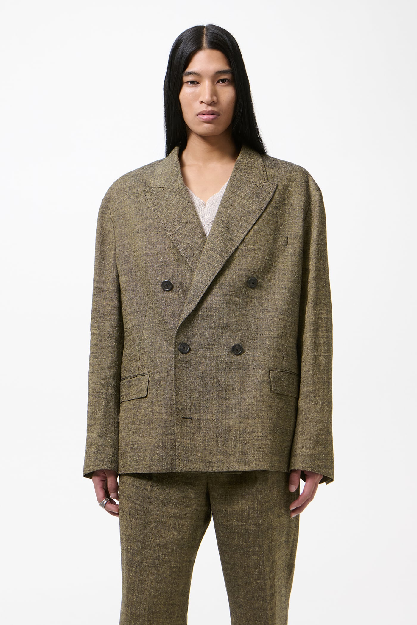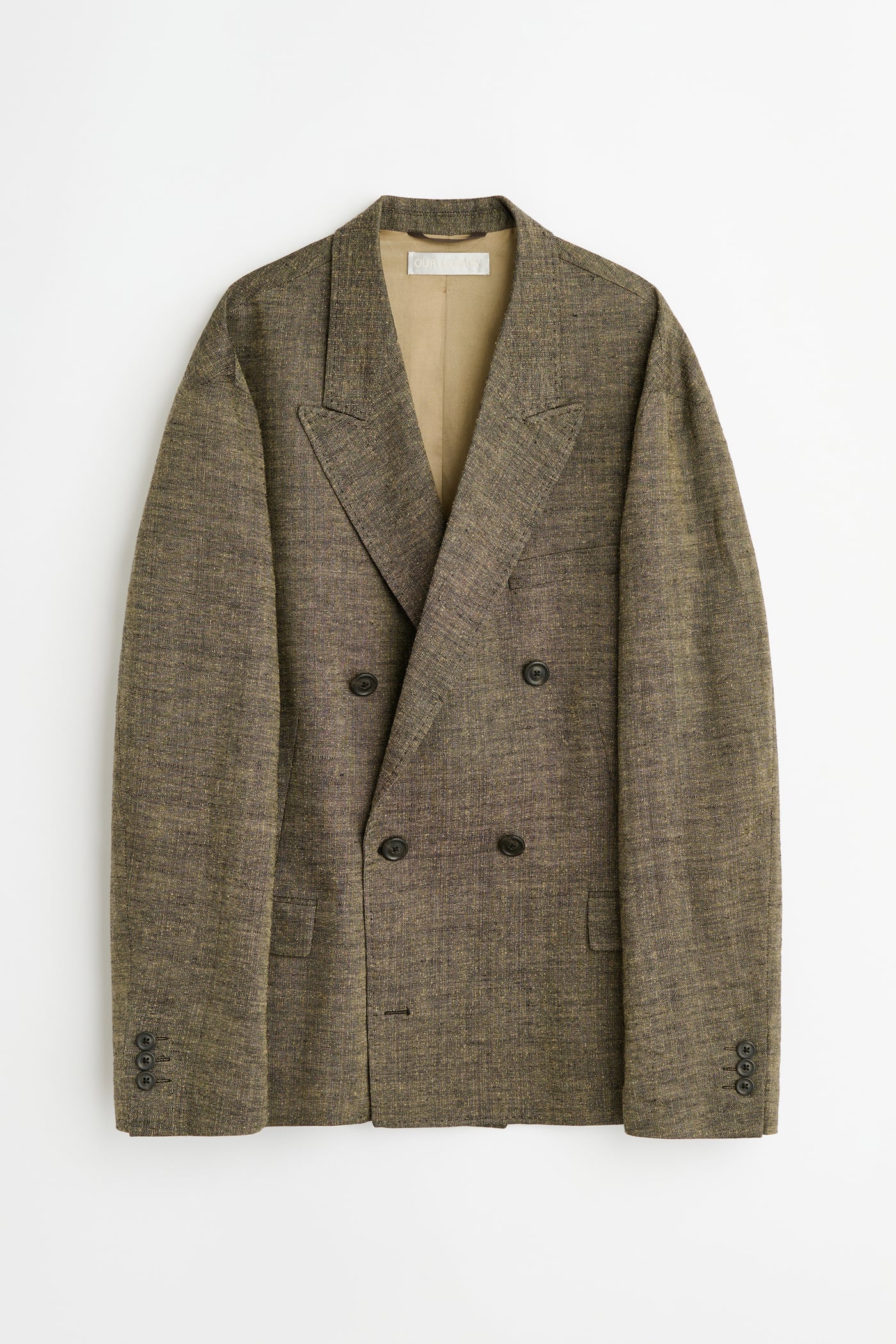 Our Halt Blazer in Deep Husk Soft Grain Weave. Produced in an Italian linen, silk and cotton blend fabric, the men's Halt Blazer is a relaxed, oversized double breasted jacket with a dropped break point, fully lined yet unconstructed with a reinforced front to maintain a sharp lapel and collar. It fastens with an inside strap to double shanked buttons, can be secured either internally or towards the outside, and is finished with low placed pockets with shallow pocket bags, two inside jet pockets and a fake buttonhole detail.