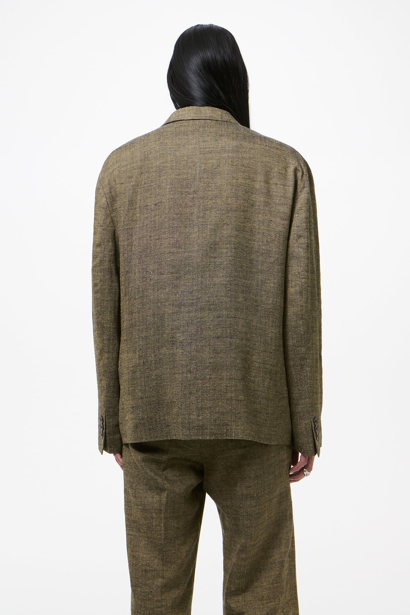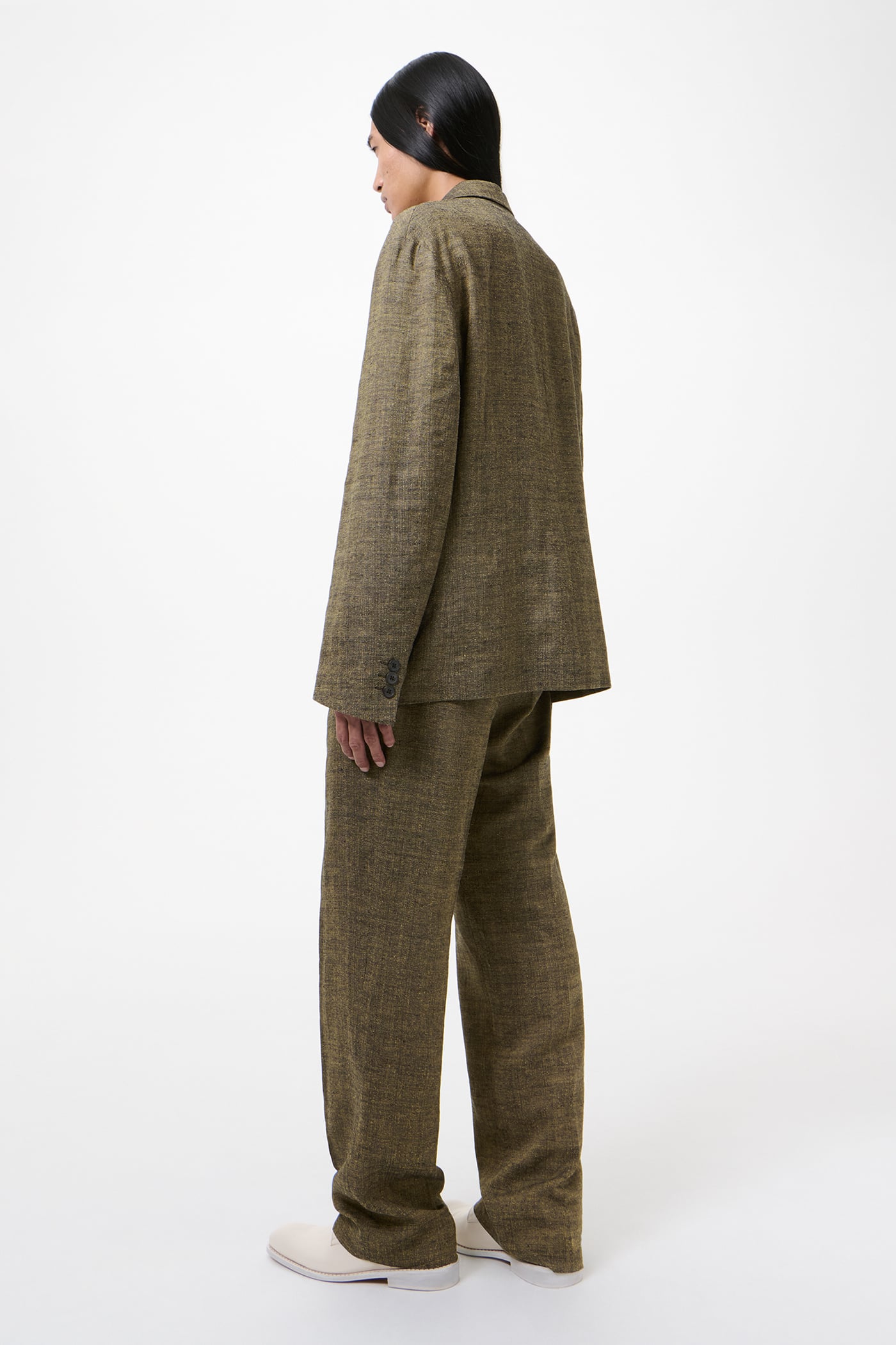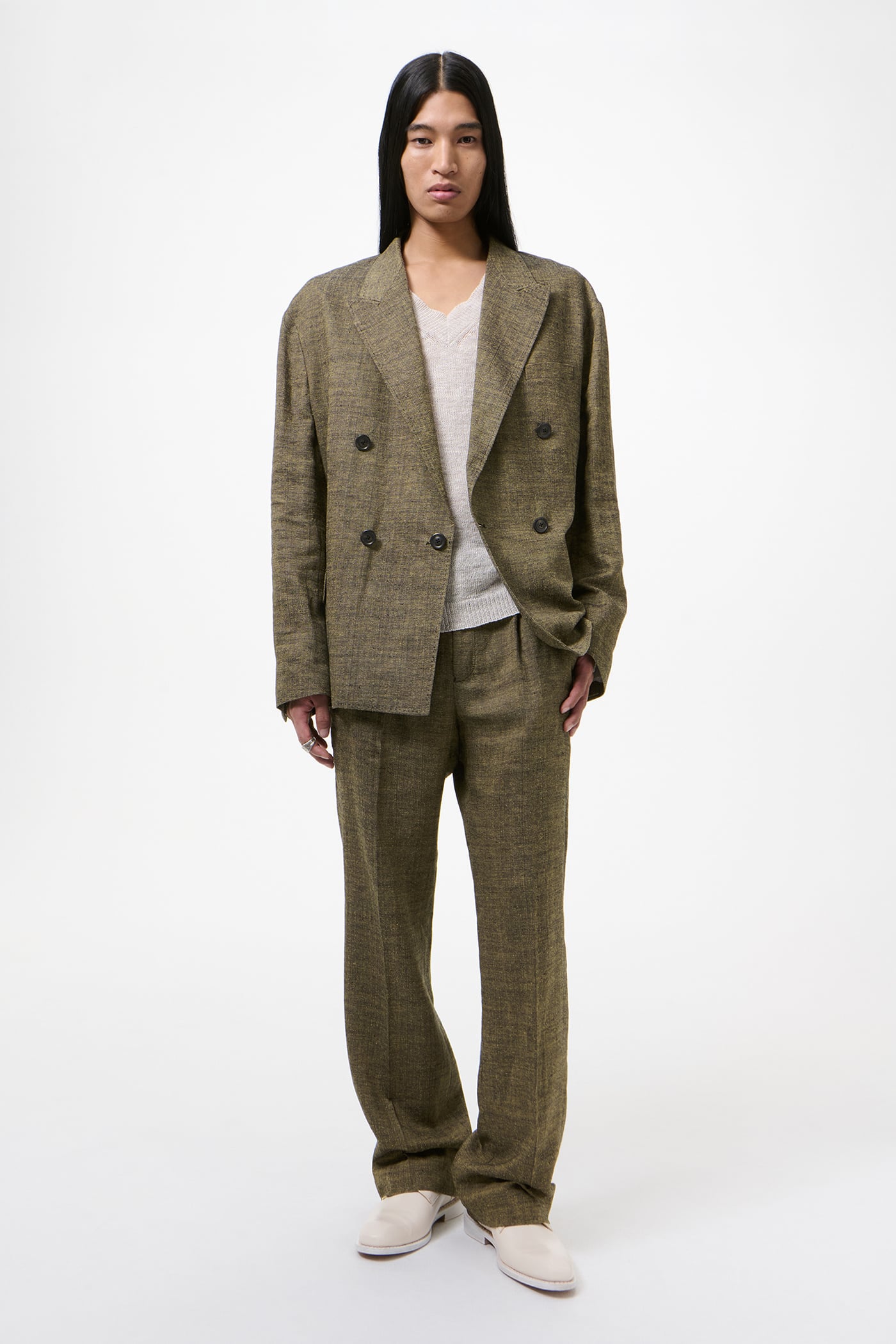 Our Halt Blazer in Deep Husk Soft Grain Weave. Produced in an Italian linen, silk and cotton blend fabric, the men's Halt Blazer is a relaxed, oversized double breasted jacket with a dropped break point, fully lined yet unconstructed with a reinforced front to maintain a sharp lapel and collar. It fastens with an inside strap to double shanked buttons, can be secured either internally or towards the outside, and is finished with low placed pockets with shallow pocket bags, two inside jet pockets and a fake buttonhole detail.