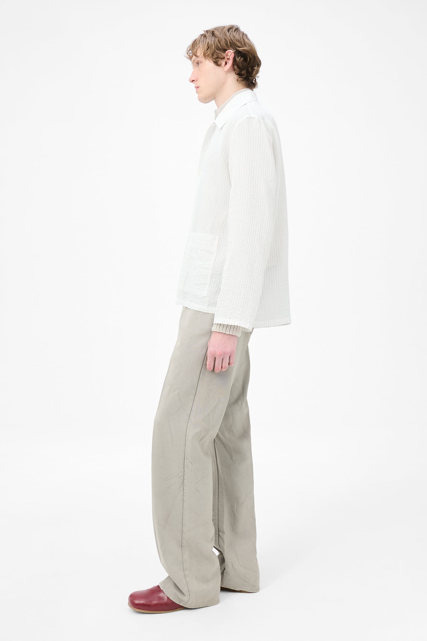 Our Haven Jacket in Baws Stripe Holiday Viscose. Produced in an Italian viscose, polyamide and cotton blend fabric with a textured fine stripe, the men's Haven Jacket has a relaxed, unconstructed fit and features two front pockets, mother of pearl buttons and a spread collar.