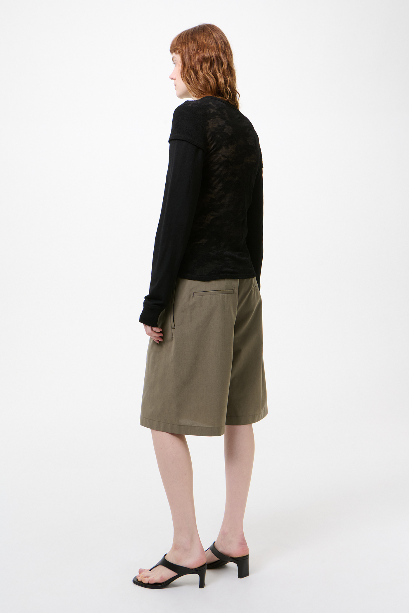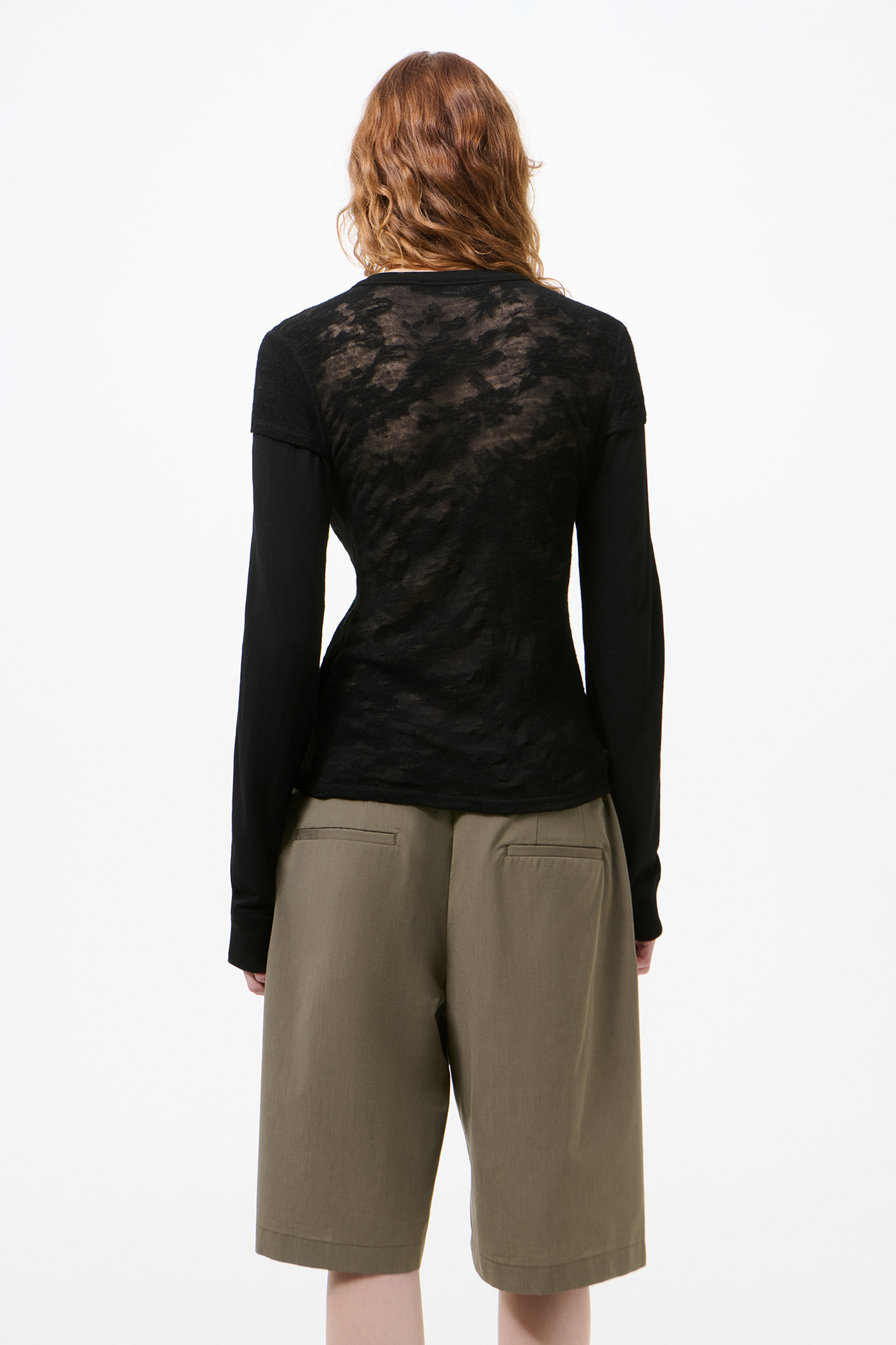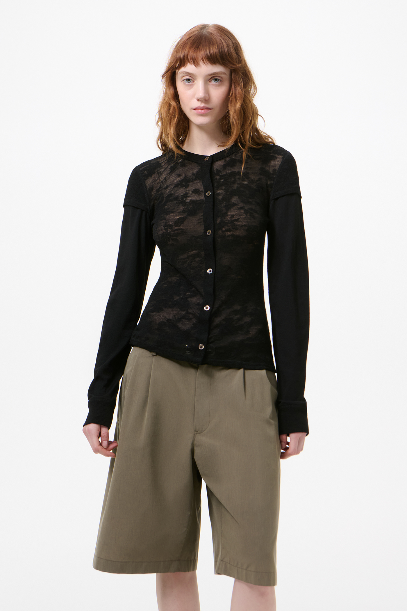 Our Heat Longsleeve in Black Flower Jacquard Gauze. Produced in Italian merino wool fabric, the women's Heat Longsleeve has a slim fit and features a unique layered construction that creates the illusion of wearing a short sleeve cardigan over a longsleeve top. The design includes a double sleeve, clean button placket with mop buttons, ribbed collar and cuffs, and a straight hem.