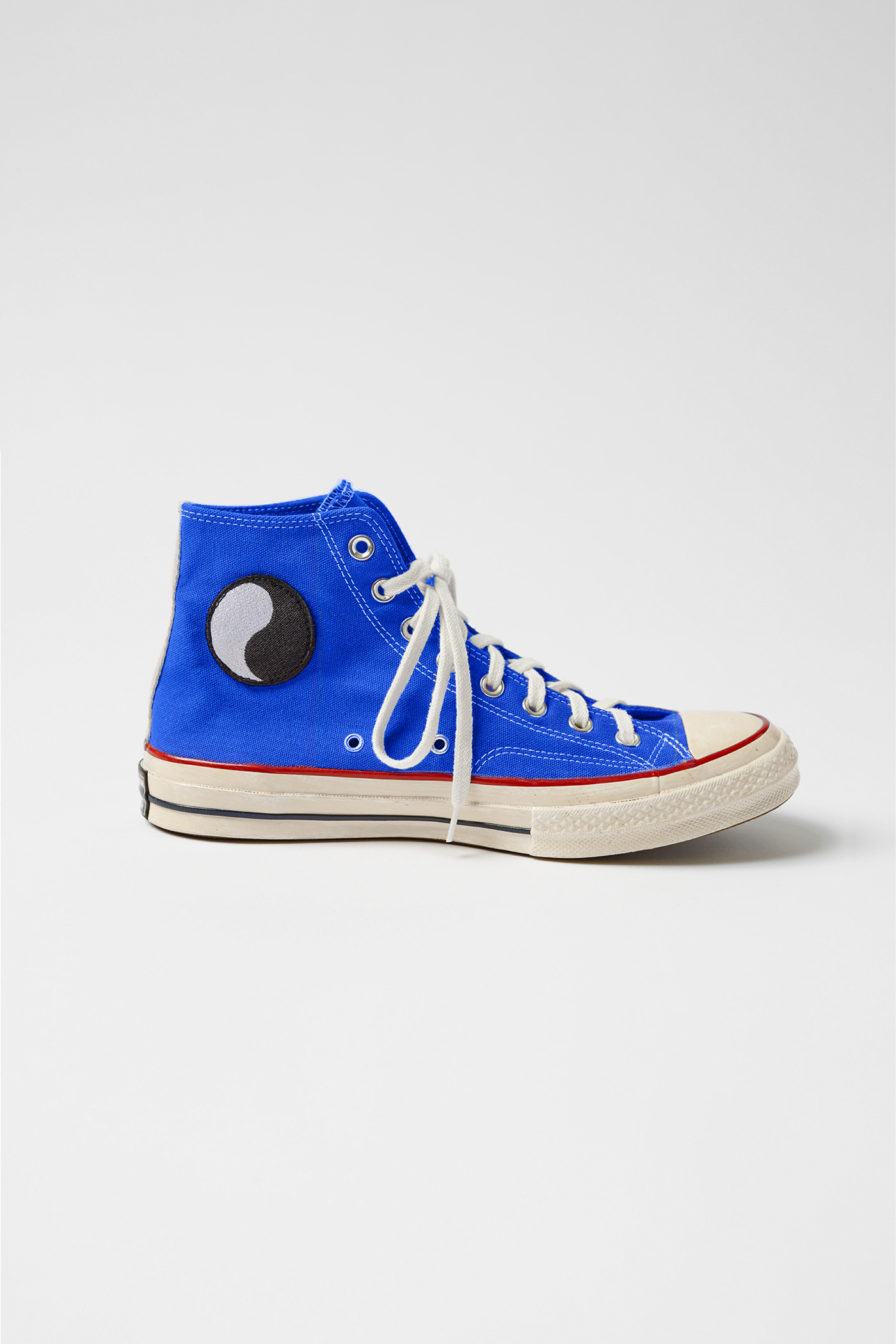 Work Chucks in Baltic. A Chuck 70´s high, upcycled and overdyed in WORK SHOP Stockholm. Yin Yang logo patched. The shoes are listed in US sizes.