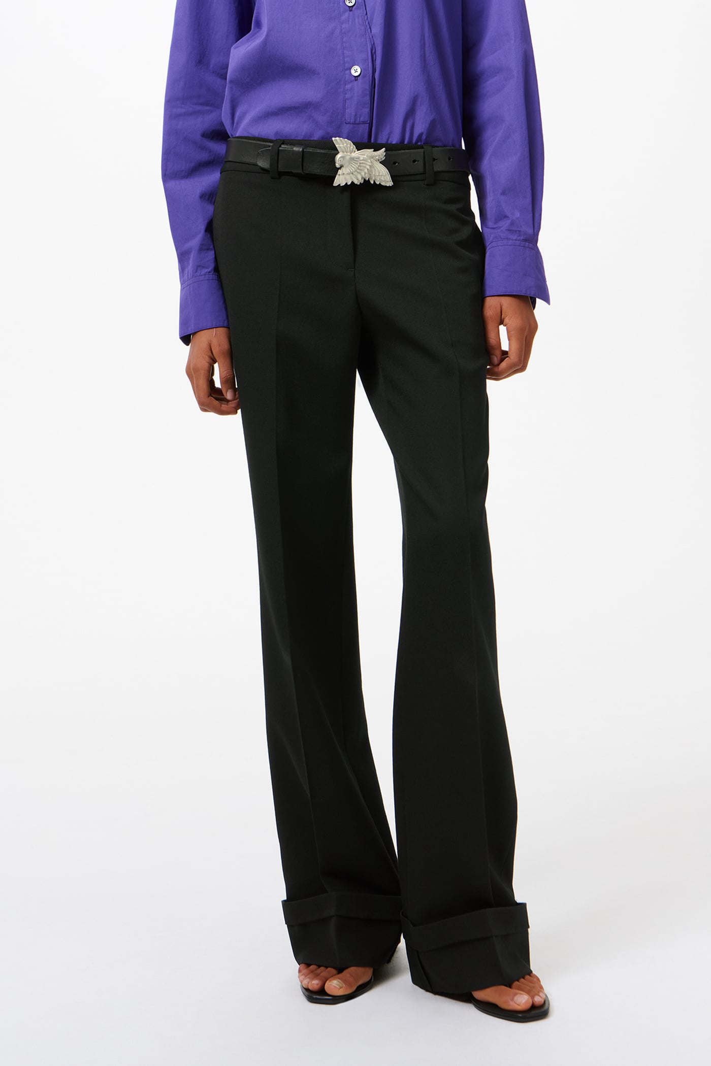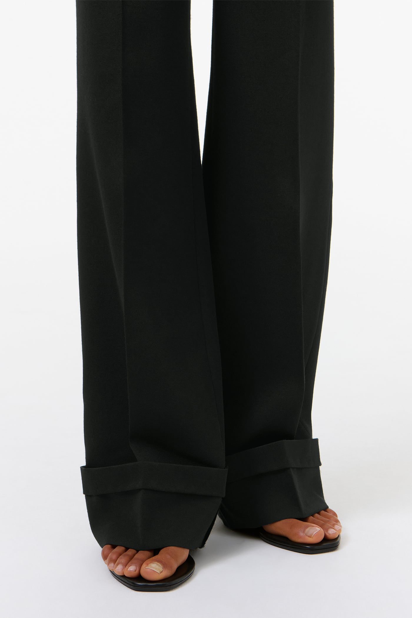 Our Hip Trouser in Coarse Black Gabardine. Produced in Italian virgin wool gabardine fabric, the women's Hip Trouser has a low rise with a straight fit and features side seam pockets, a horn button, pressed creases, a stitched folded hem and a YKK zip fly. The densely woven gabardine construction offers durability and structure while maintaining the refined drape characteristic of premium wool suiting.