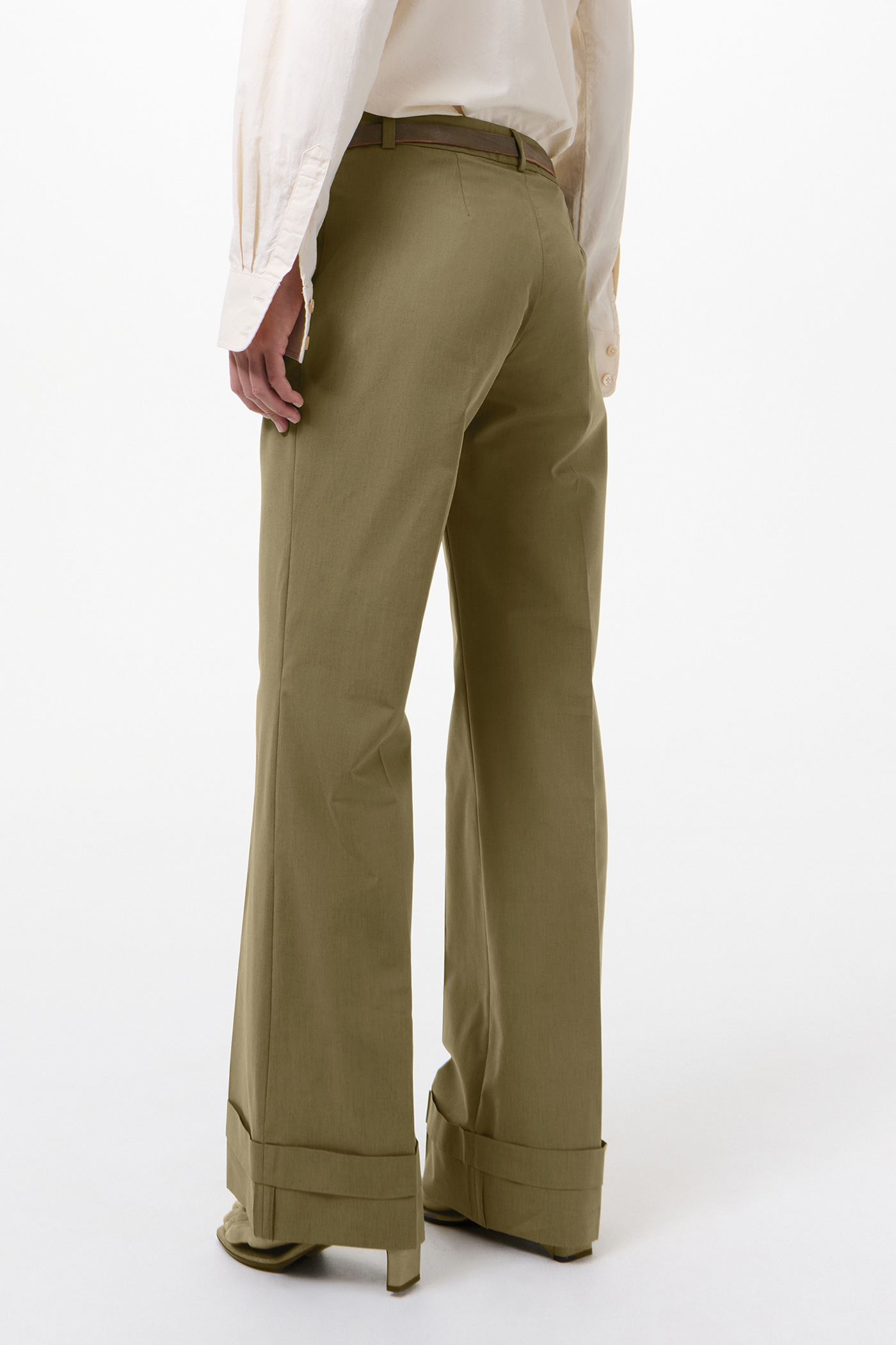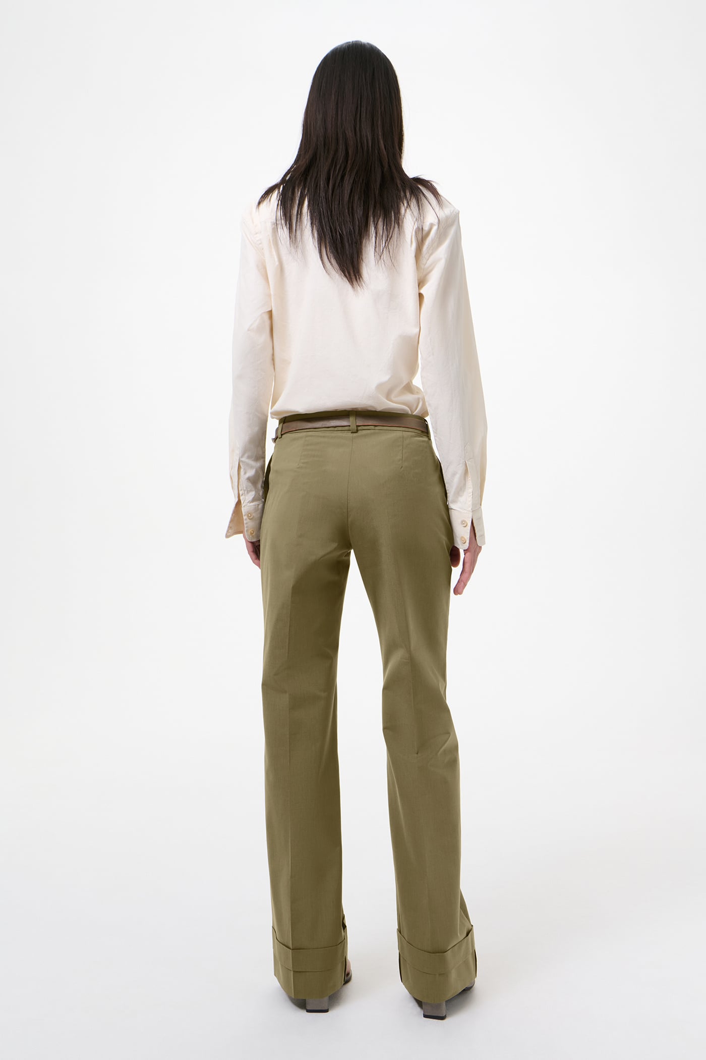 Our Hip Trouser in Dry Leaf Balance Woolcot. Produced in an Italian virgin wool and cotton blend fabric with a dry leaf tone, the women's Hip Trouser has a low rise, straight fit and features pressed creases, a stitched fold-up hem, side seam pockets, a horn button and a zip fly.