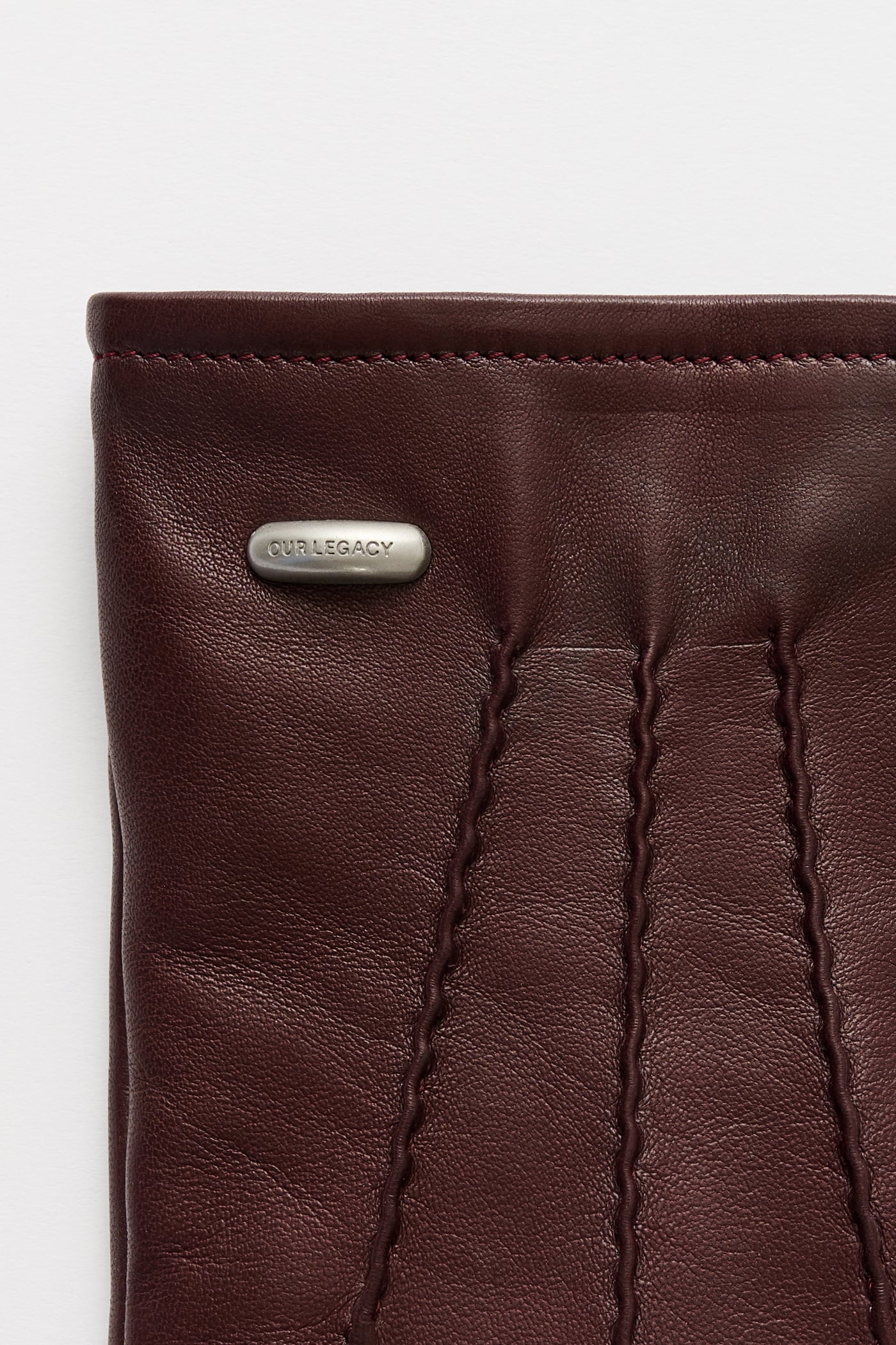 Our His Gloves in Bordeaux Nappa. Produced in Italian nappa lamb leather, the His Gloves feature an Our Legacy metal rivet, twin needled top stitch, elastic zig zag stitch and wool lining.