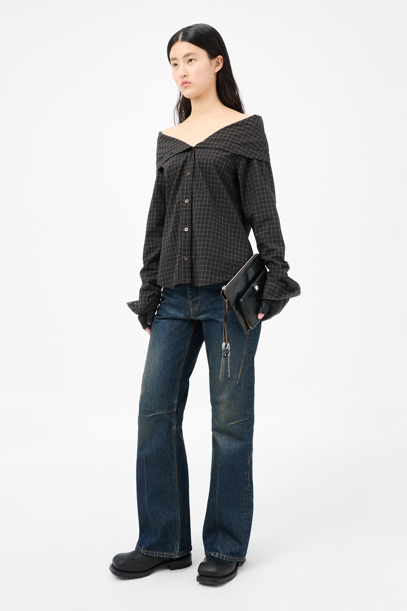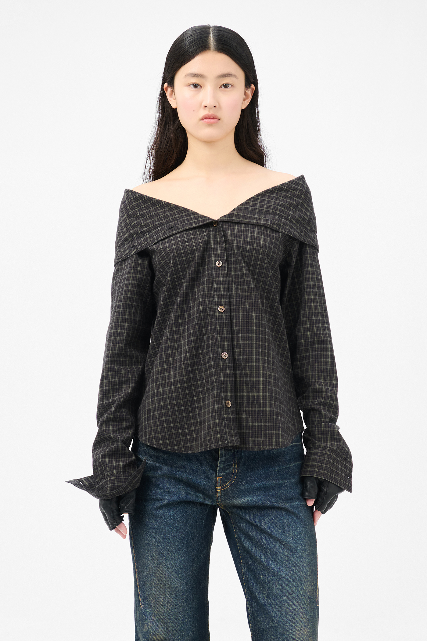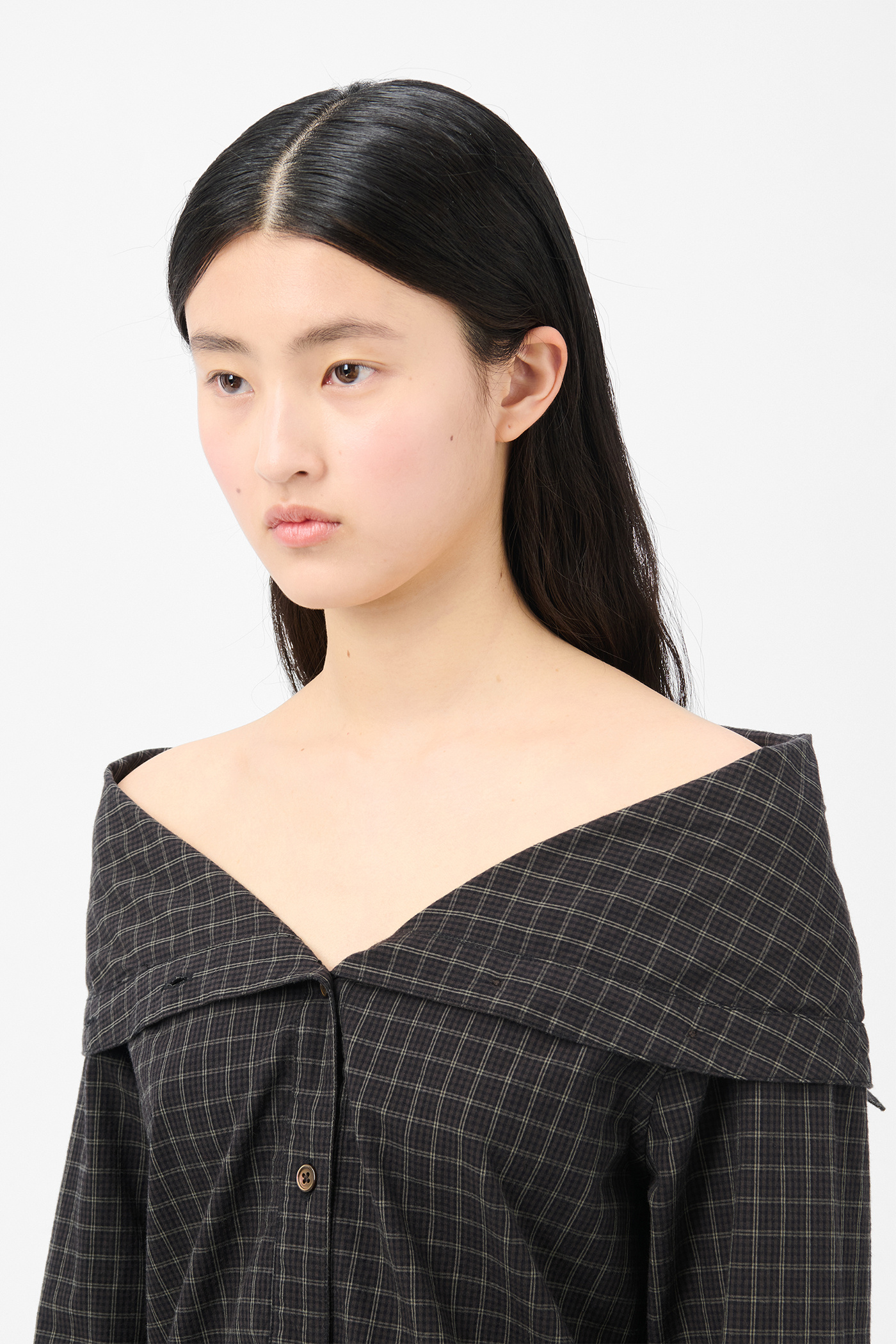 Our Kaonashi Shirt in Black Faux Lumberjack Check. Produced in Japanese cotton fabric with a faux lumberjack check pattern, the women's Kaonashi Shirt has a regular fit and features a collapsed collar, mother of pearl buttons and a curved hem.