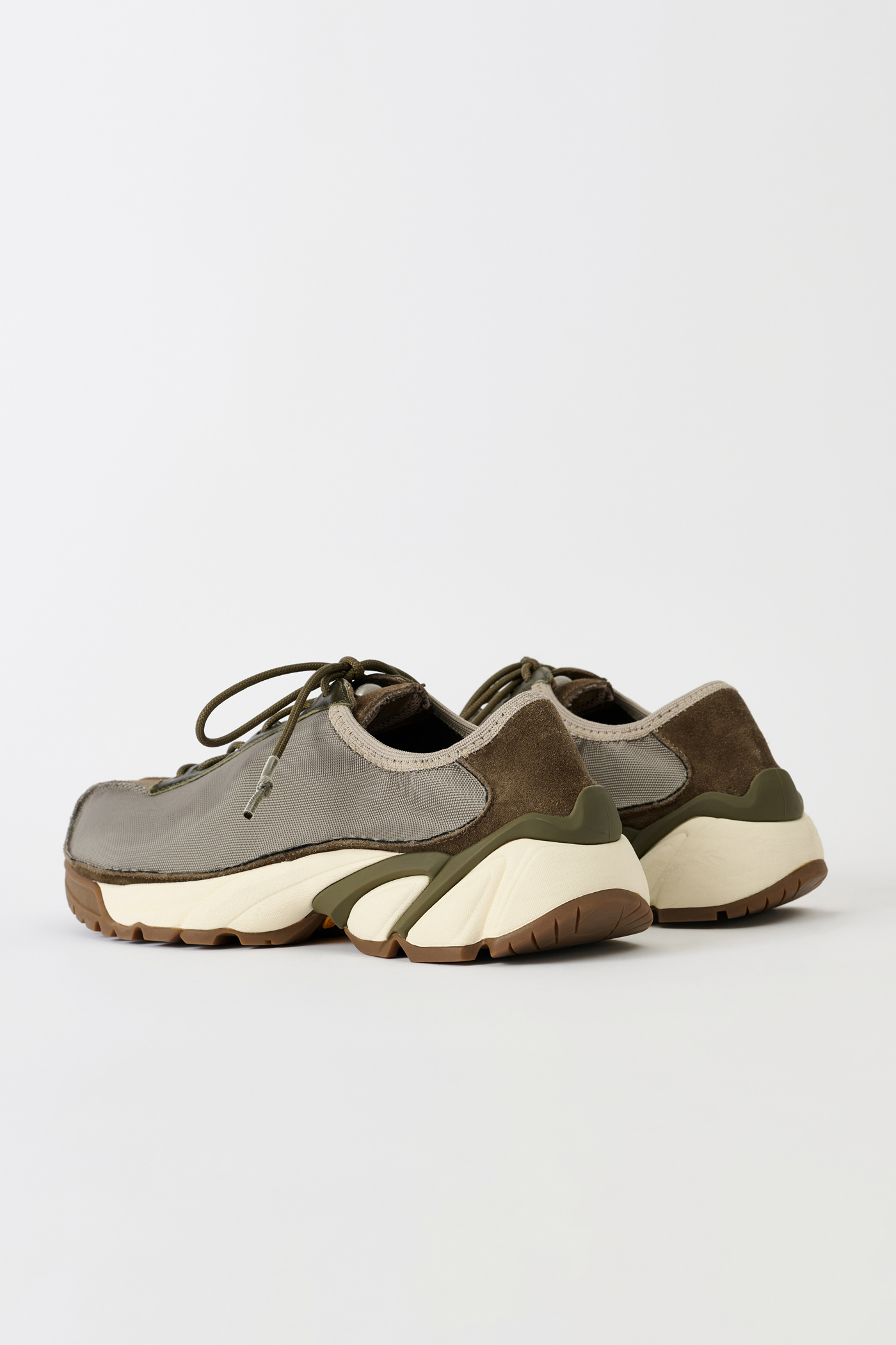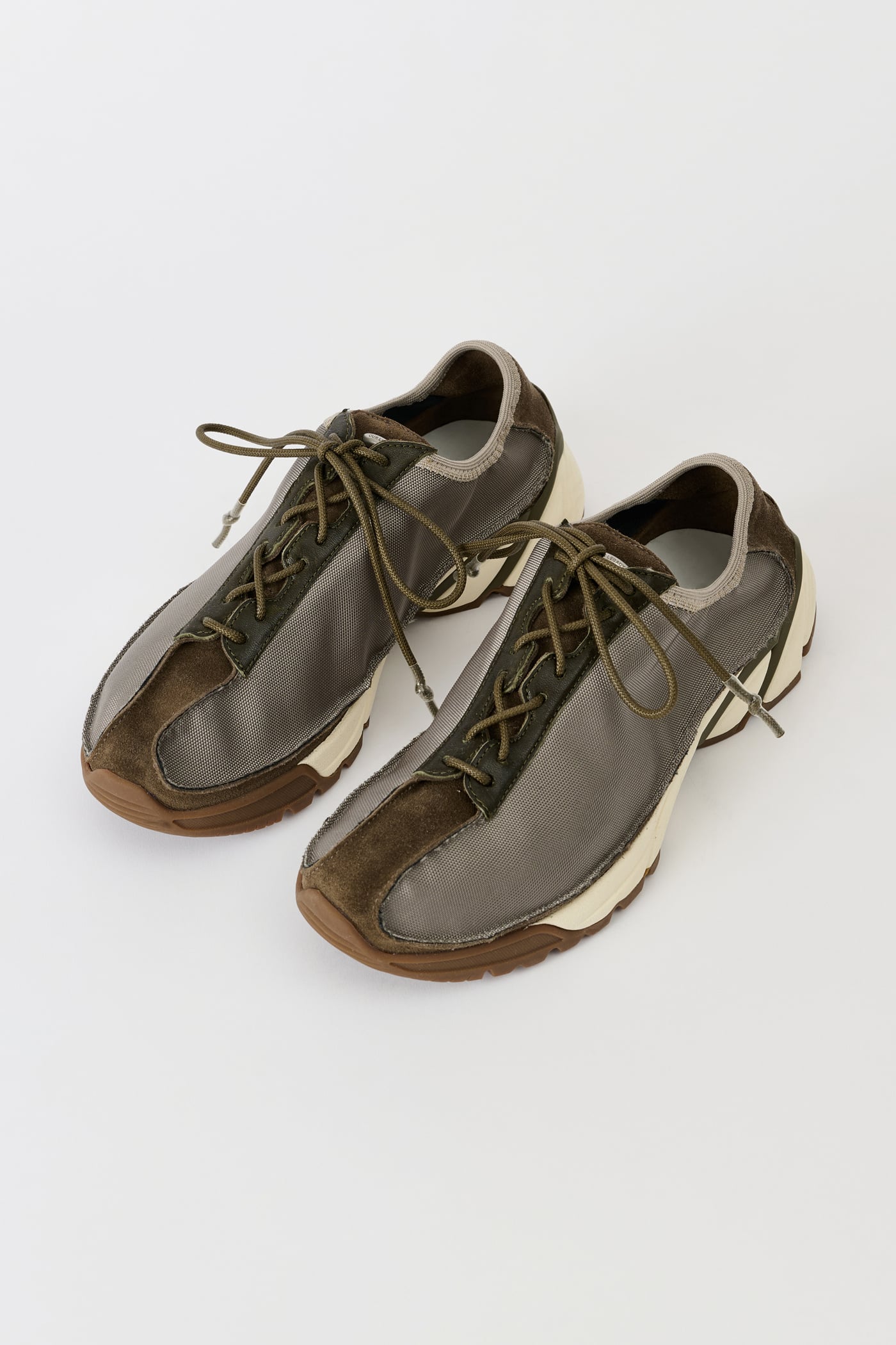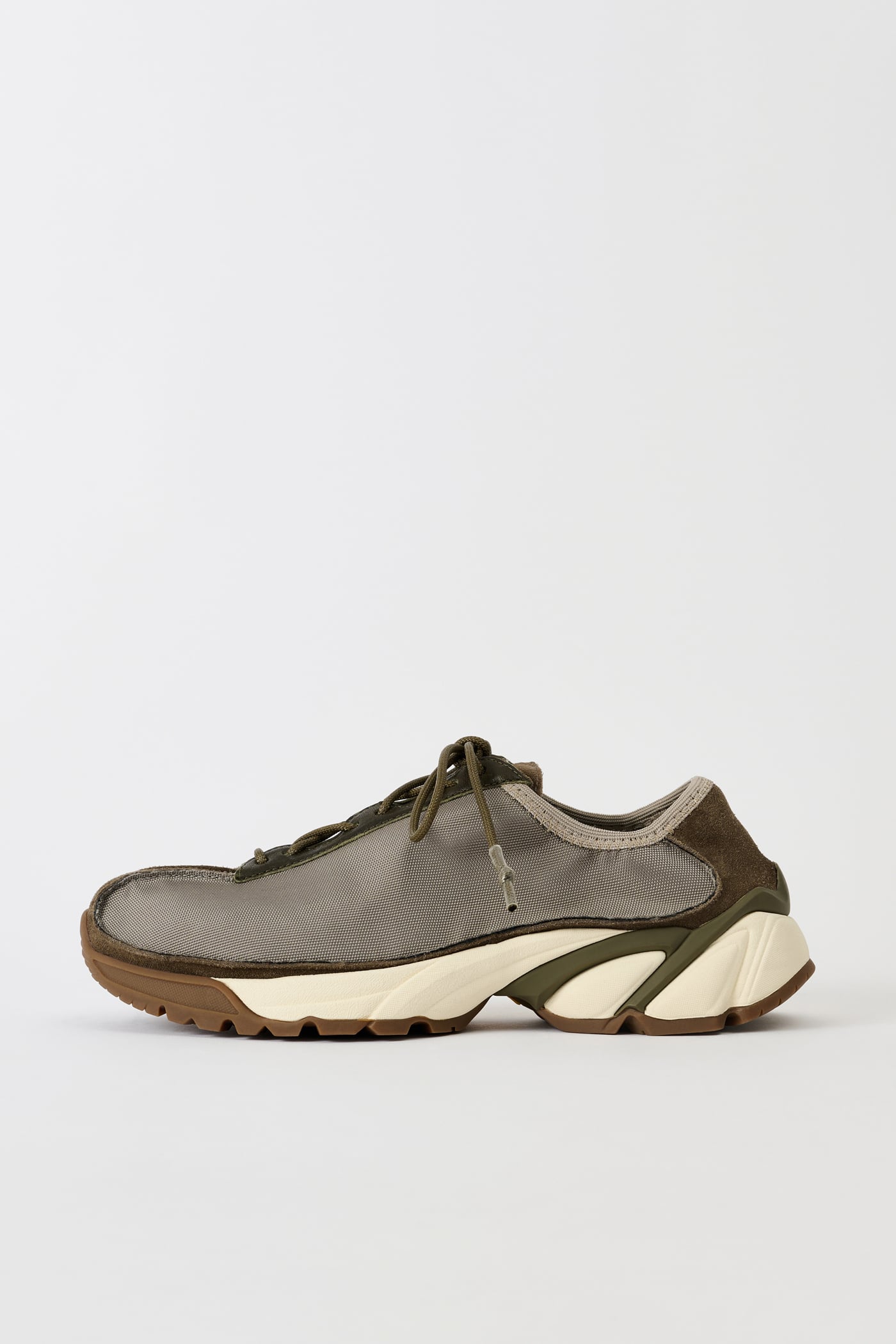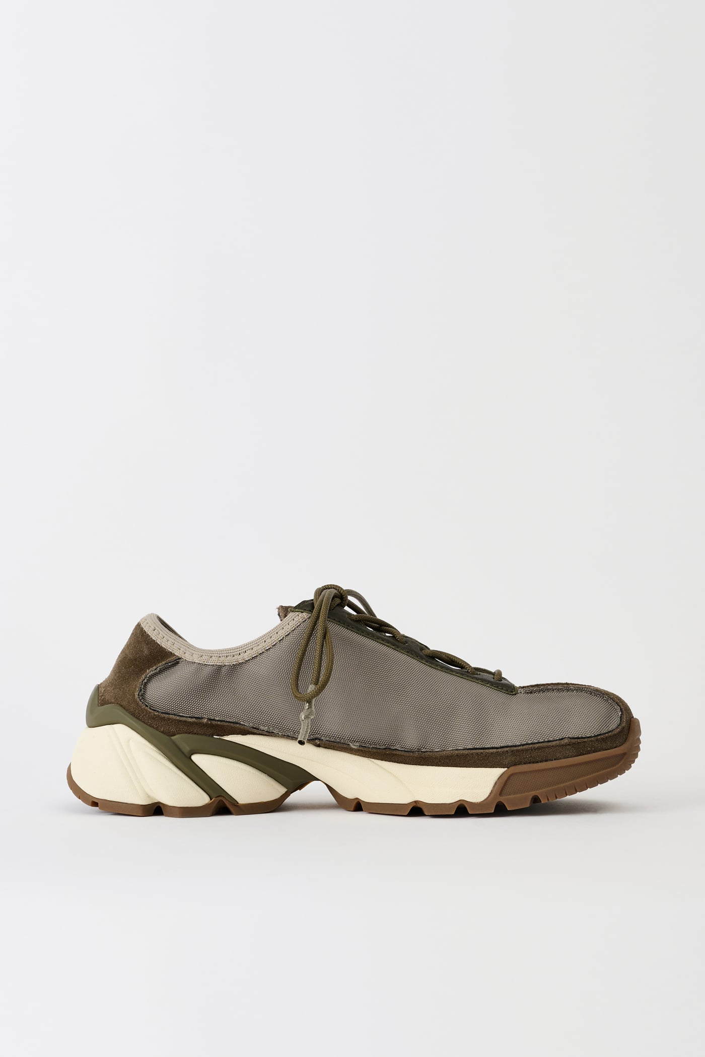 Our Klove in Silvergreen Chromatic Poly. Produced with polyester panels backed with cotton, suede panels and leather trims with a leather heel panel, the Klove has a generous fit and is set on a Vibram sole. The sneaker features rounded laces with rubber coated tips and a metal OUR LEGACY rivet on the tongue.