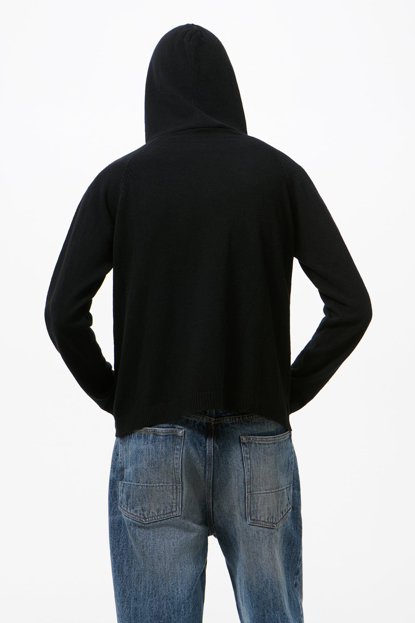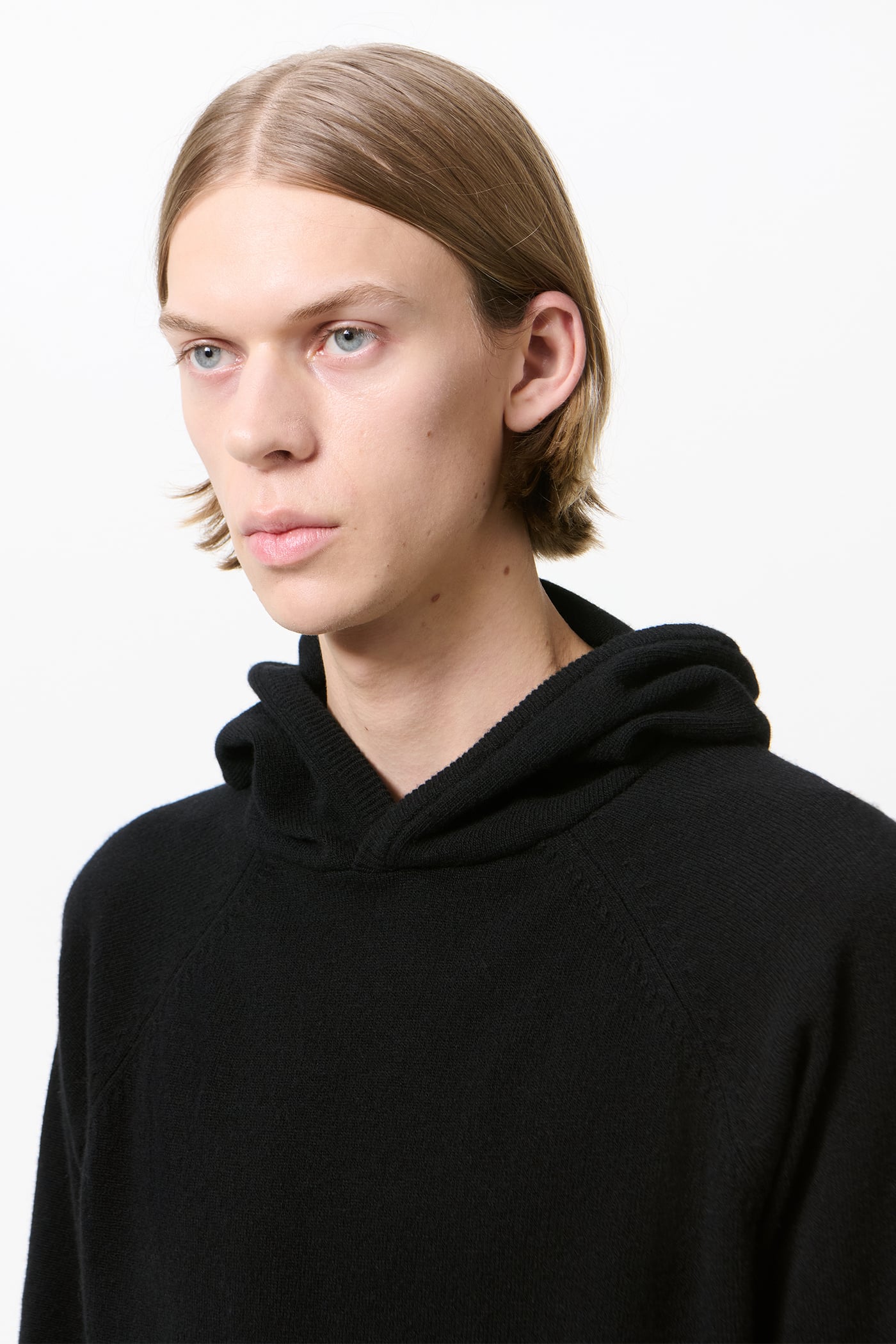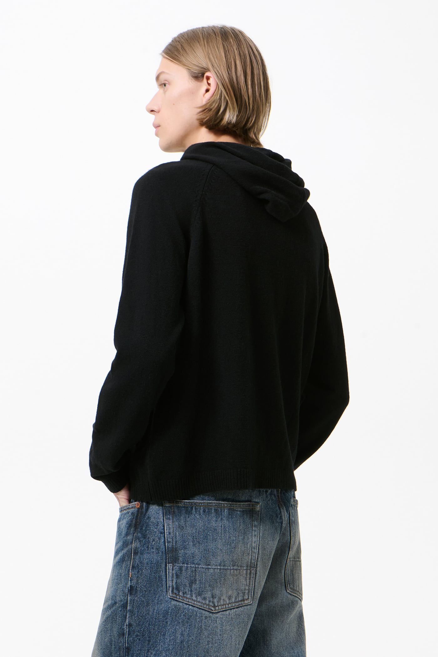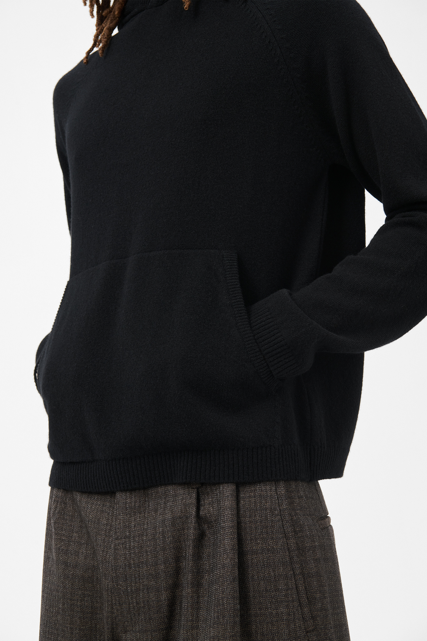 Our Knitted Hoodie in Black Cherub Wool. Produced in Italian Merino Wool yarn, the men's Knitted Hoodie has a relaxed, boxy fit and features a hood, raglan sleeves, a patch pocket, and 2x2 rib knit cuffs and hem.