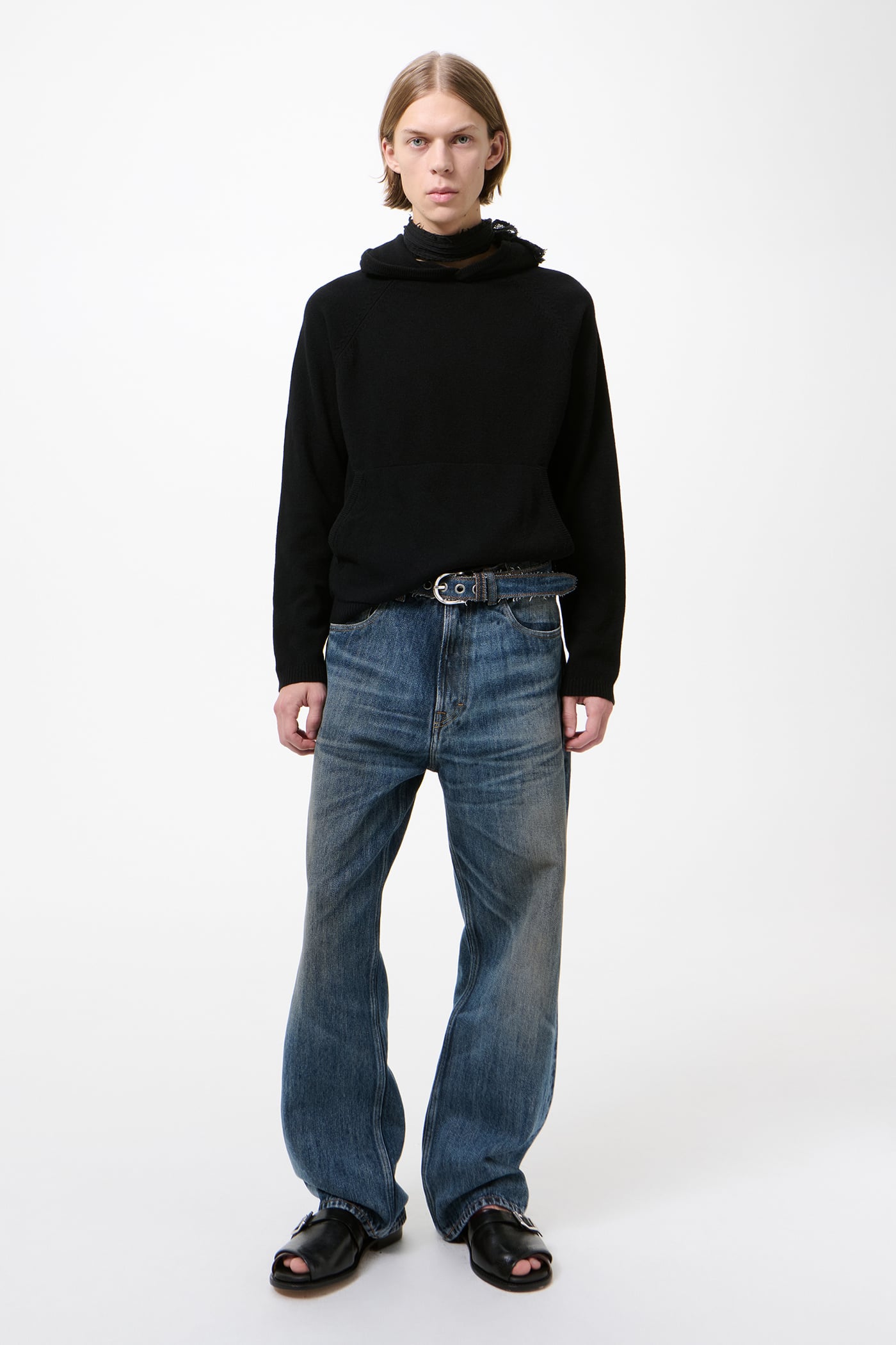This garment is manufactured using a carefully sourced yarn. The natural characteristics of the yarn, combined with the construction of the knit allows the garment to expand when worn. The garment shall be shaped by its wearer and naturally distress over time to finish the design process. To help keep the integrity of the garment please store the garment folded.