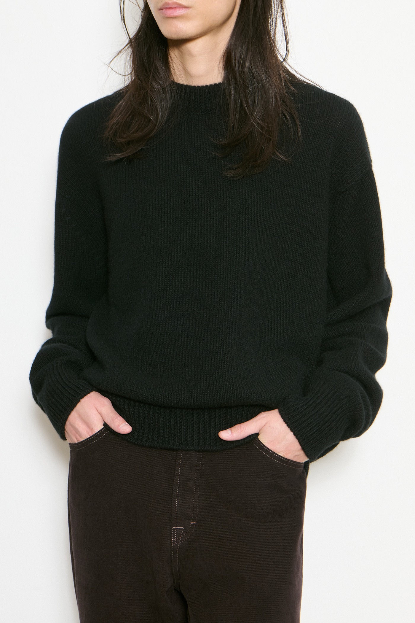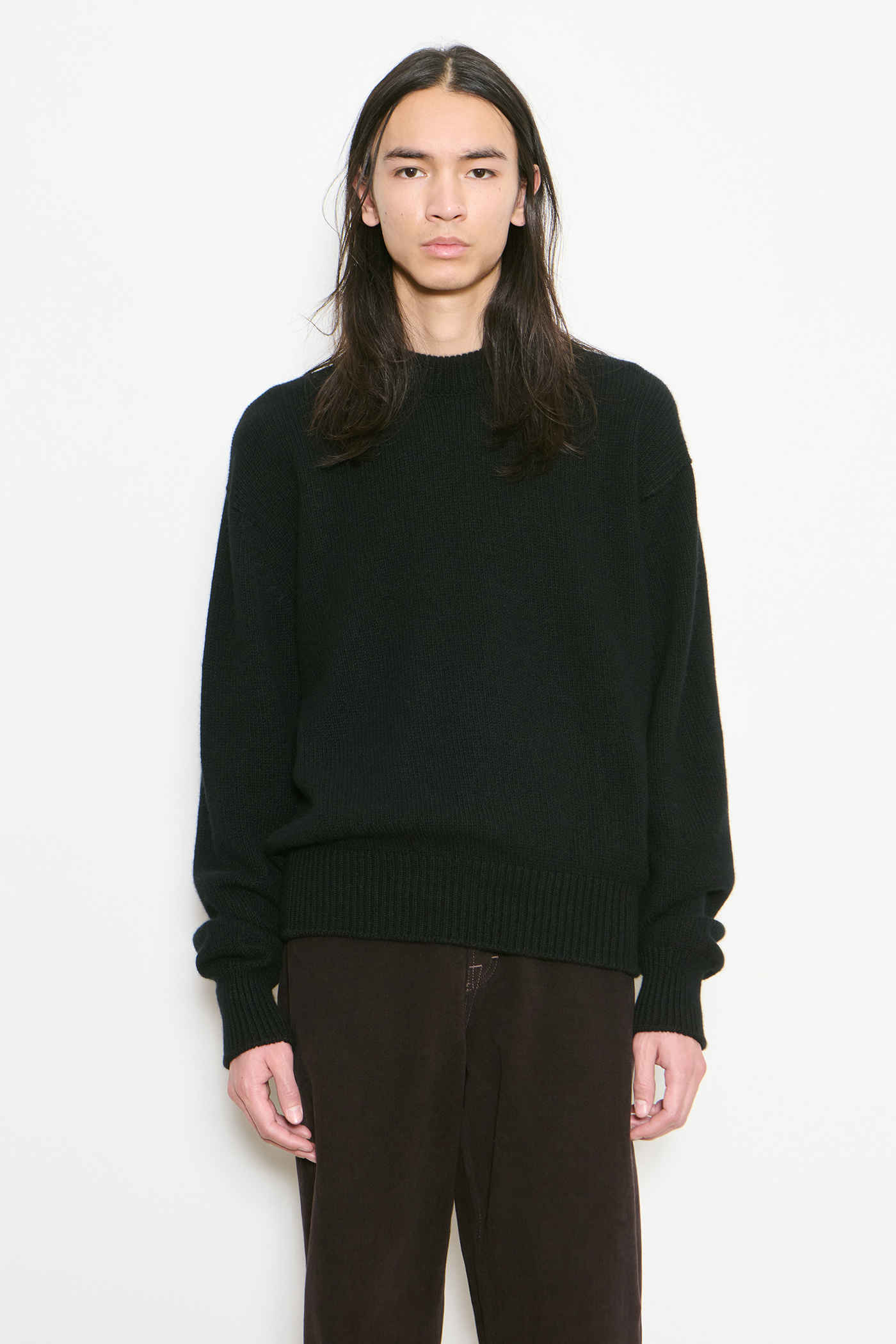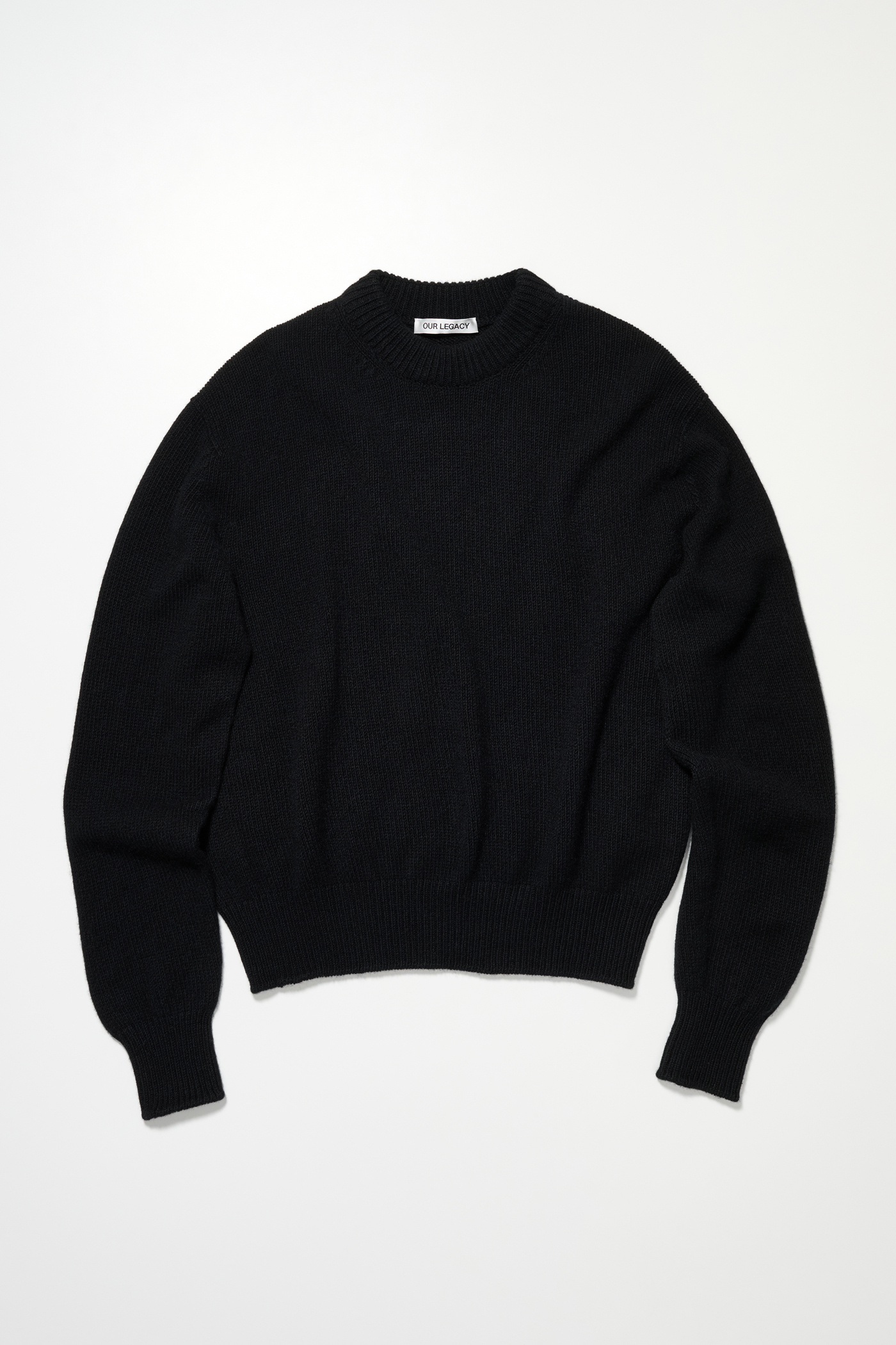 Our Legacy Work Shop Knitted Roundneck in Black Cashmere. Produced in a coarsehair based on 100% woolen-spun cashmere, given a distinctive casual touch. The refined raw material is crafted with a Shetland-inspired effect, creating a yarn that is super soft and light but packed with character.