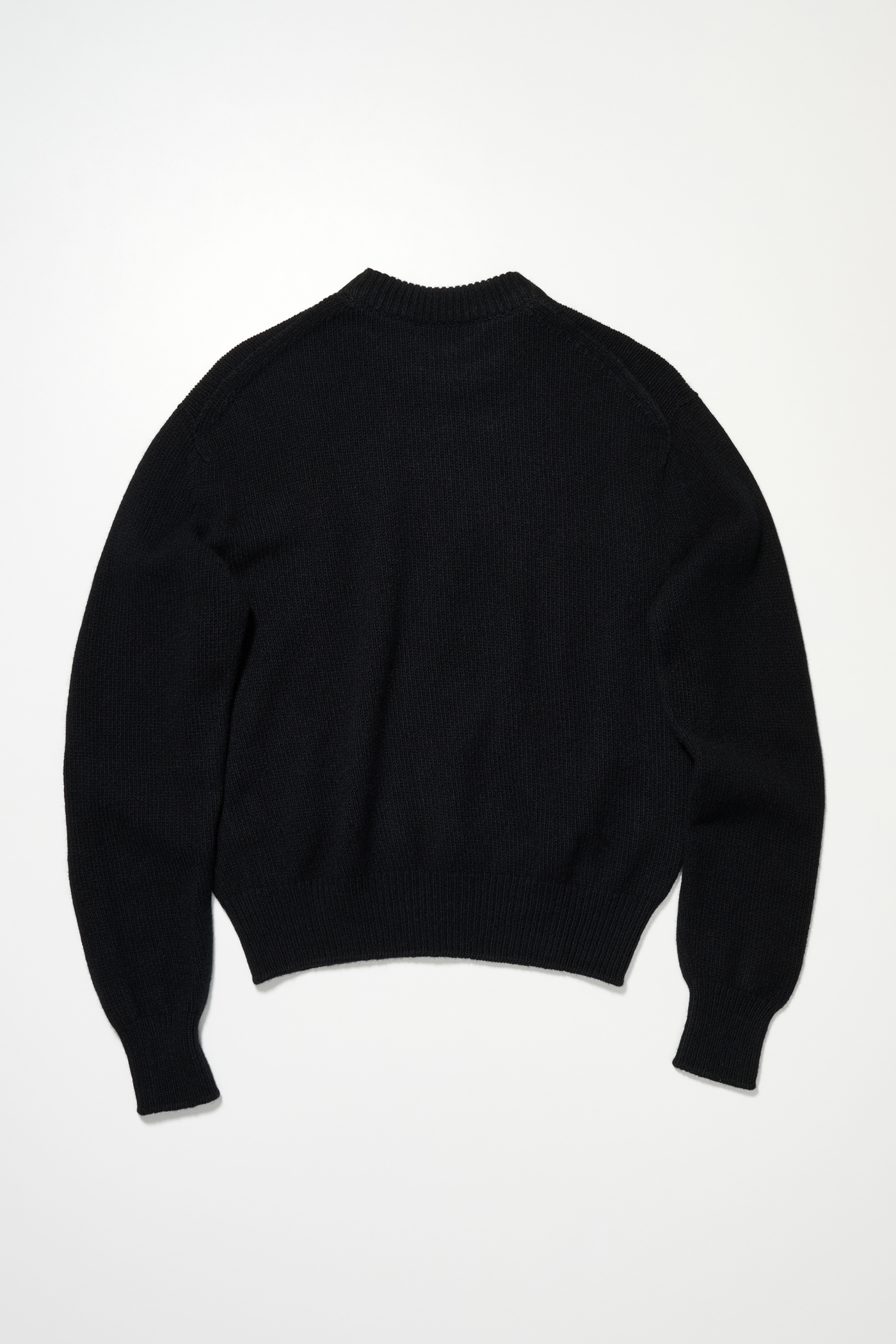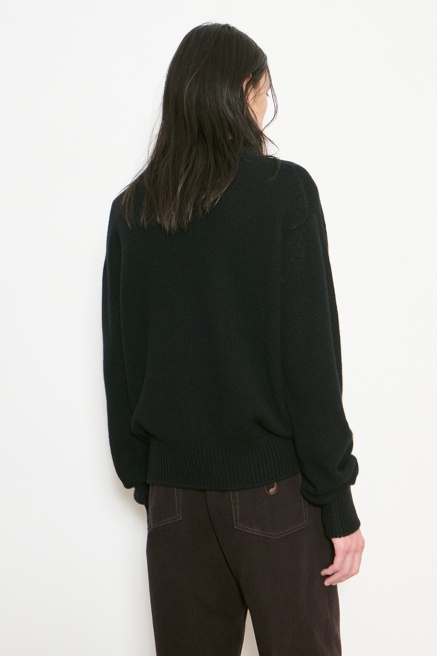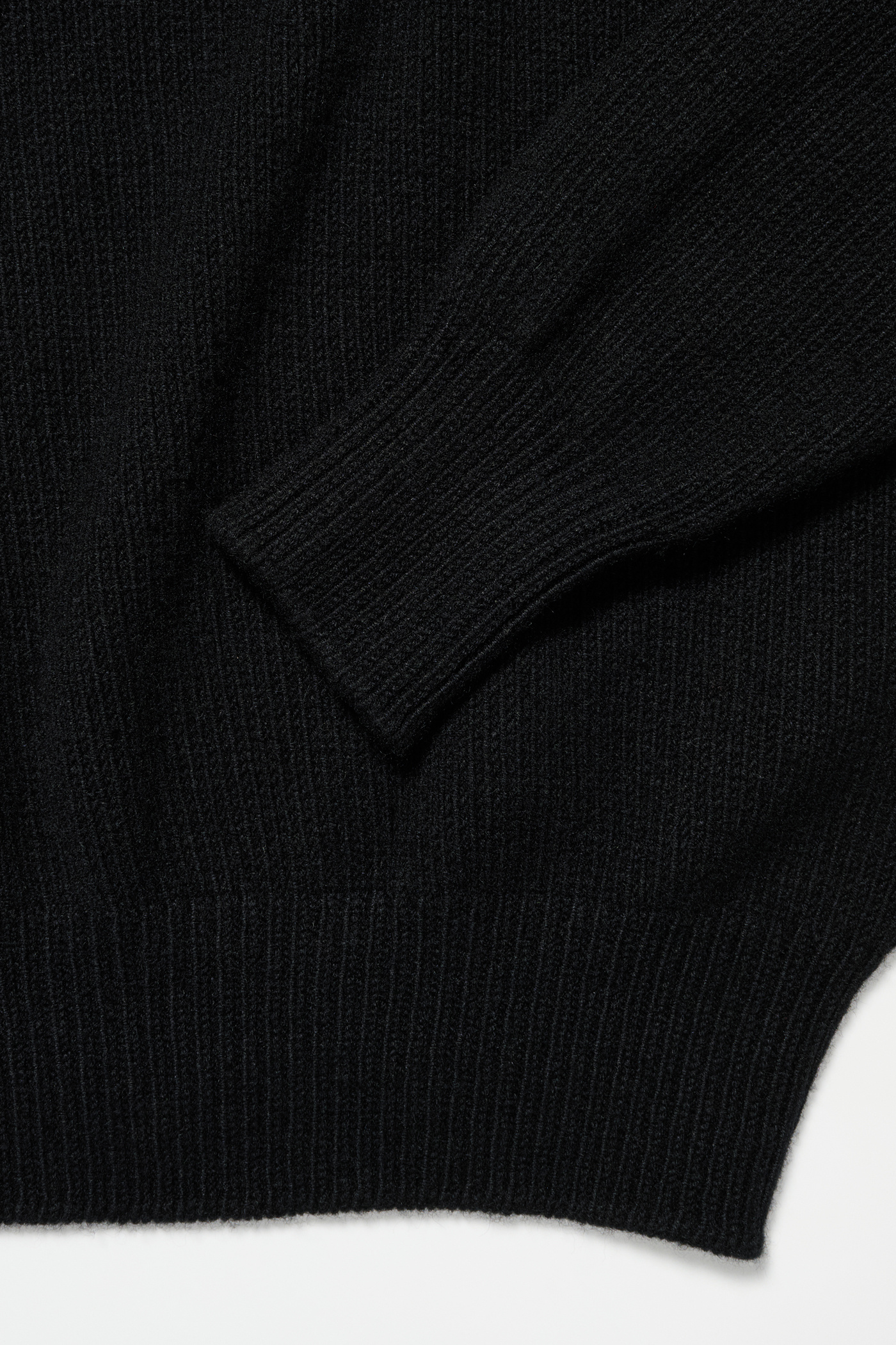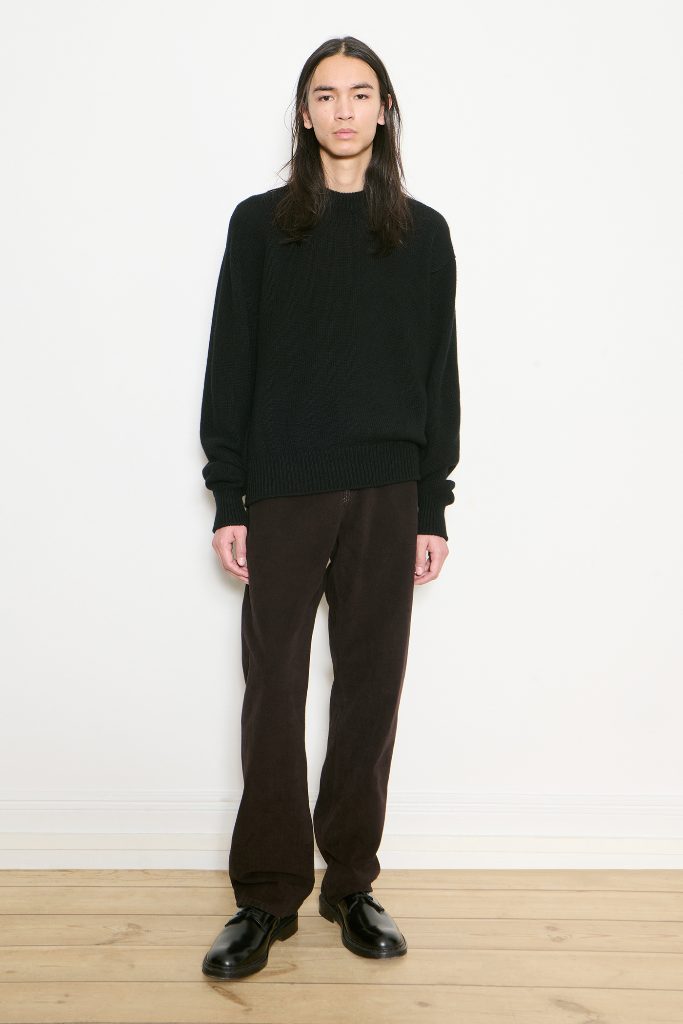 Our Legacy Work Shop Knitted Roundneck in Black Cashmere. Produced in a coarsehair based on 100% woolen-spun cashmere, given a distinctive casual touch. The refined raw material is crafted with a Shetland-inspired effect, creating a yarn that is super soft and light but packed with character.