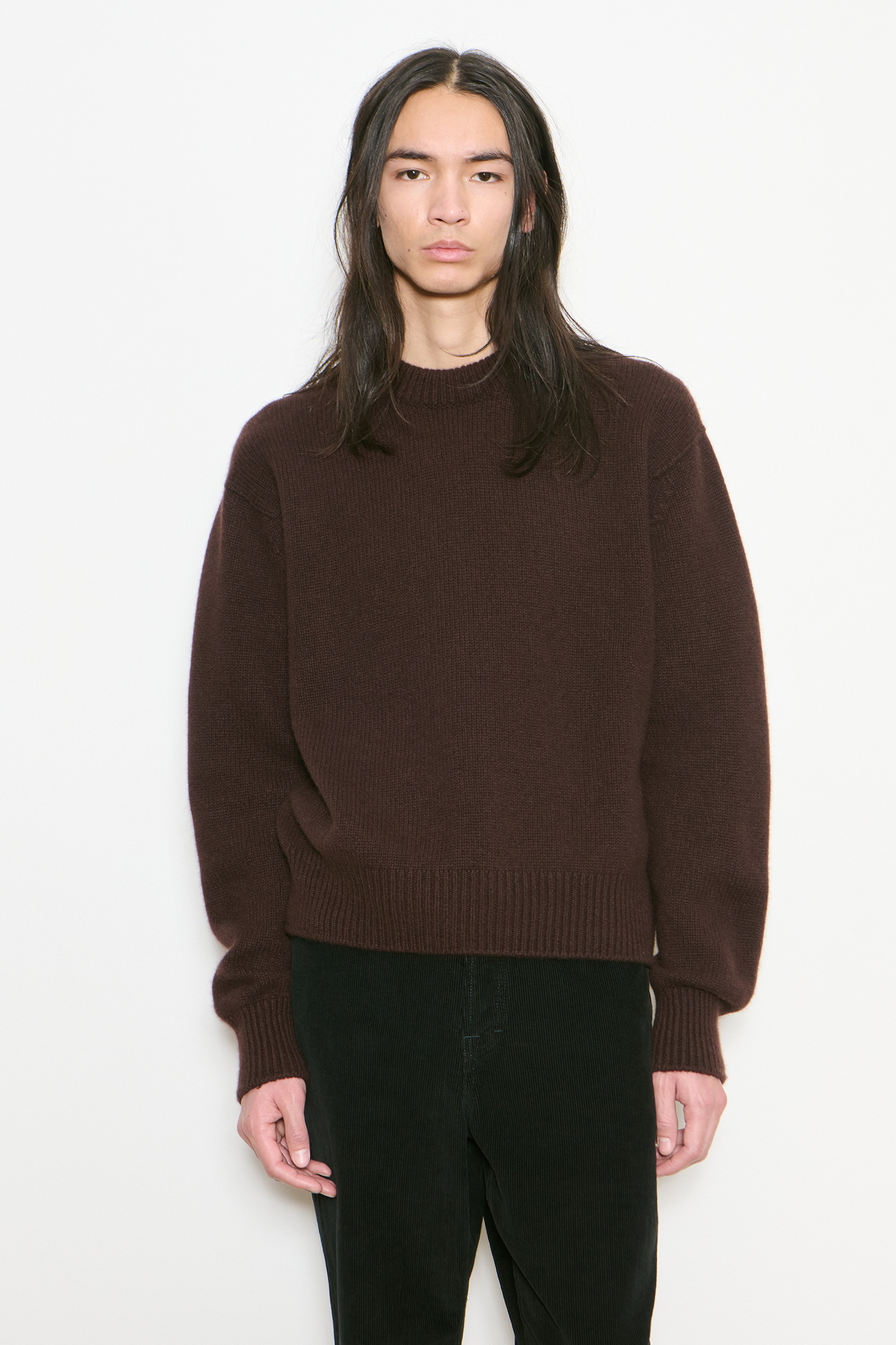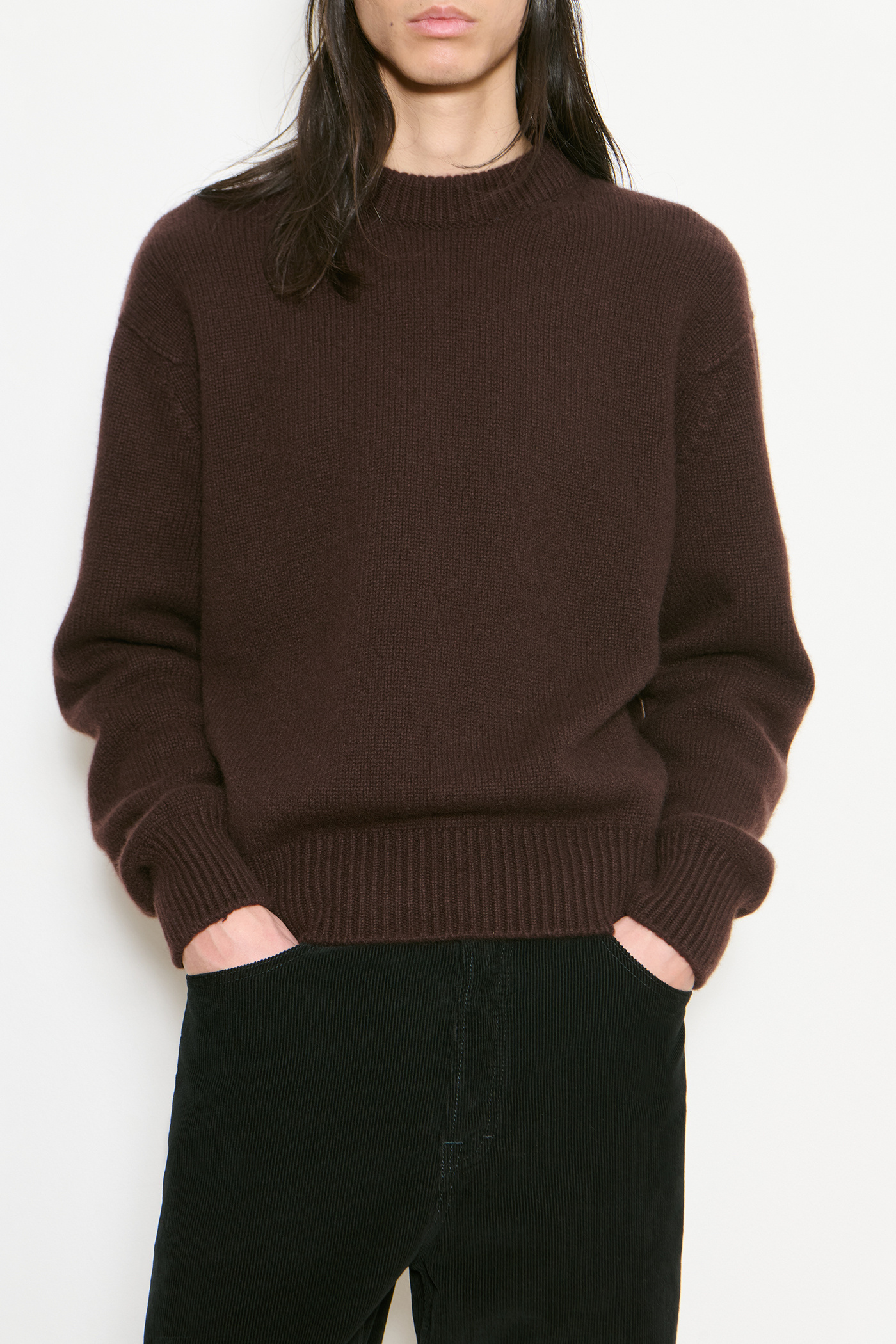 Our Legacy Work Shop Knitted Roundneck in Truffle Cashmere. Produced in a coarsehair based on 100% woolen-spun cashmere, given a distinctive casual touch. The refined raw material is crafted with a Shetland-inspired effect, creating a yarn that is super soft and light but packed with character.