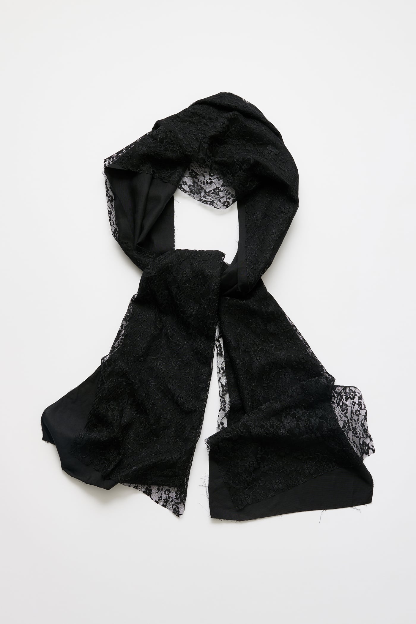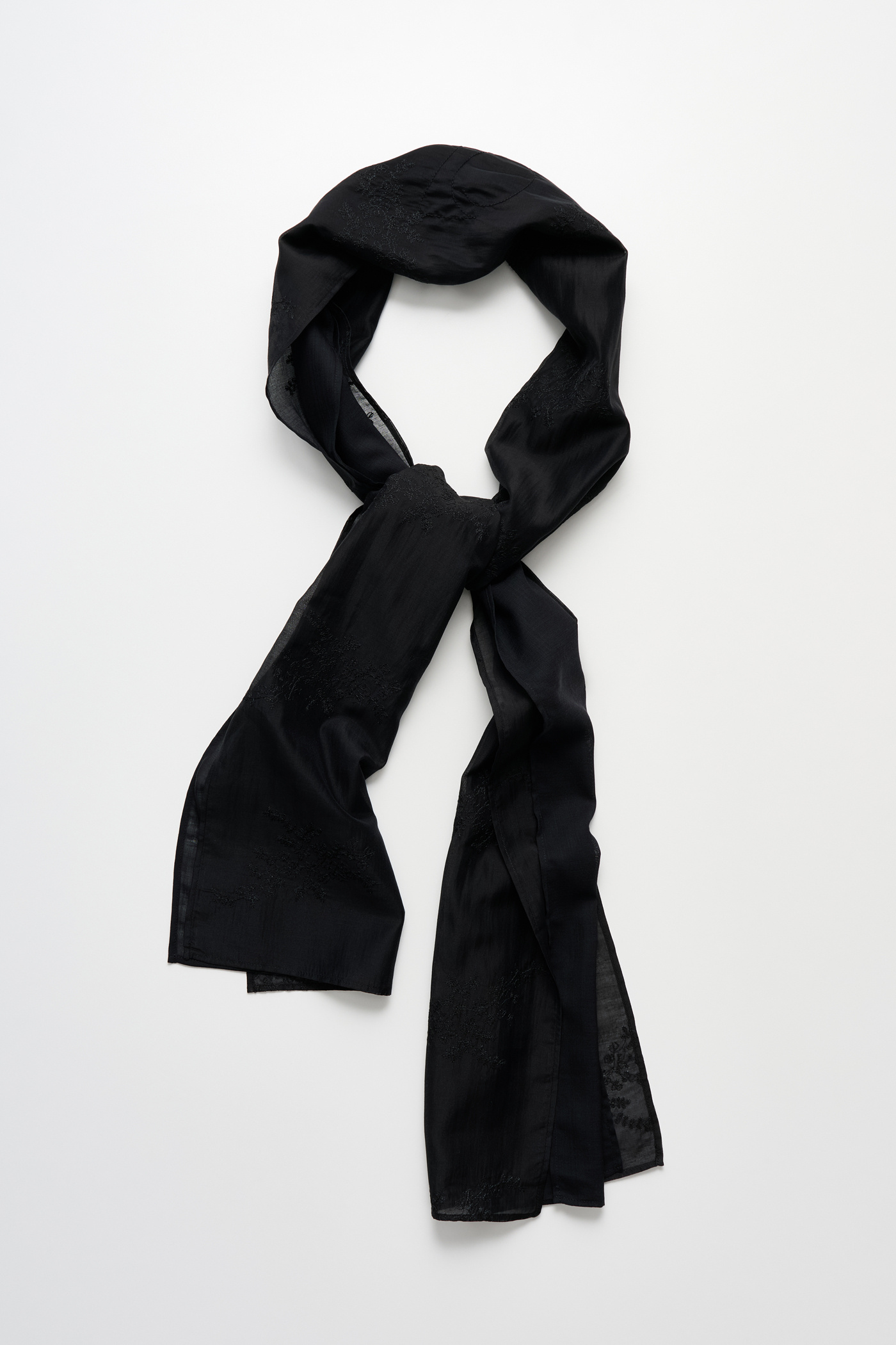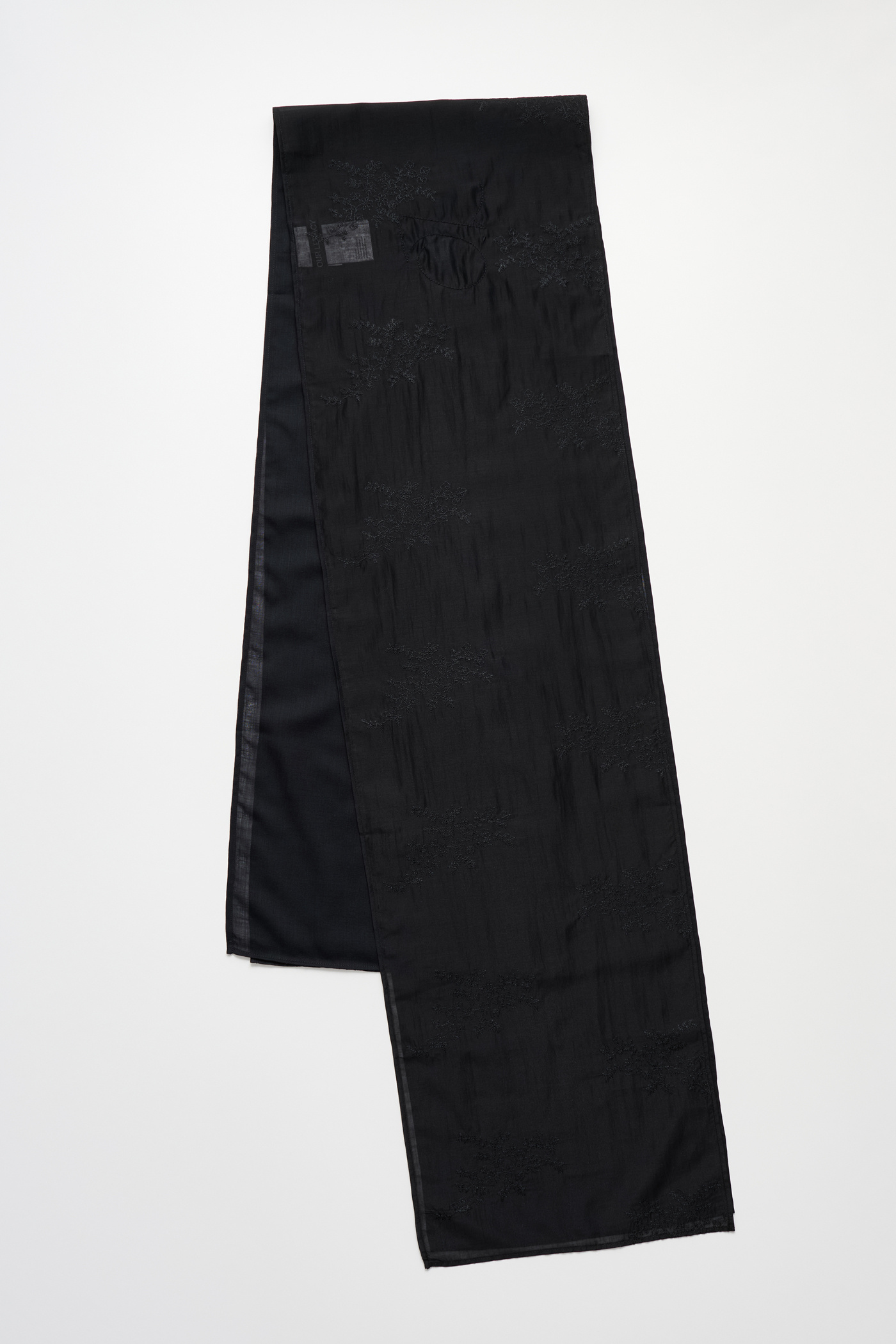 Our Layered Scarf in Eclipse Black Merino Voile. Produced in merino voile spun from Portuguese yarn, this lightweight scarf features a contrast layered construction, a flower motif, a stitched OL logo and raw edges, offering a drapey and elegant feel.