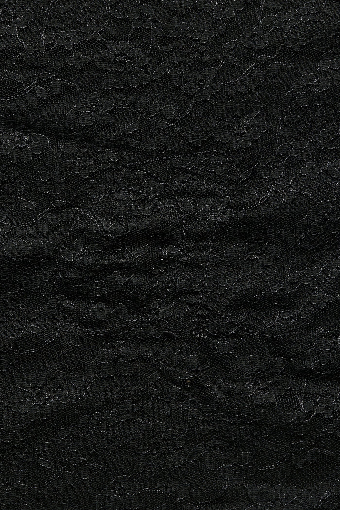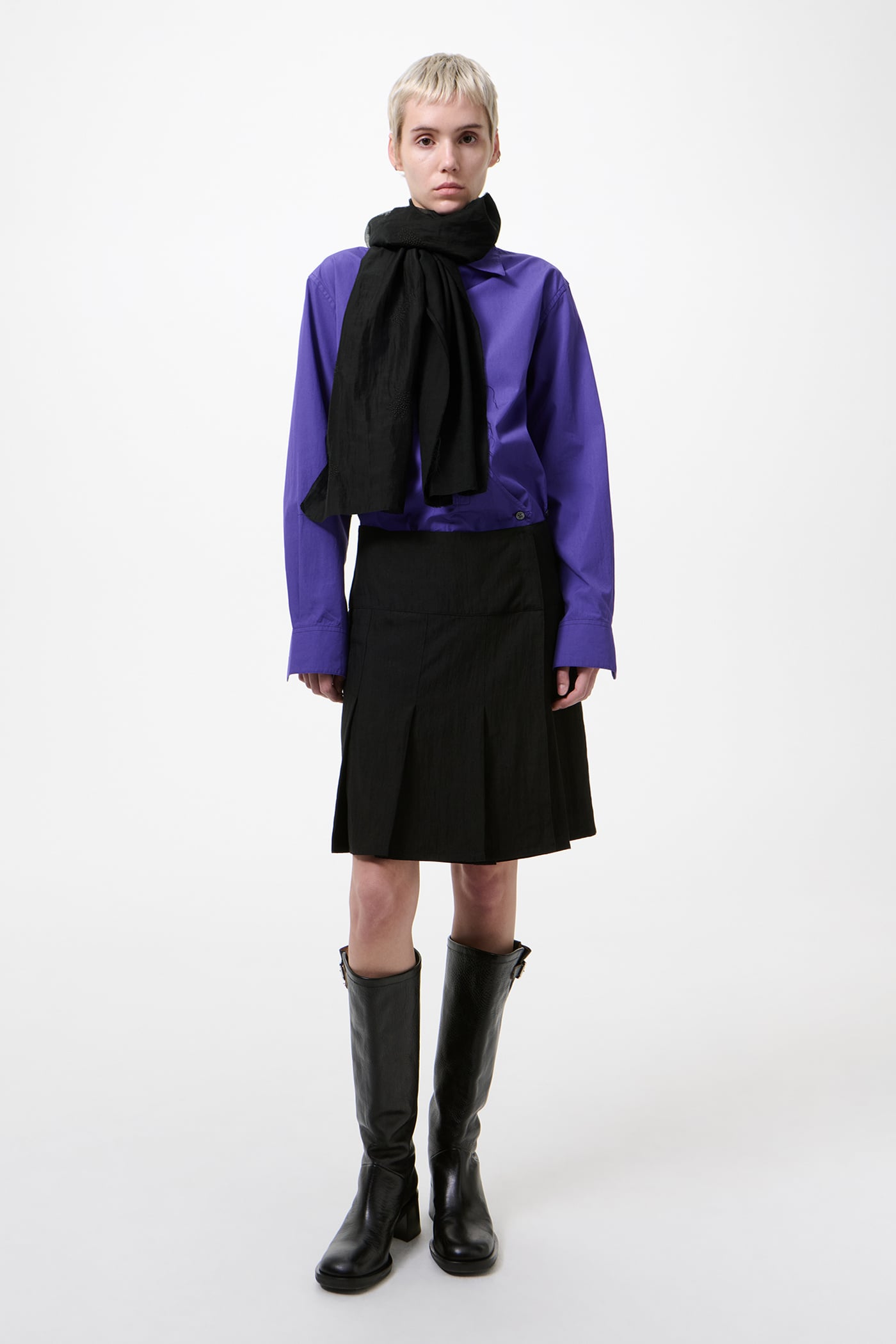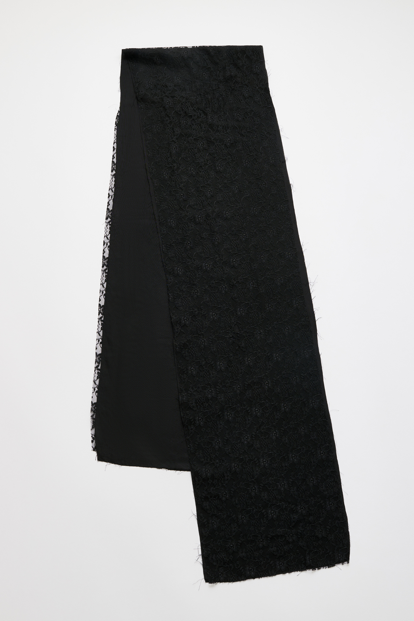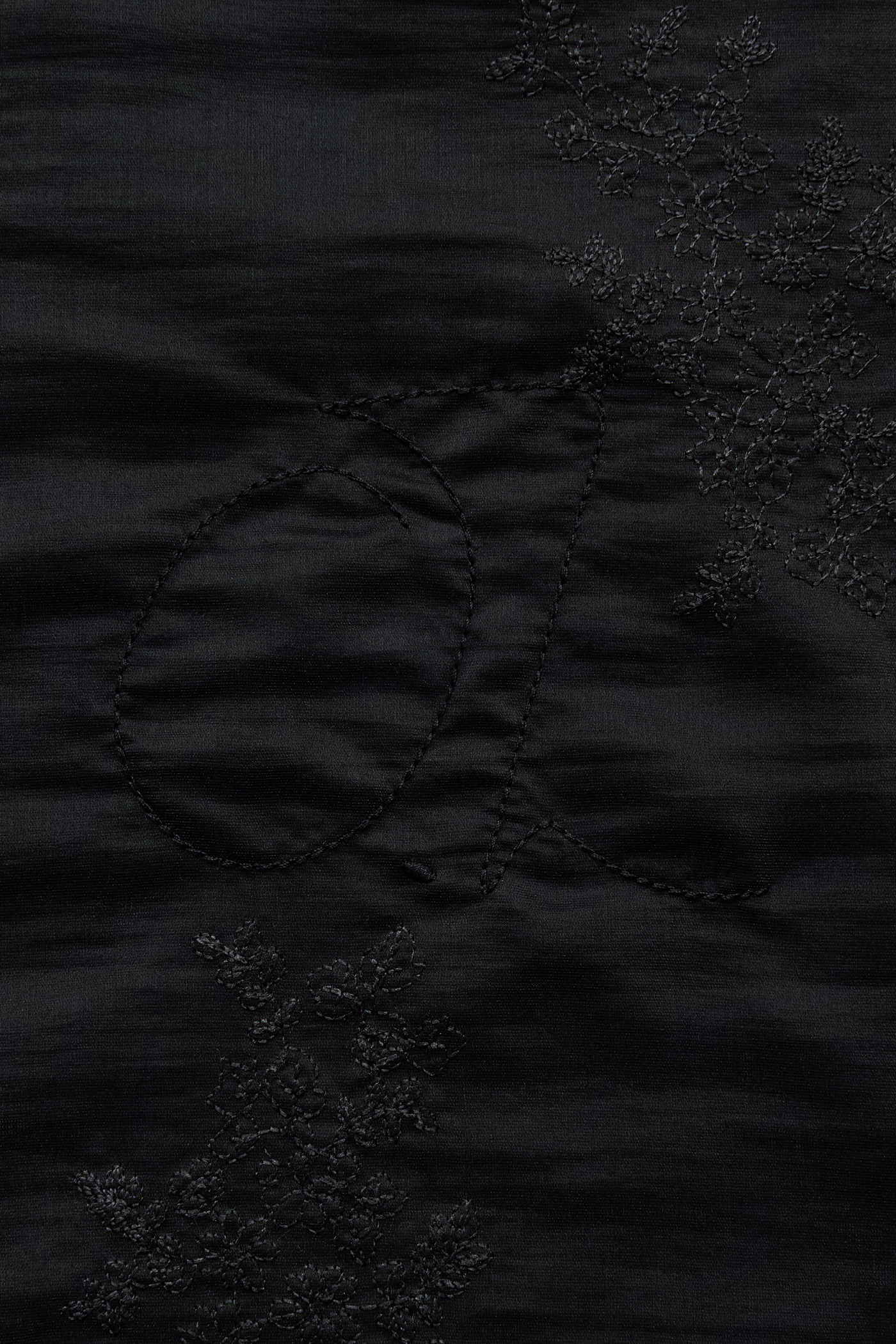 Our Layered Scarf in Eclipse Black Merino Voile. Produced in merino voile spun from Portuguese yarn, this lightweight scarf features a contrast layered construction, a flower motif, a stitched OL logo and raw edges, offering a drapey and elegant feel.