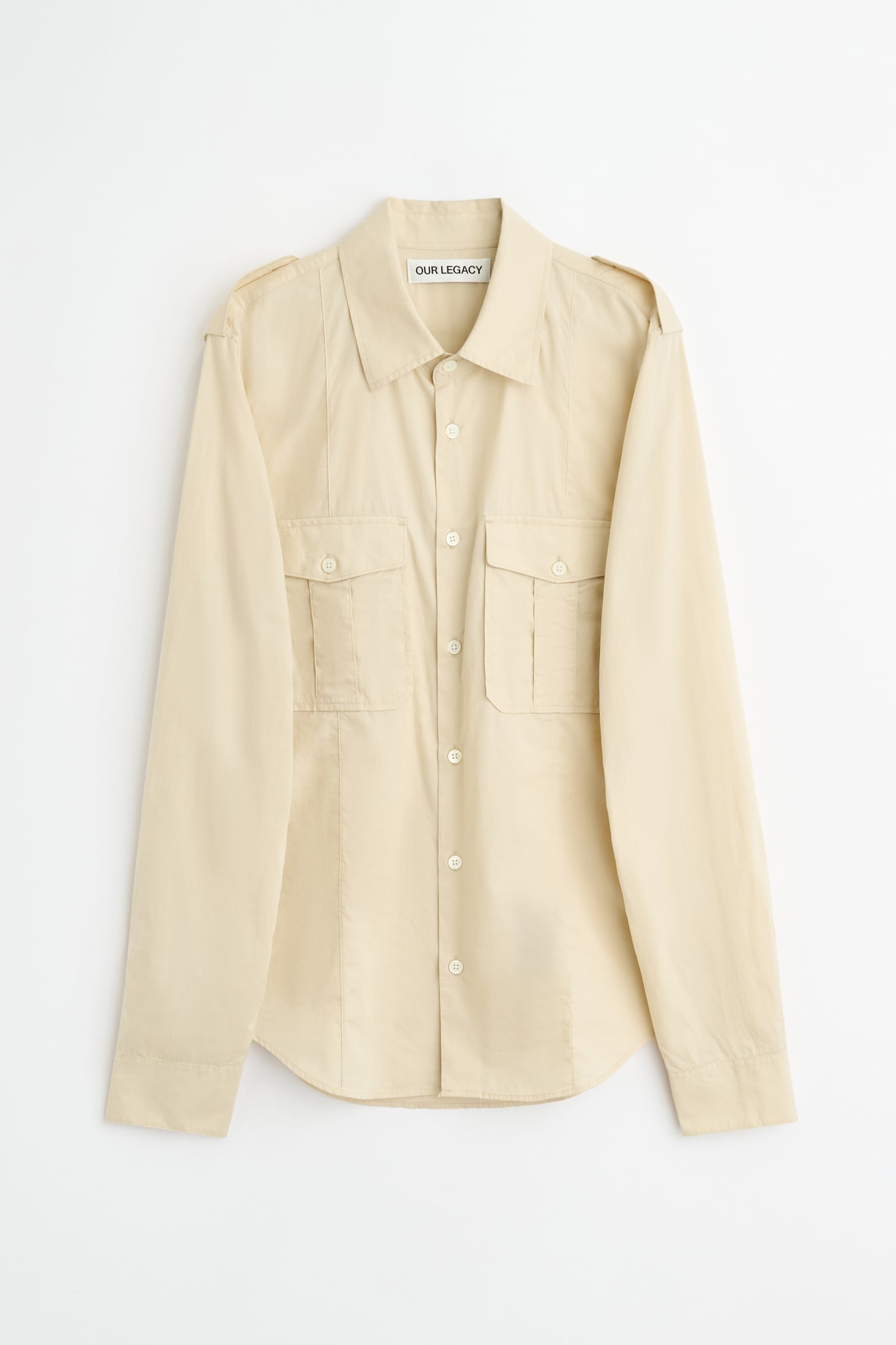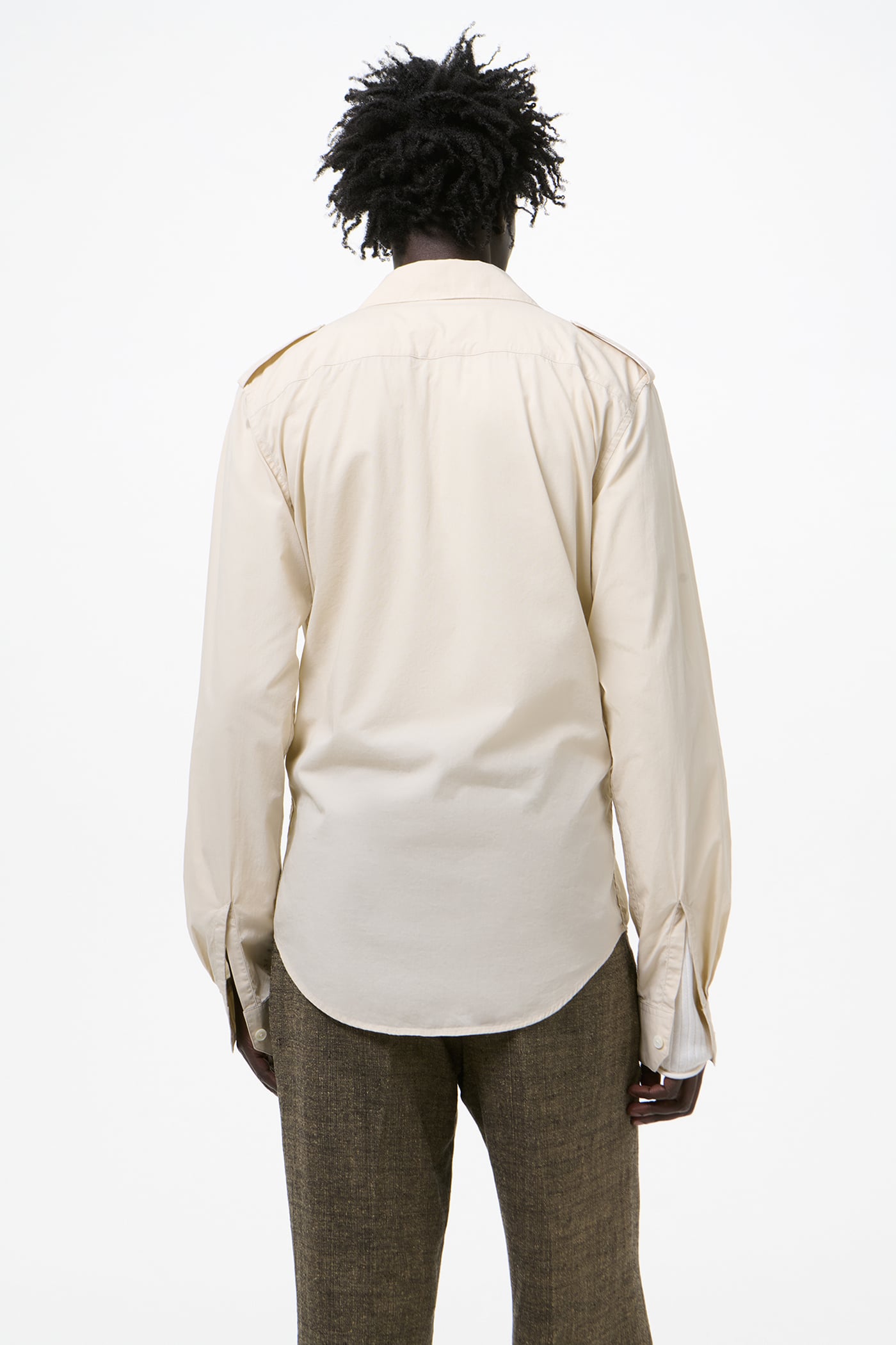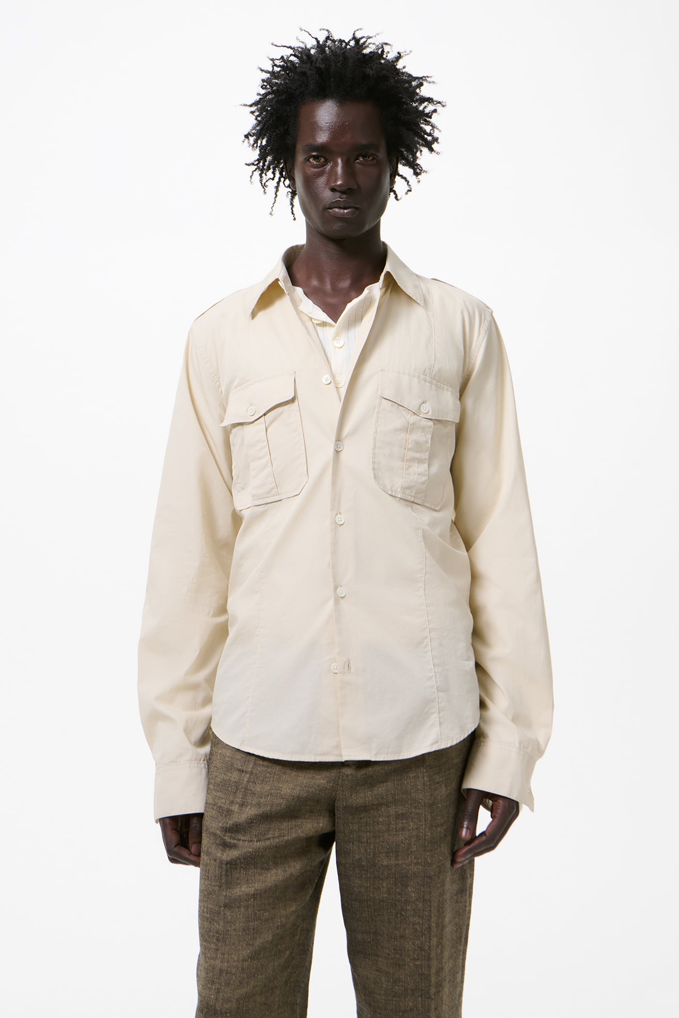 Our Lean Shirt in Eggshell Plainview Cotton. Produced in Italian cotton fabric, the men's Lean Shirt has a slim, reworked silhouette with a casual expression and features epaulettes, pleated patch pockets with flaps and mother of pearl buttons.