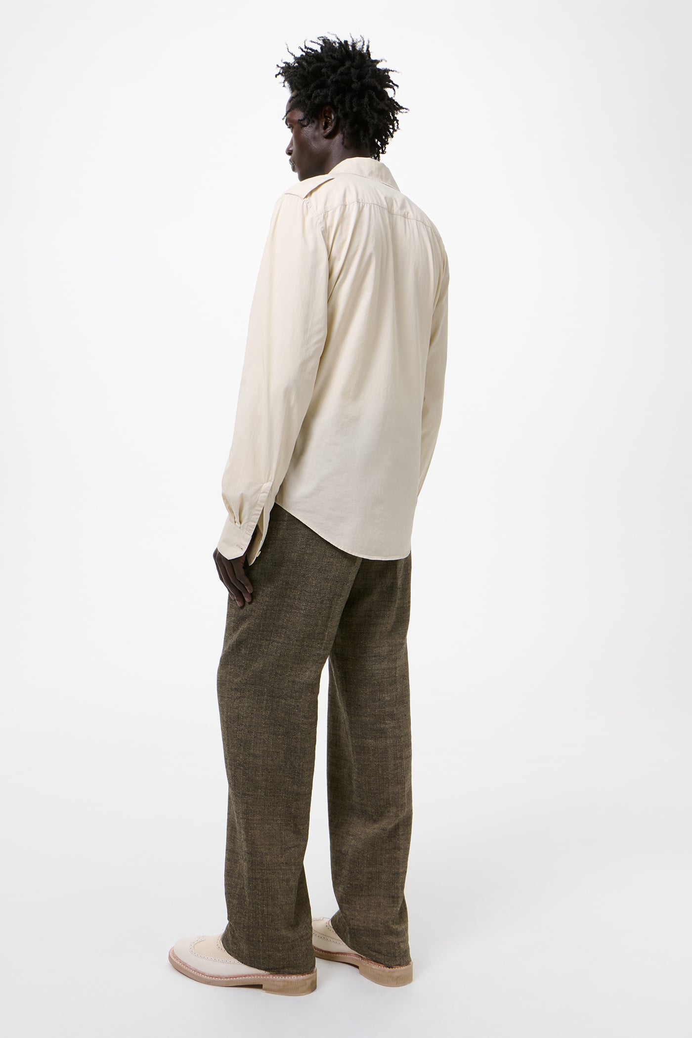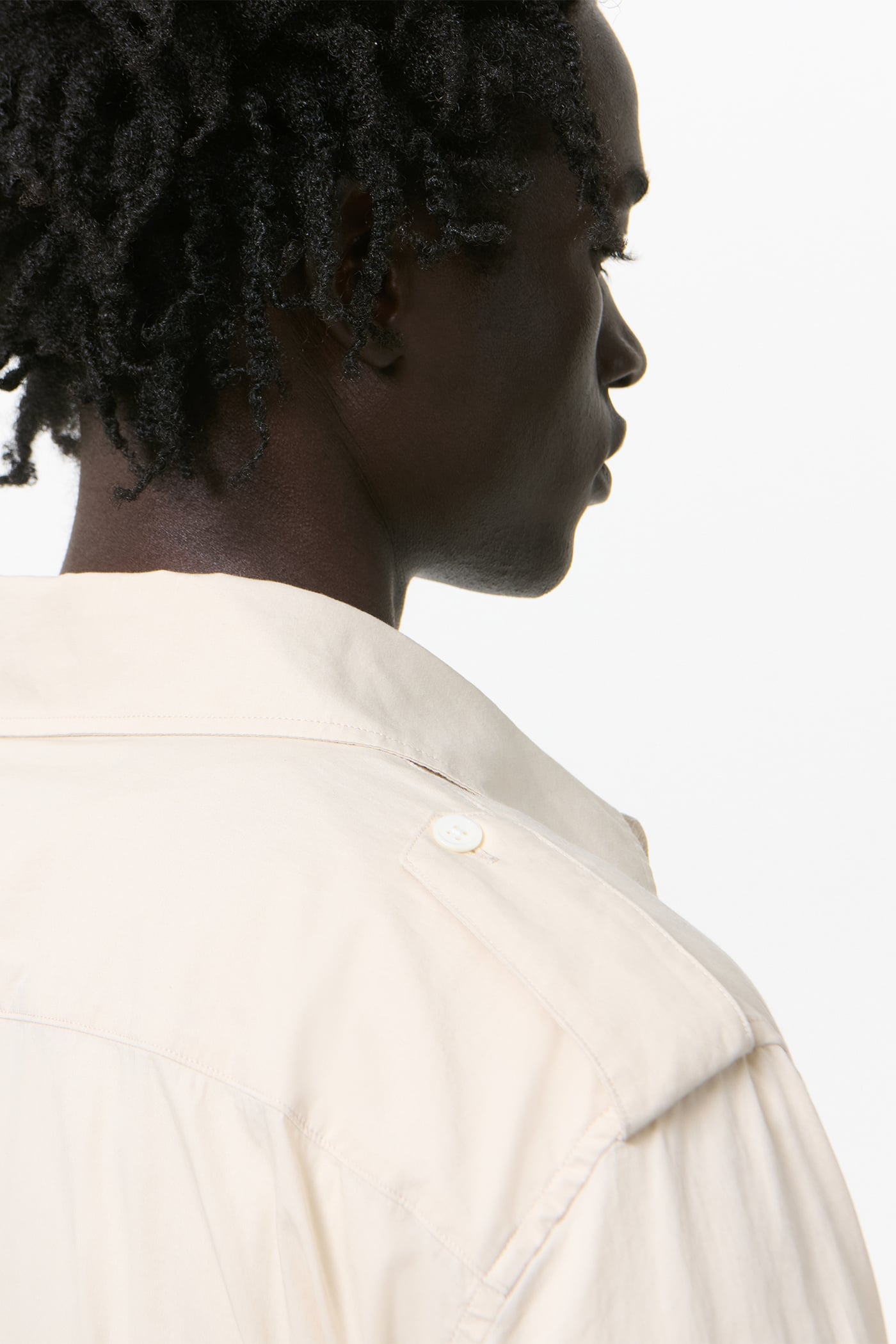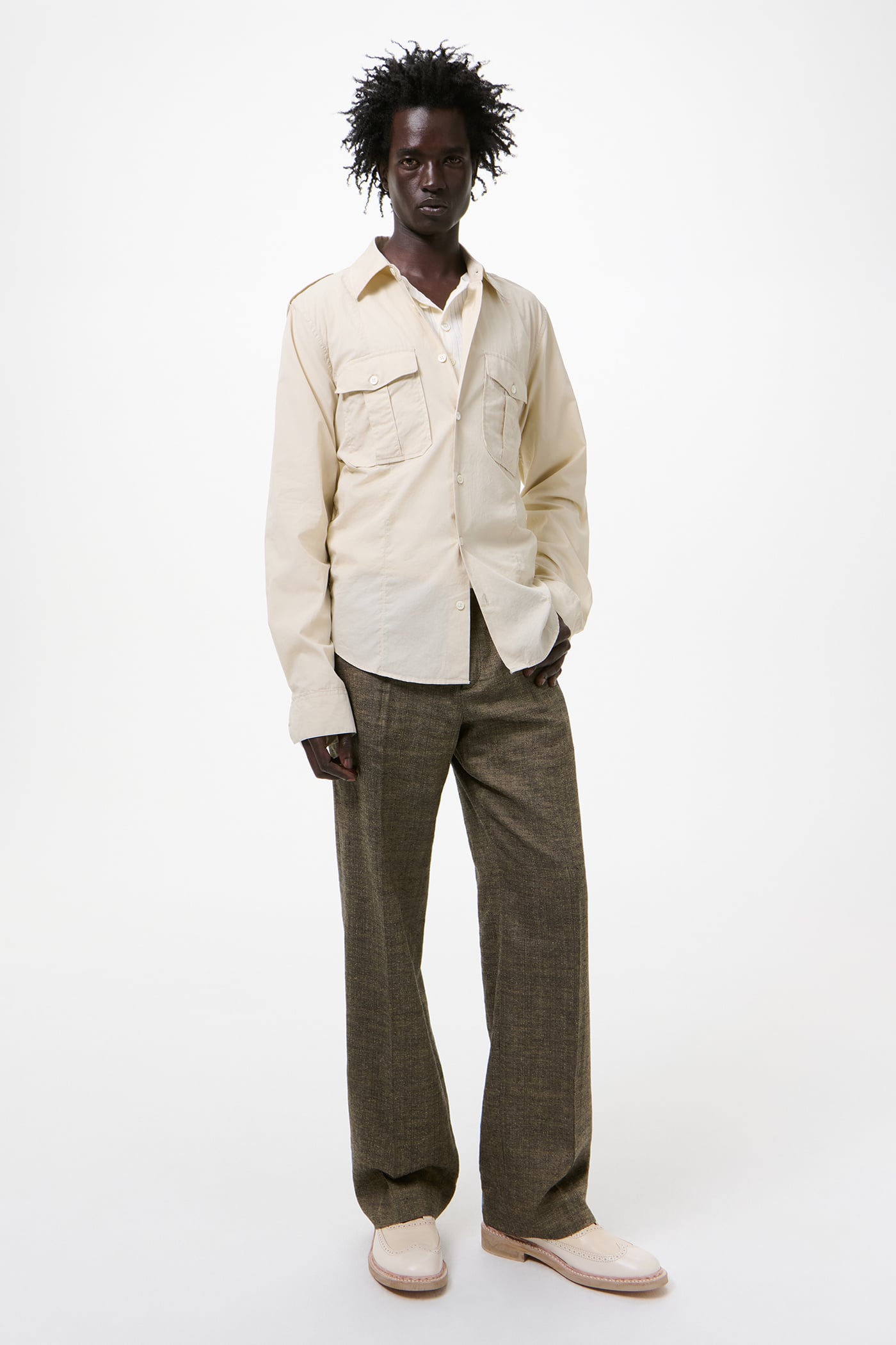 Our Lean Shirt in Eggshell Plainview Cotton. Produced in Italian cotton fabric, the men's Lean Shirt has a slim, reworked silhouette with a casual expression and features epaulettes, pleated patch pockets with flaps and mother of pearl buttons.