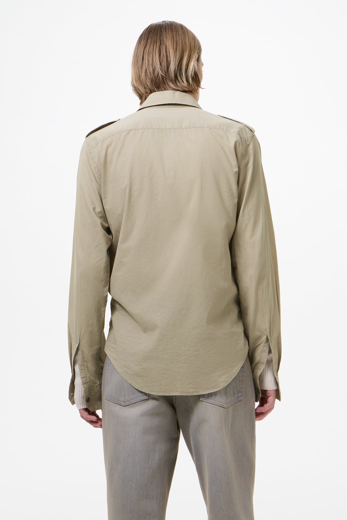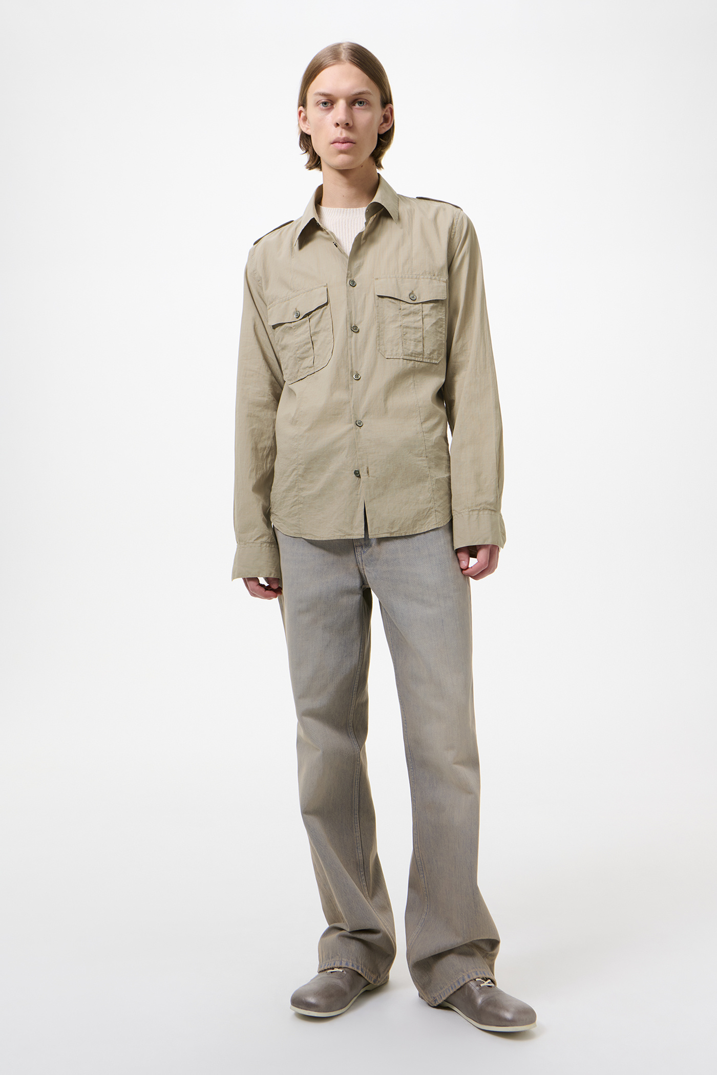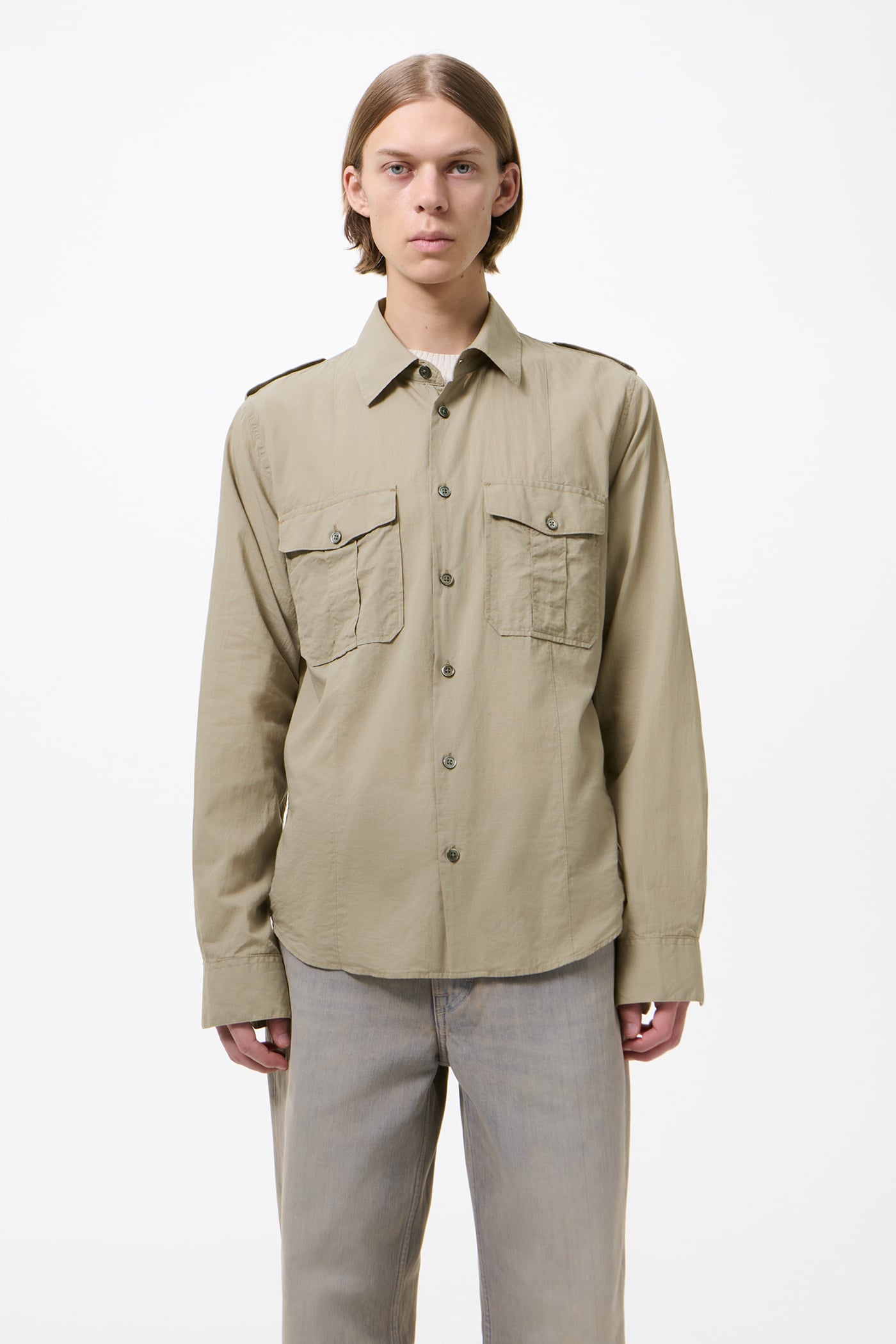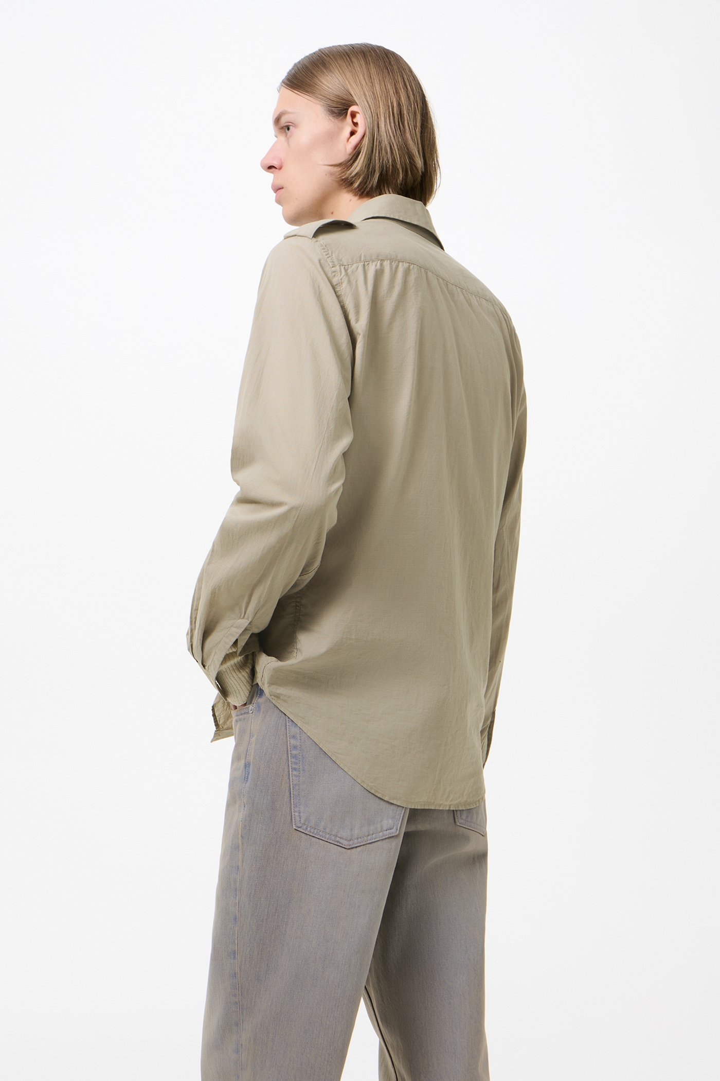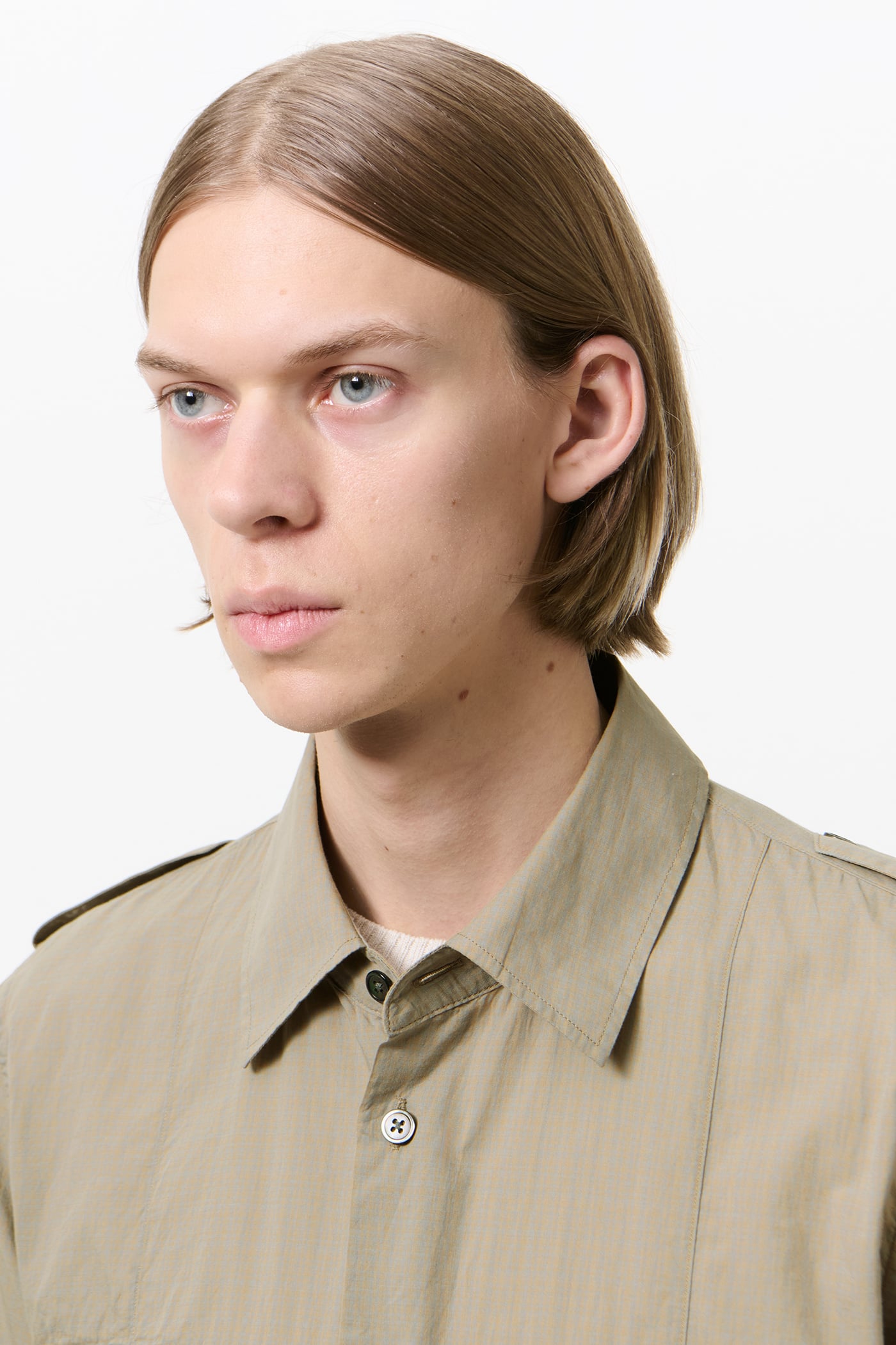 Our Lean Shirt in Faint Check Cotton Gauze. Produced in a Portuguese cotton gauze fabric with a subtle check, the Lean Shirt has a slim silhouette and features epaulettes, pleated patch pockets with flaps and mother of pearl buttons.