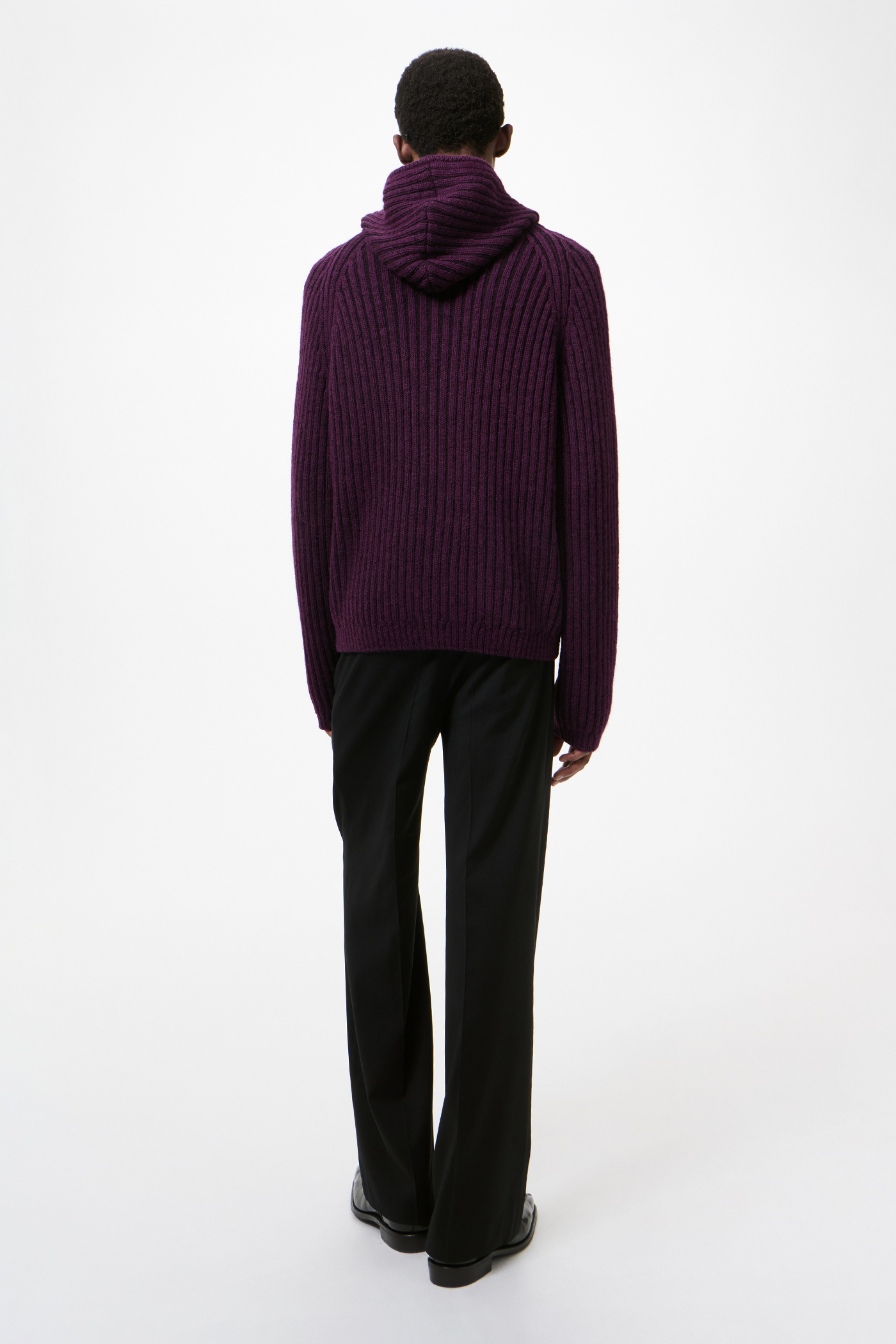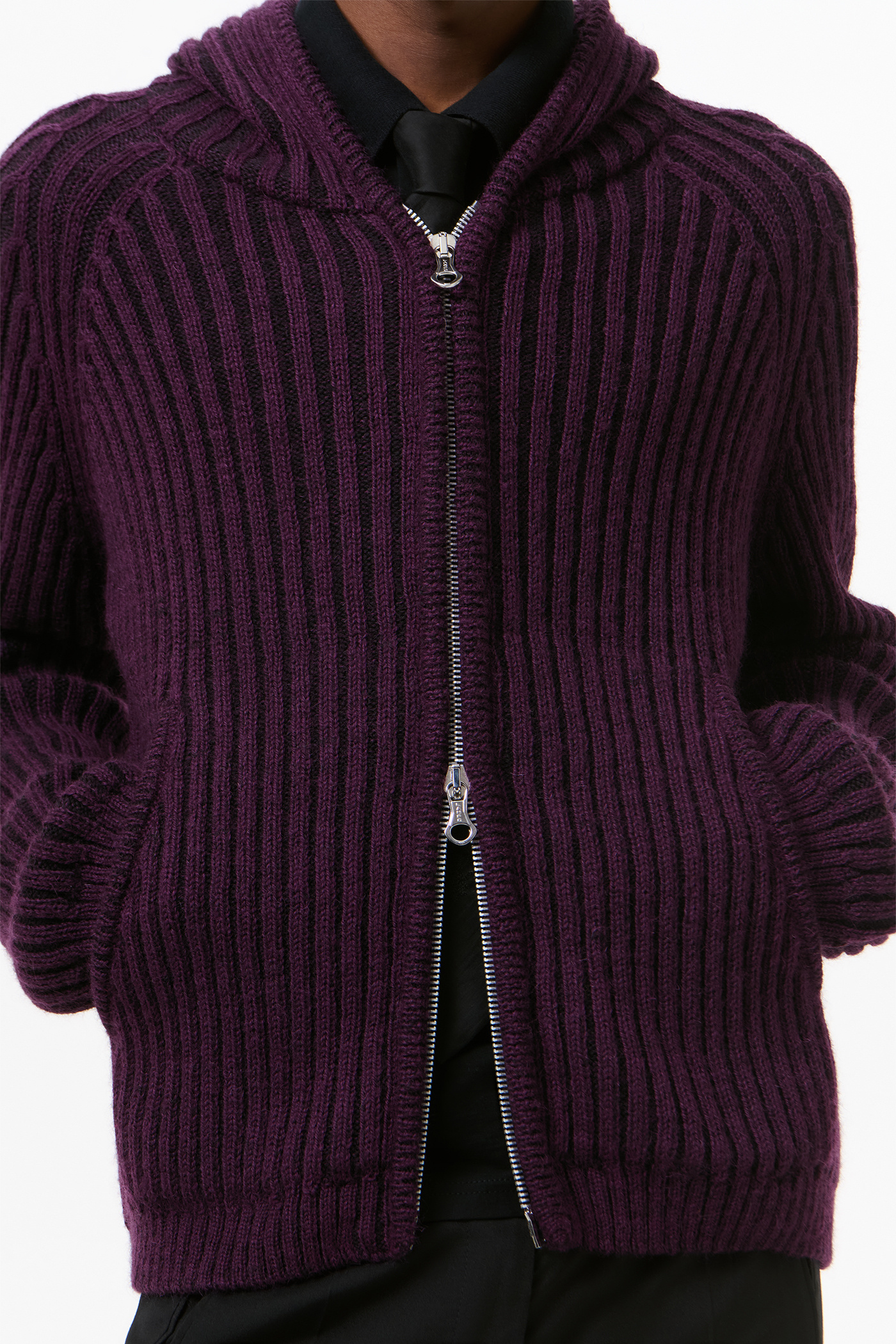 Our Level Hood in Night Violet Stripe Isles Wool. Produced in English wool yarn with a rib knit construction, the men's Level Hood has a relaxed boxy fit and features raglan sleeves, a two way zip, a patch pocket, ribbed cuffs and a straight hem.