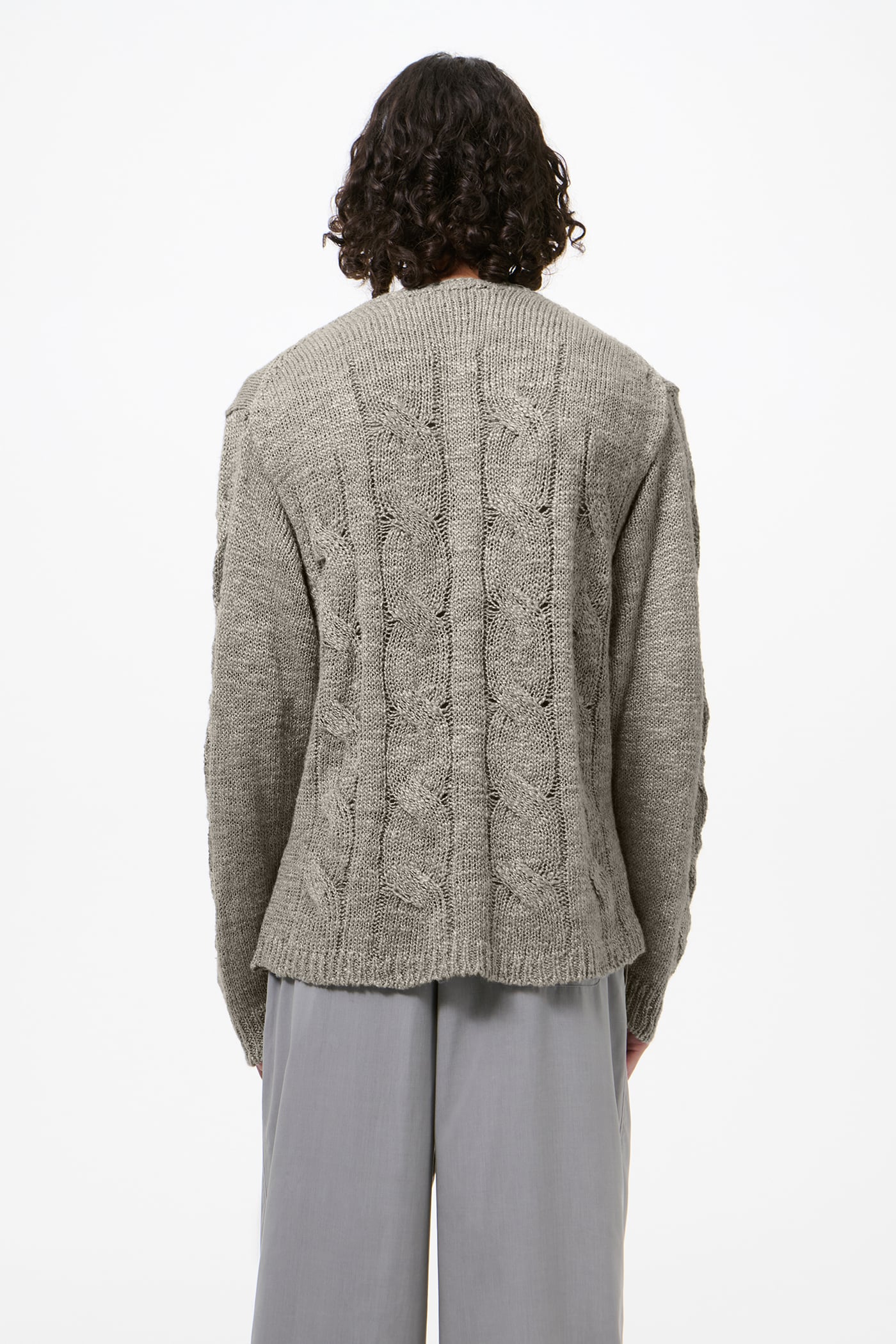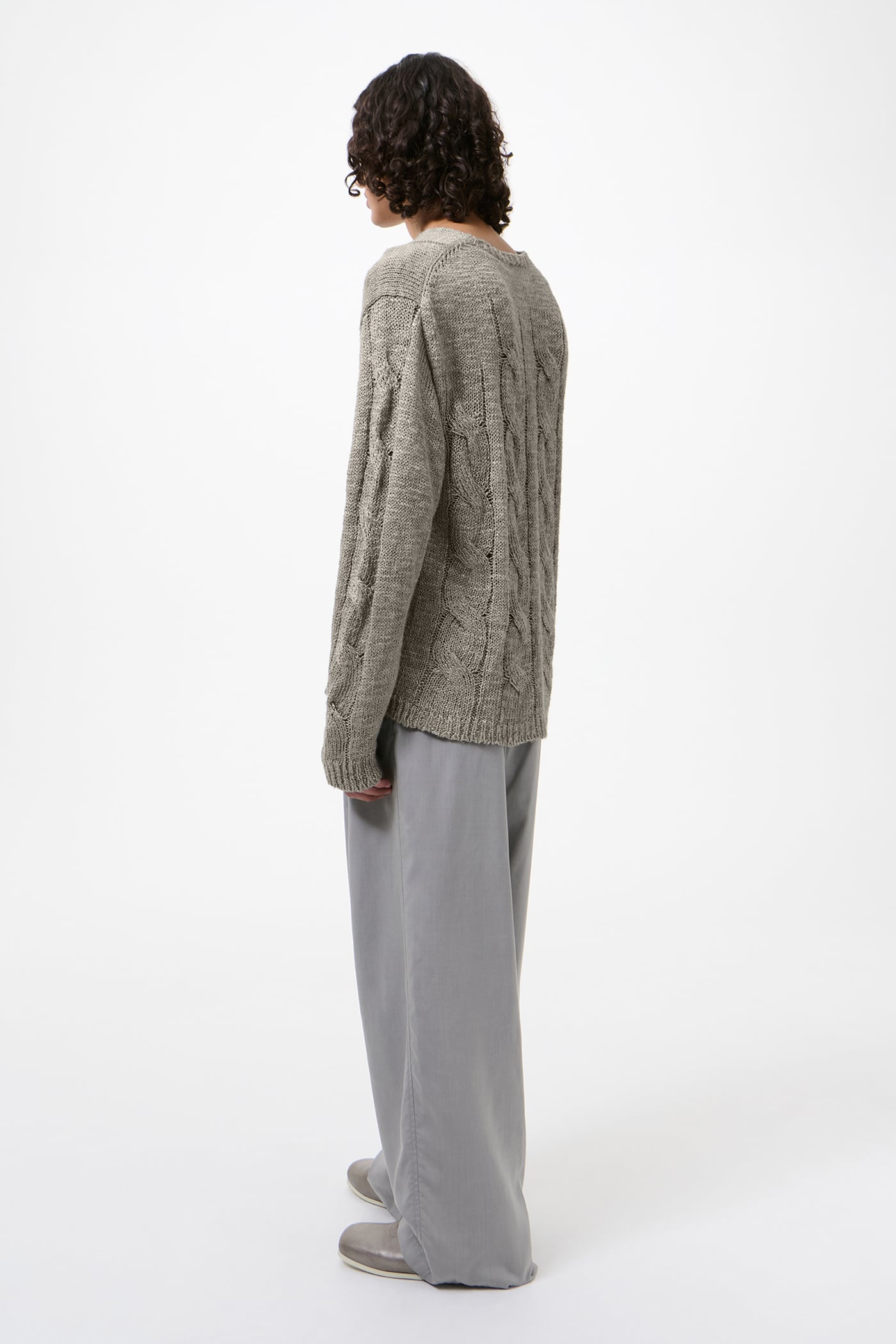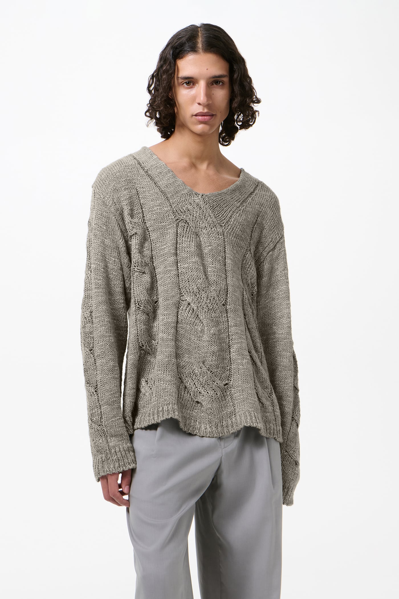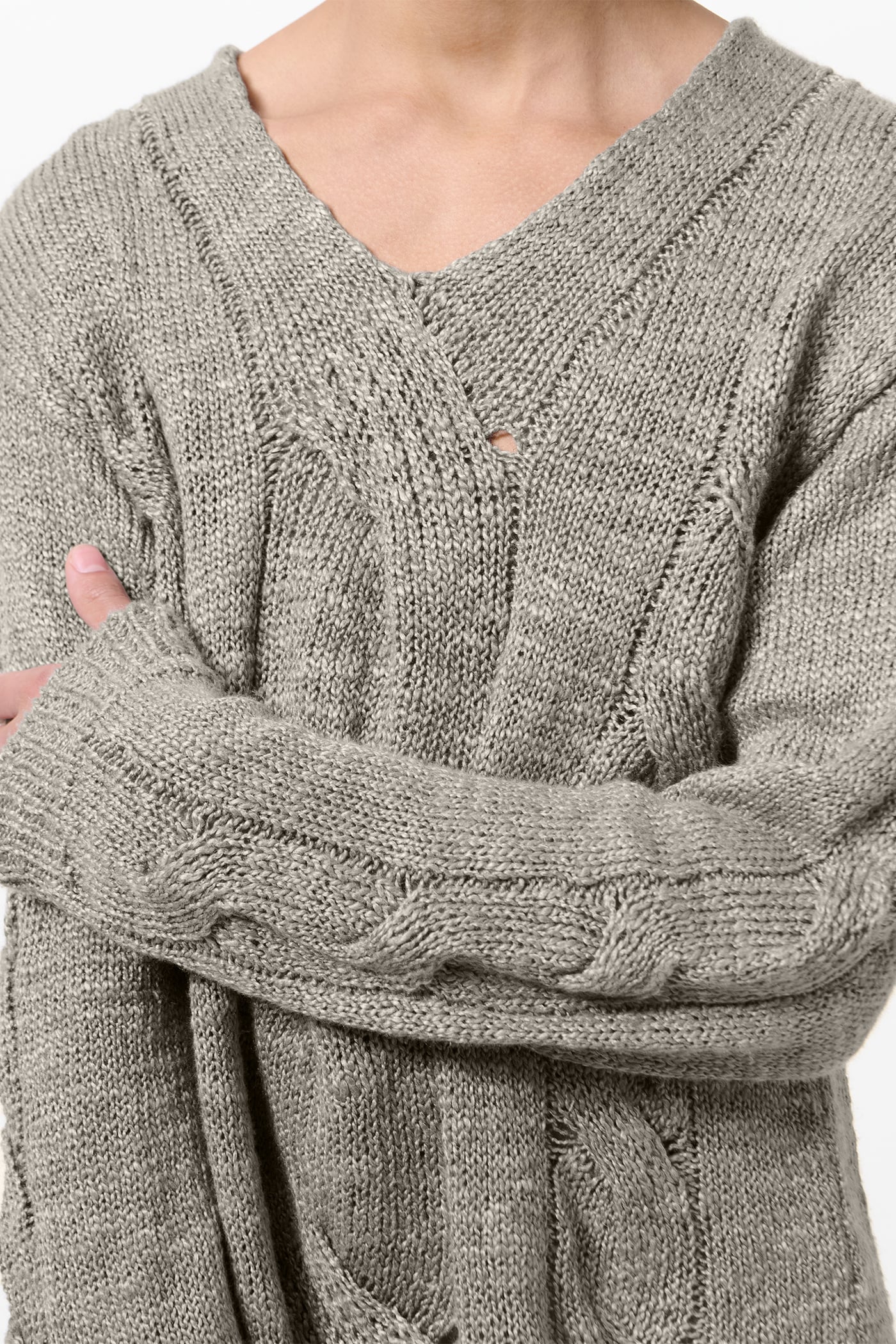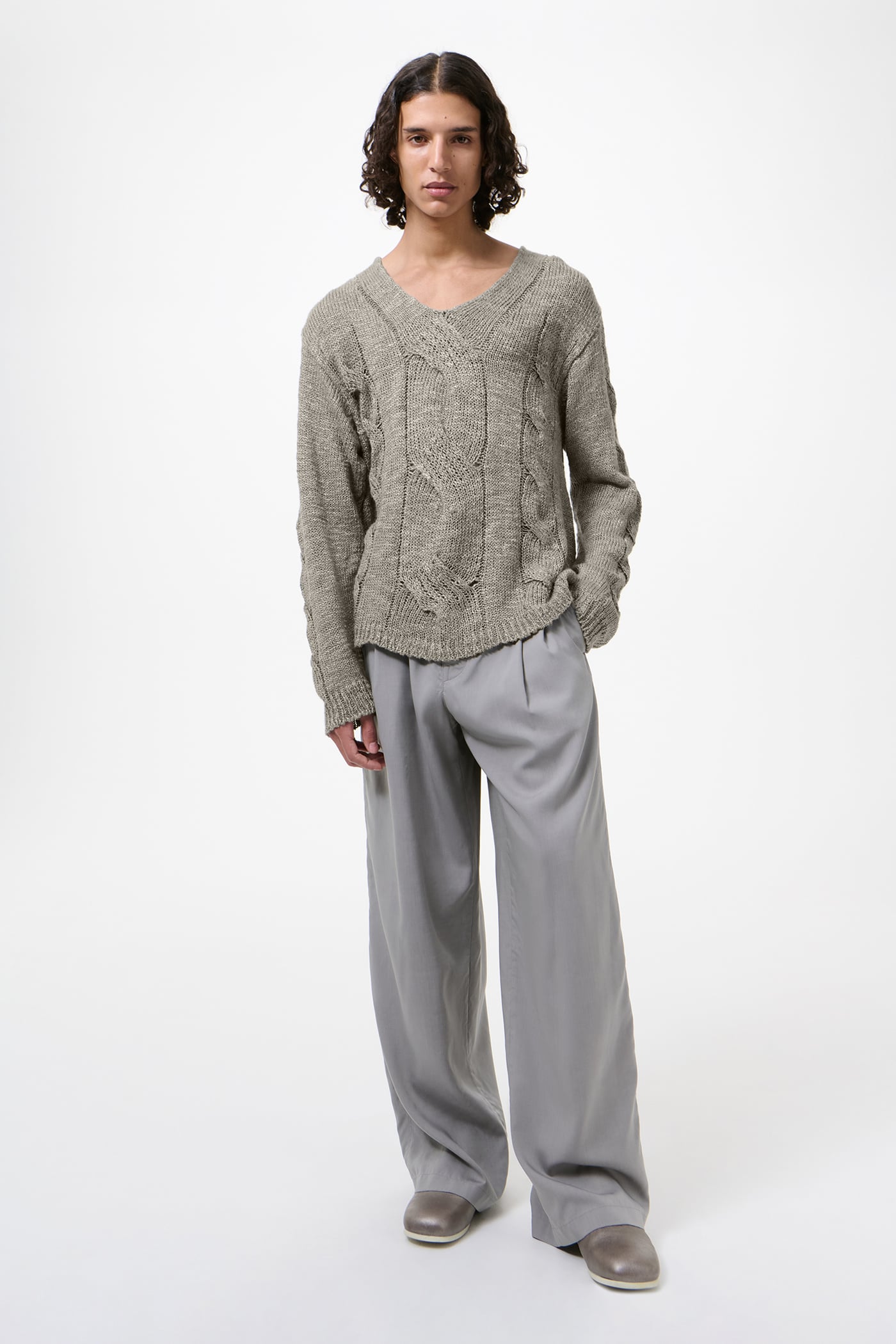 Our Link V-Neck in Tin Shifting Hemp Silk Cable. Produced in Italian hemp and silk yarn, this cable knit V-neck reworks a decorative cable into the neckline and features a wide cable at the front with linked details at the sides and back, finished with 1x1 ribbed cuffs and hem. The yarn lends a soft hand with a rustic sheen.